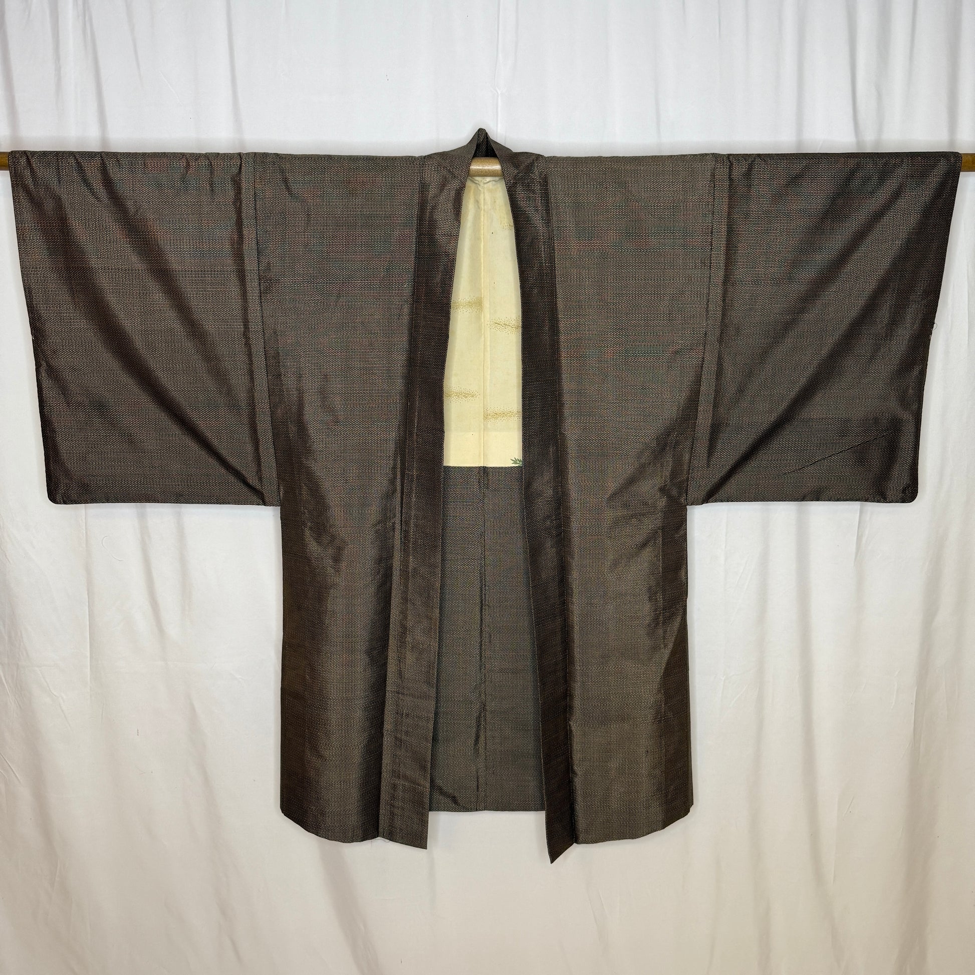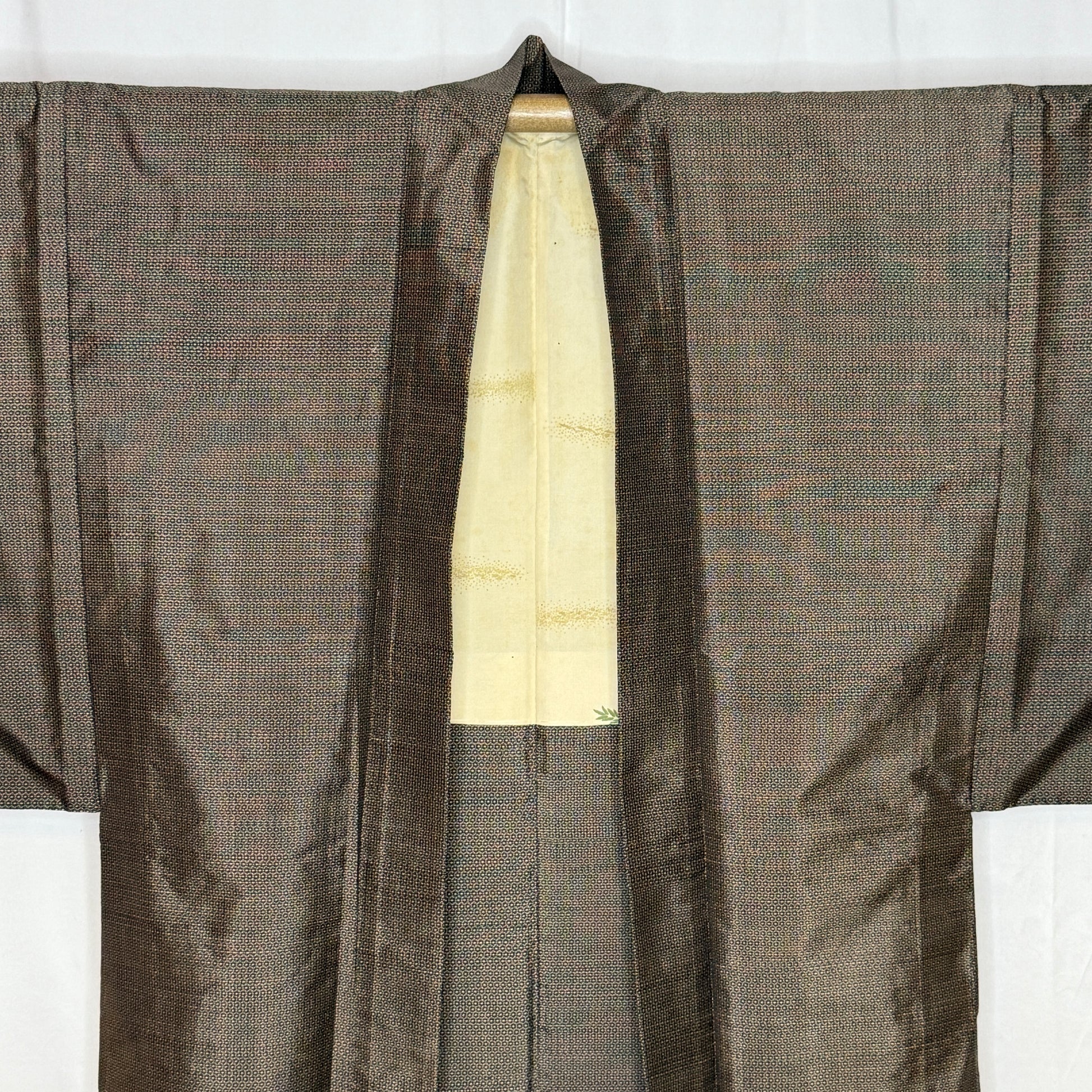 This is a vintage kimono jacket, called a haori, made for a man. The lining of men's haori jackets often depict a scene or motif that was of special interest to the original owner. We often display these jackets inside out to show the lining, and they could be worn this way - inside out - as well; a style that is becoming trendy among Japanese youth. See video below for how haori are worn these days.