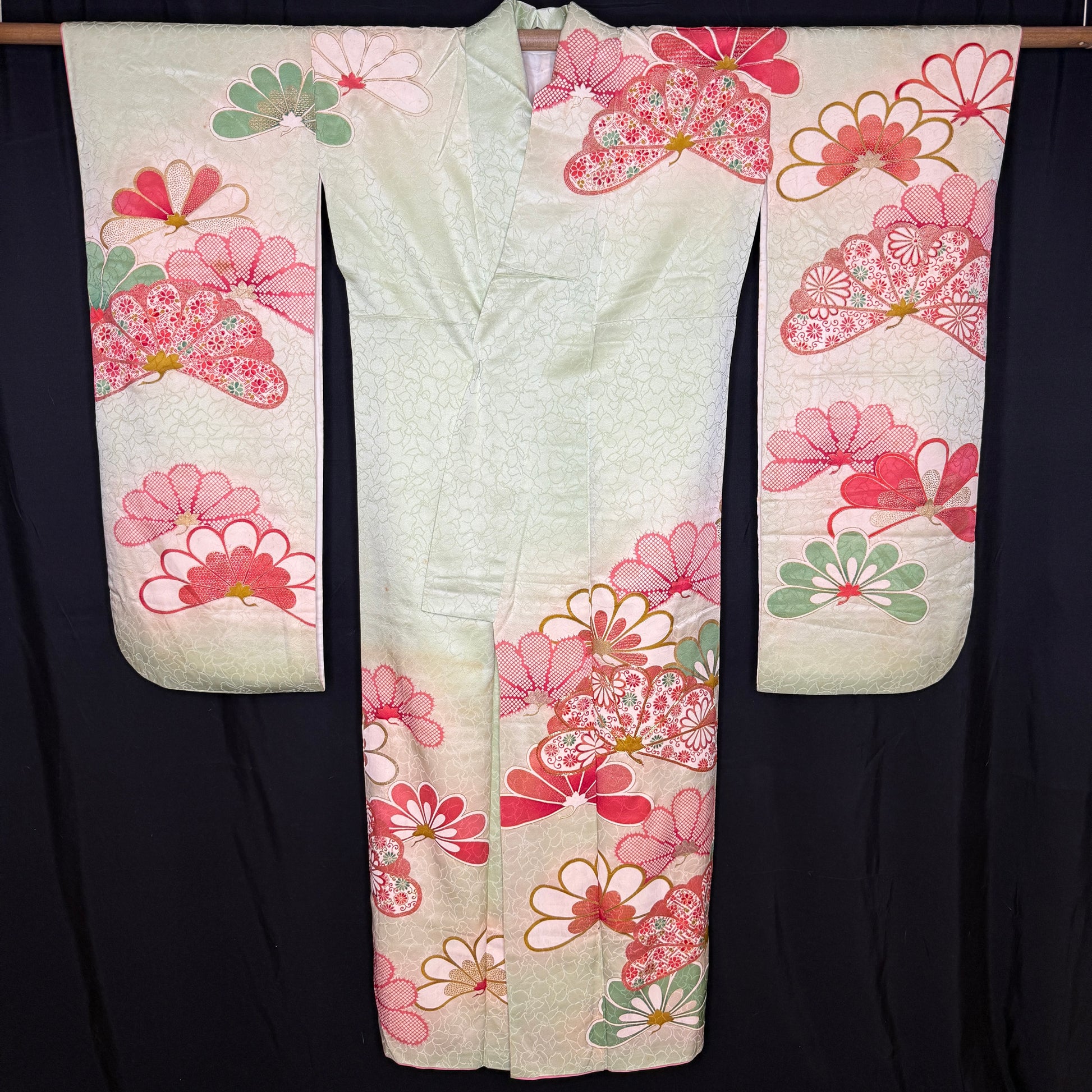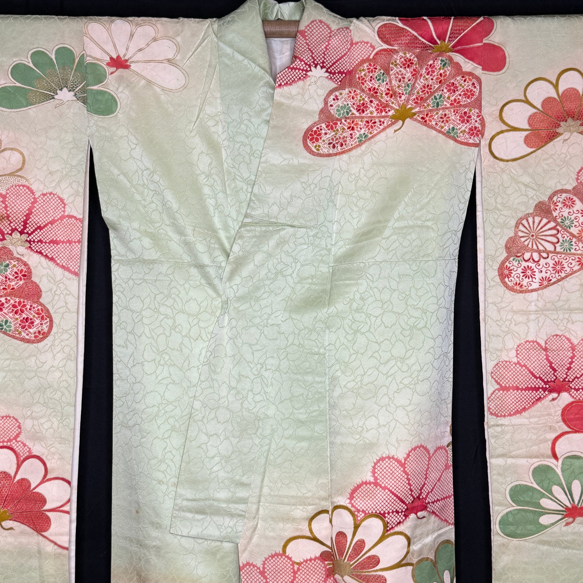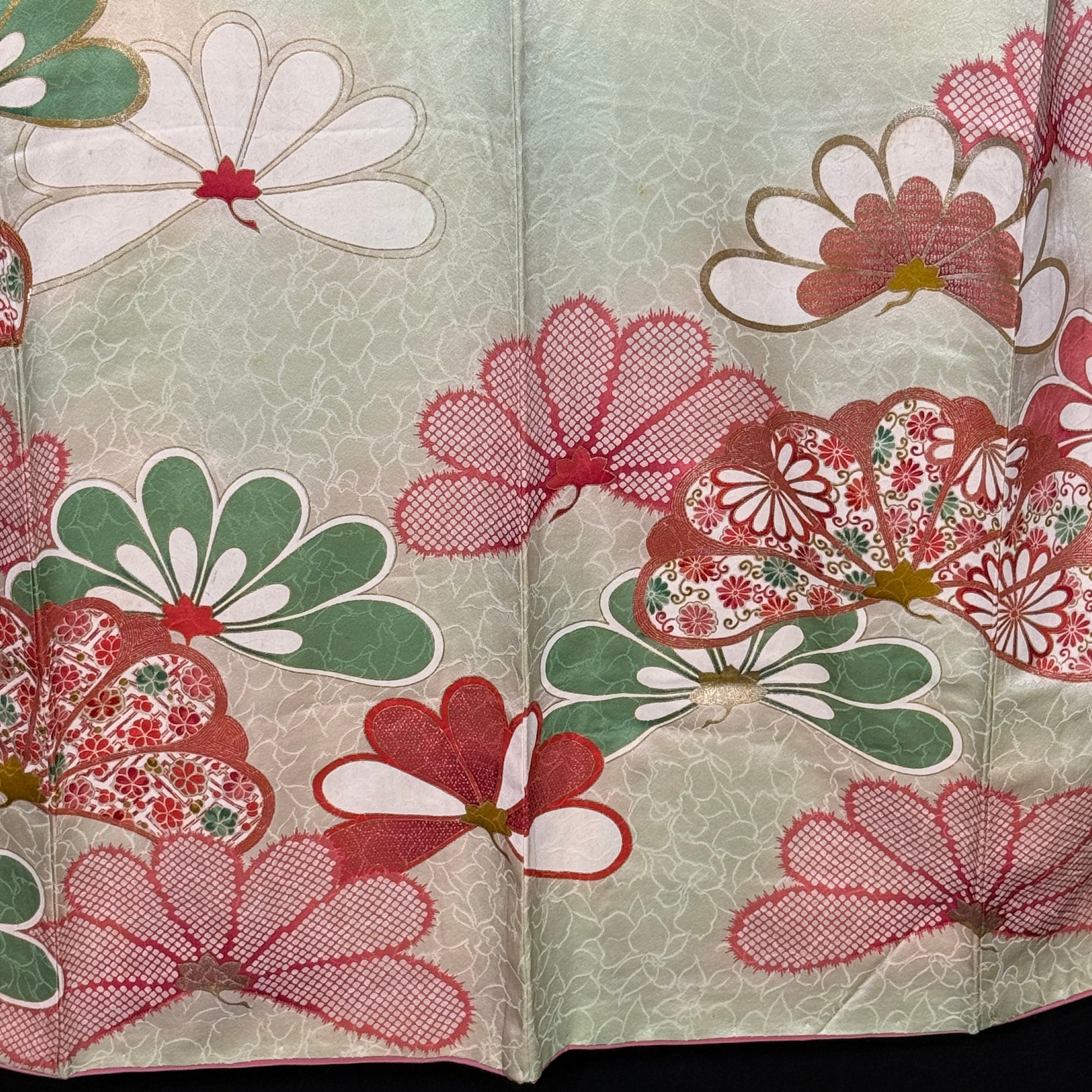 Joyful and richly patterned, this vintage furisode opens with an immediate sense of celebration, its soft cream and pale green background are a subtle backdrop to sweeping florals in red, pink, and fresh green. Large blossoms open across the silk, each filled with intricate internal patterns, delicate textures, and touches of gold leaf and couching that add depth and shimmer. The floral jacquard background enhances the layered design, giving the kimono a lively yet balanced rhythm that feels both playful and formal.