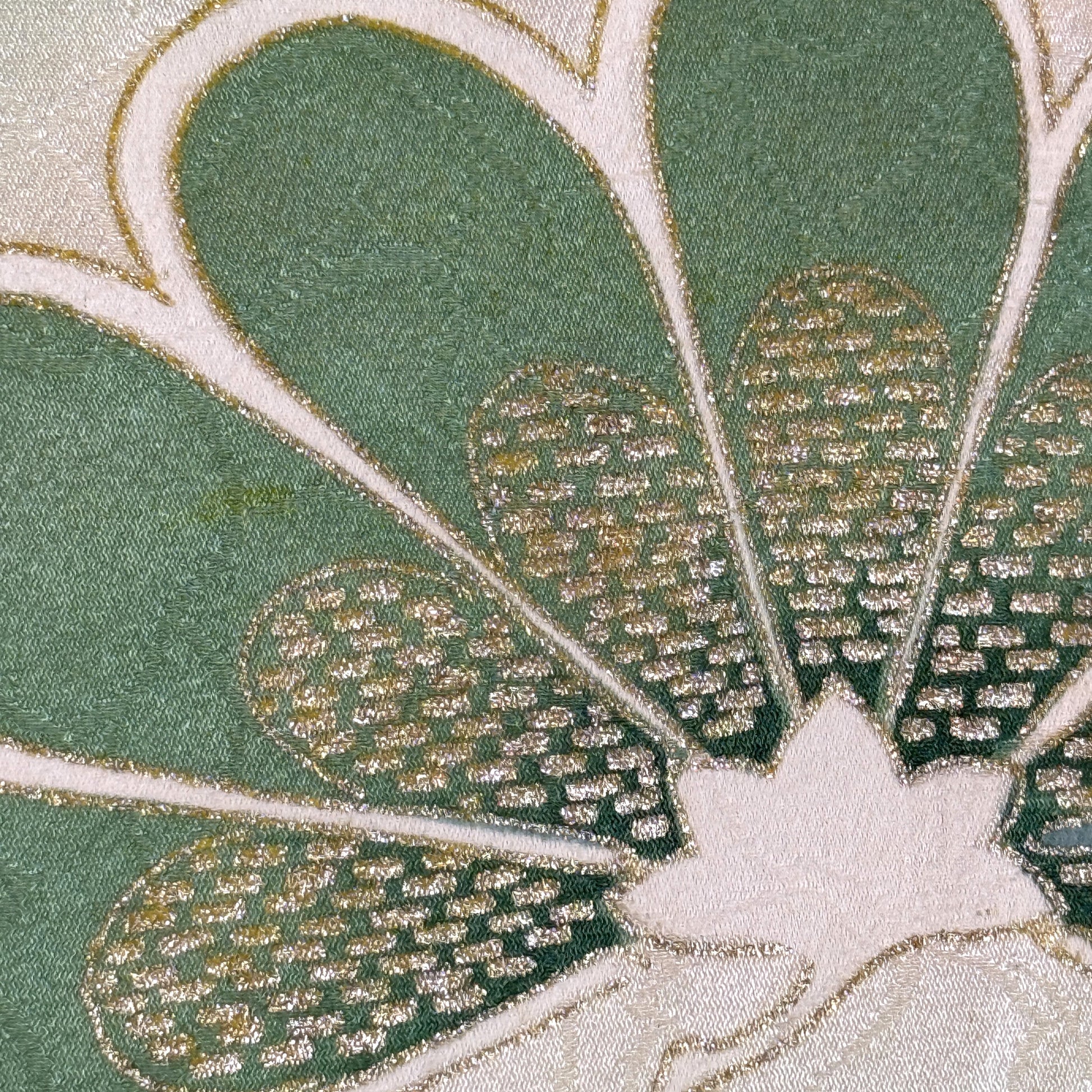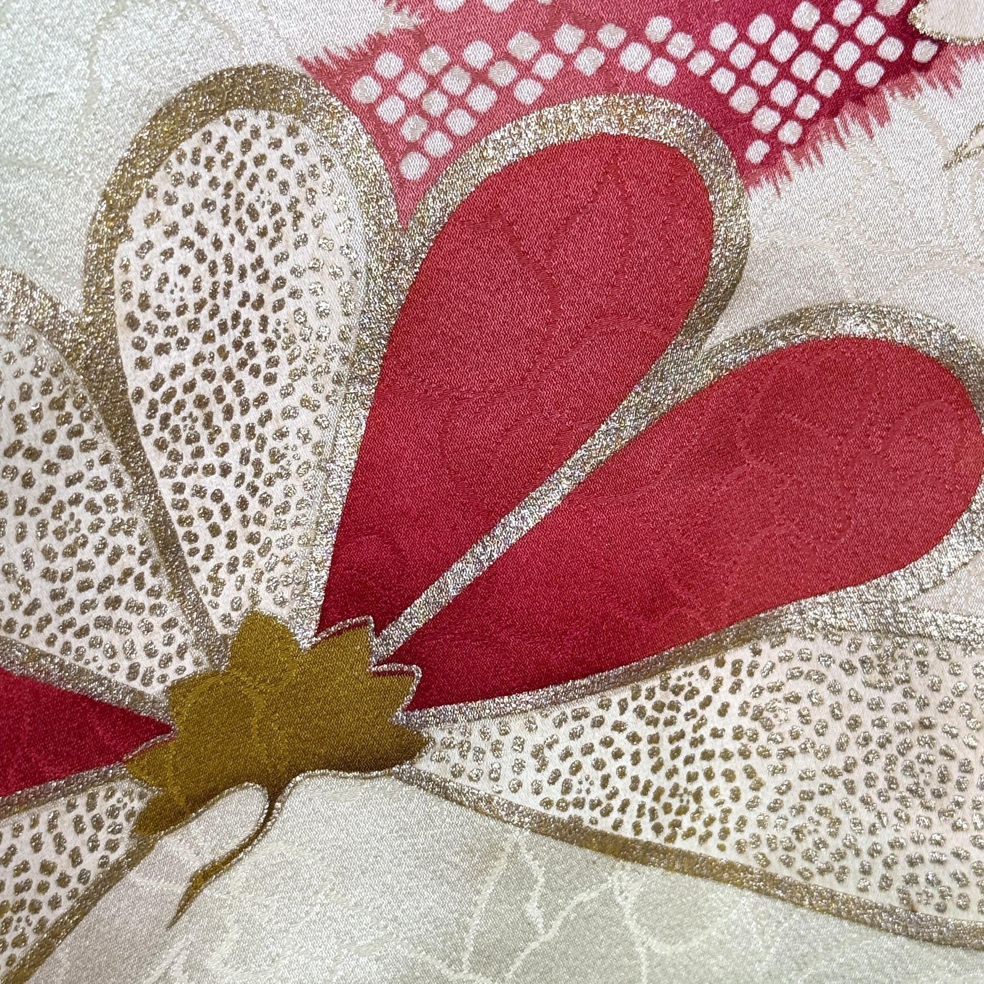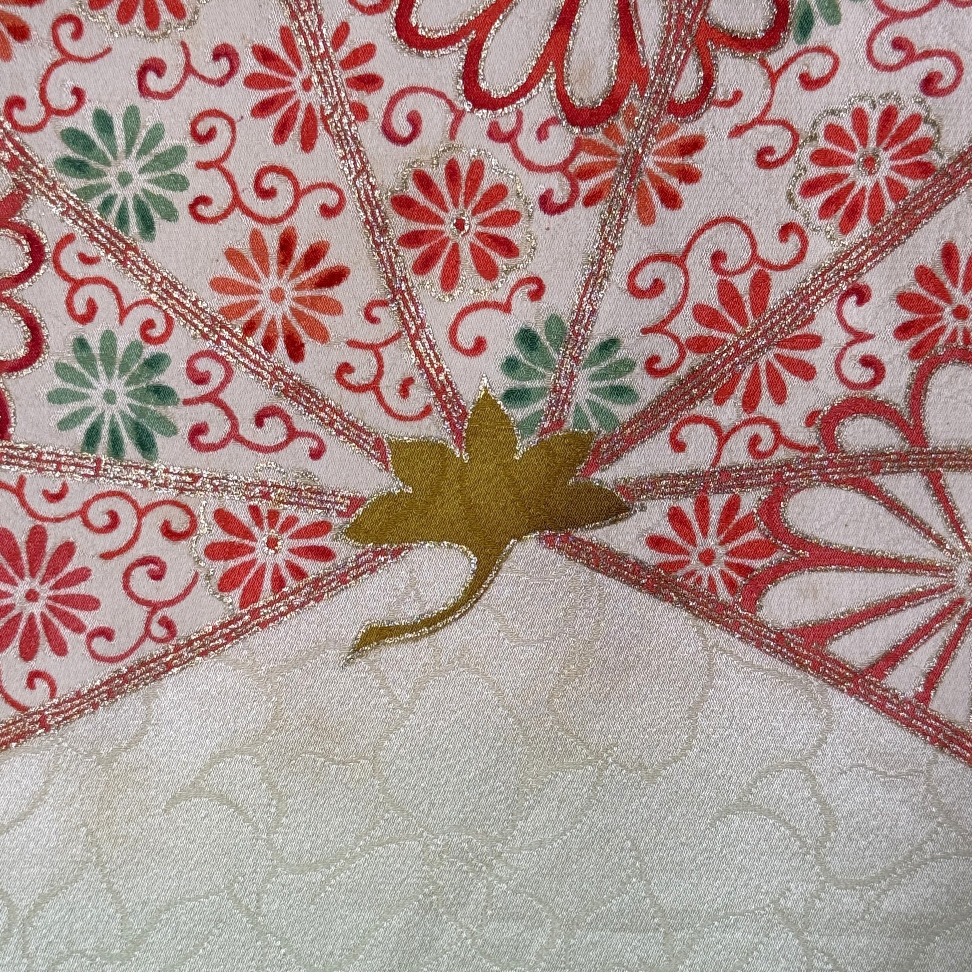 Joyful and richly patterned, this vintage furisode opens with an immediate sense of celebration, its soft cream and pale green background are a subtle backdrop to sweeping florals in red, pink, and fresh green. Large blossoms open across the silk, each filled with intricate internal patterns, delicate textures, and touches of gold leaf and couching that add depth and shimmer. The floral jacquard background enhances the layered design, giving the kimono a lively yet balanced rhythm that feels both playful and formal.