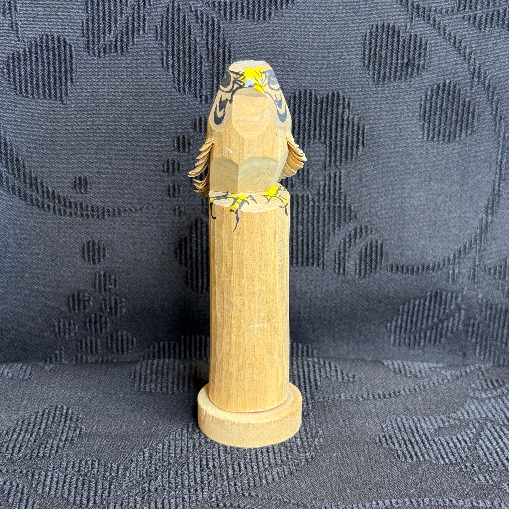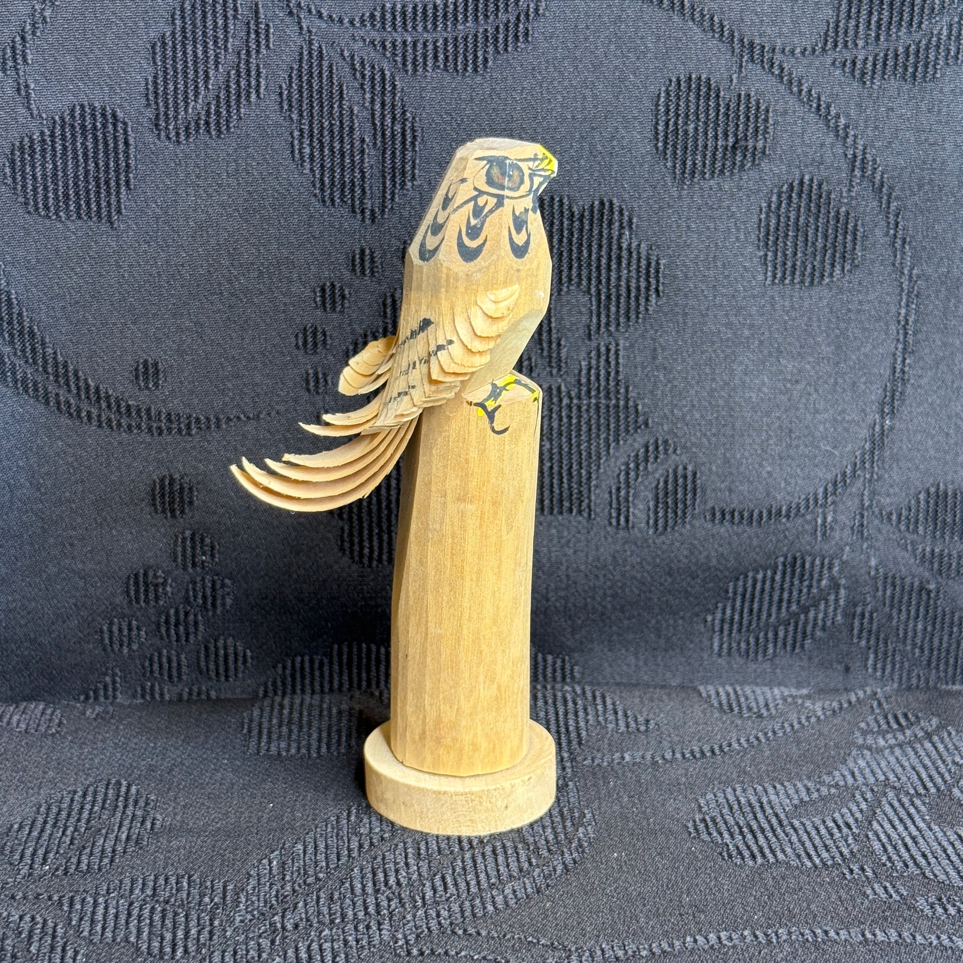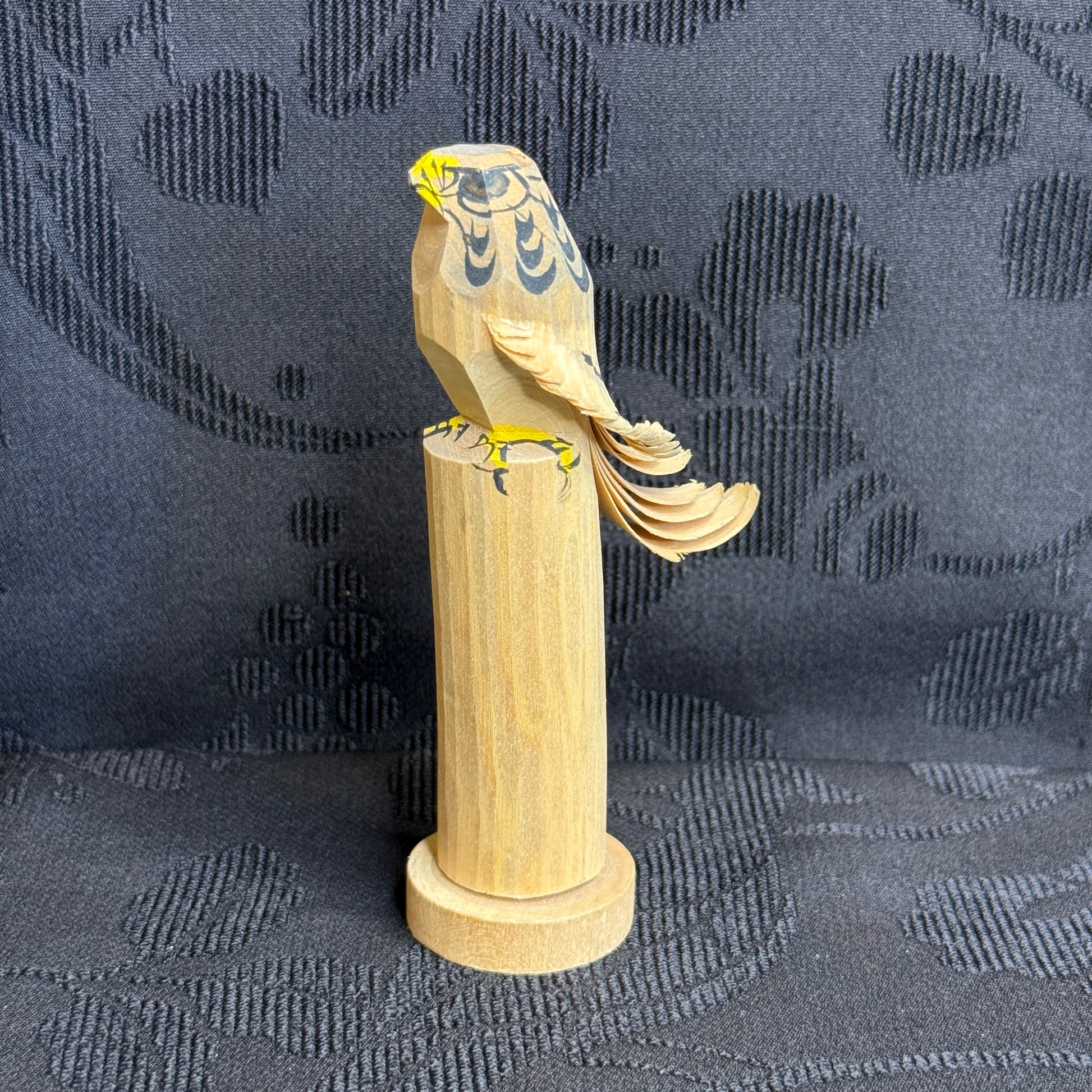 This handmade Japanese falcon carving captures motion and elegance in a single stroke. It is perched on a tall wooden column with delicately layered tail feathers that fan out in soft curves. The crisp knife cuts and painted accents created expressive eyes, bold wing markings, and bright yellow talons.