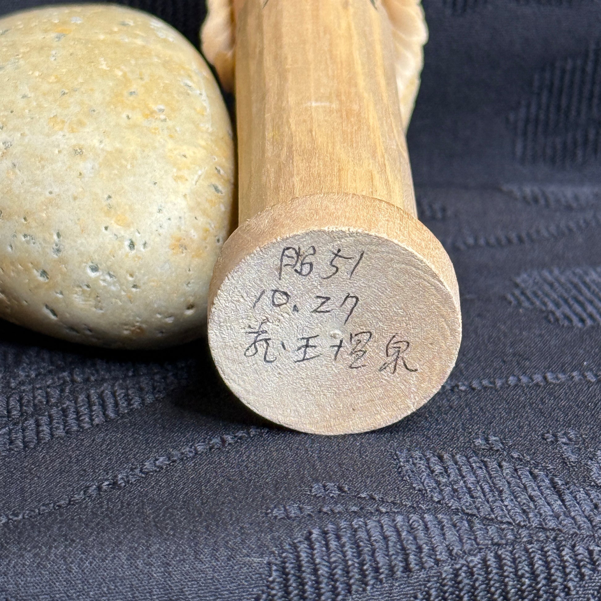The underside is handwritten with characters translating to Yuzawa Onsen, suggesting it was purchased as a souvenir from a mountain hot spring town known for folk craft.