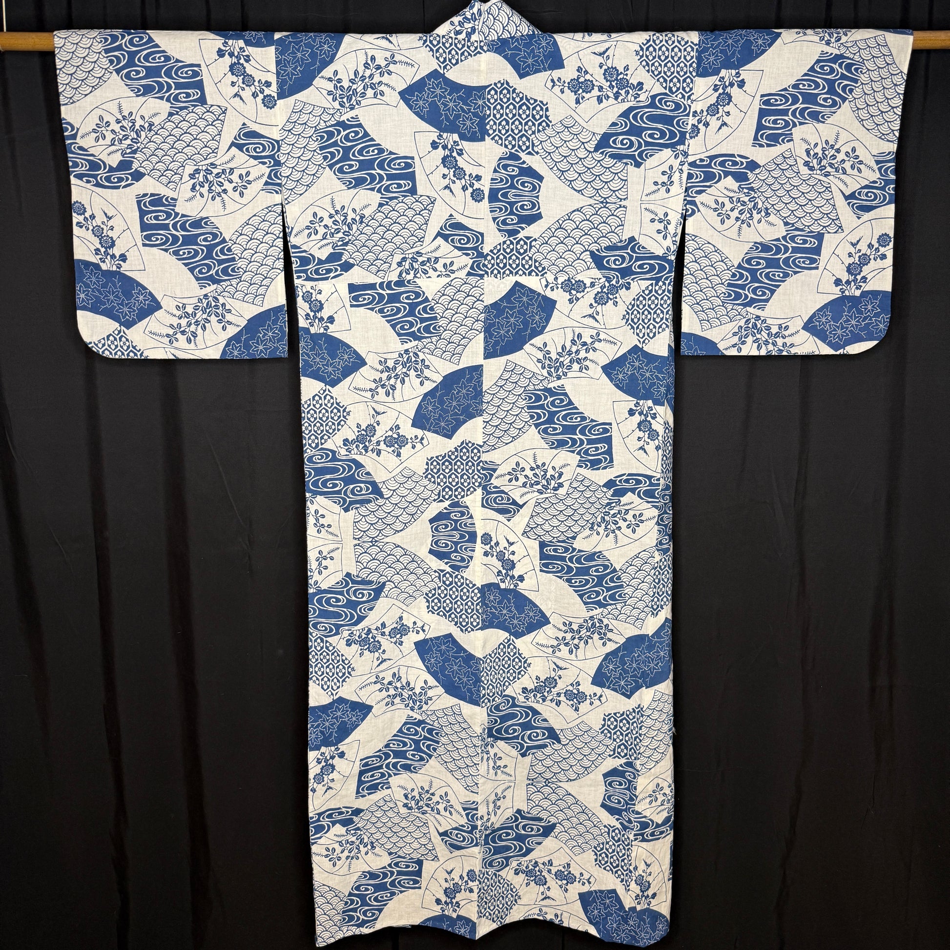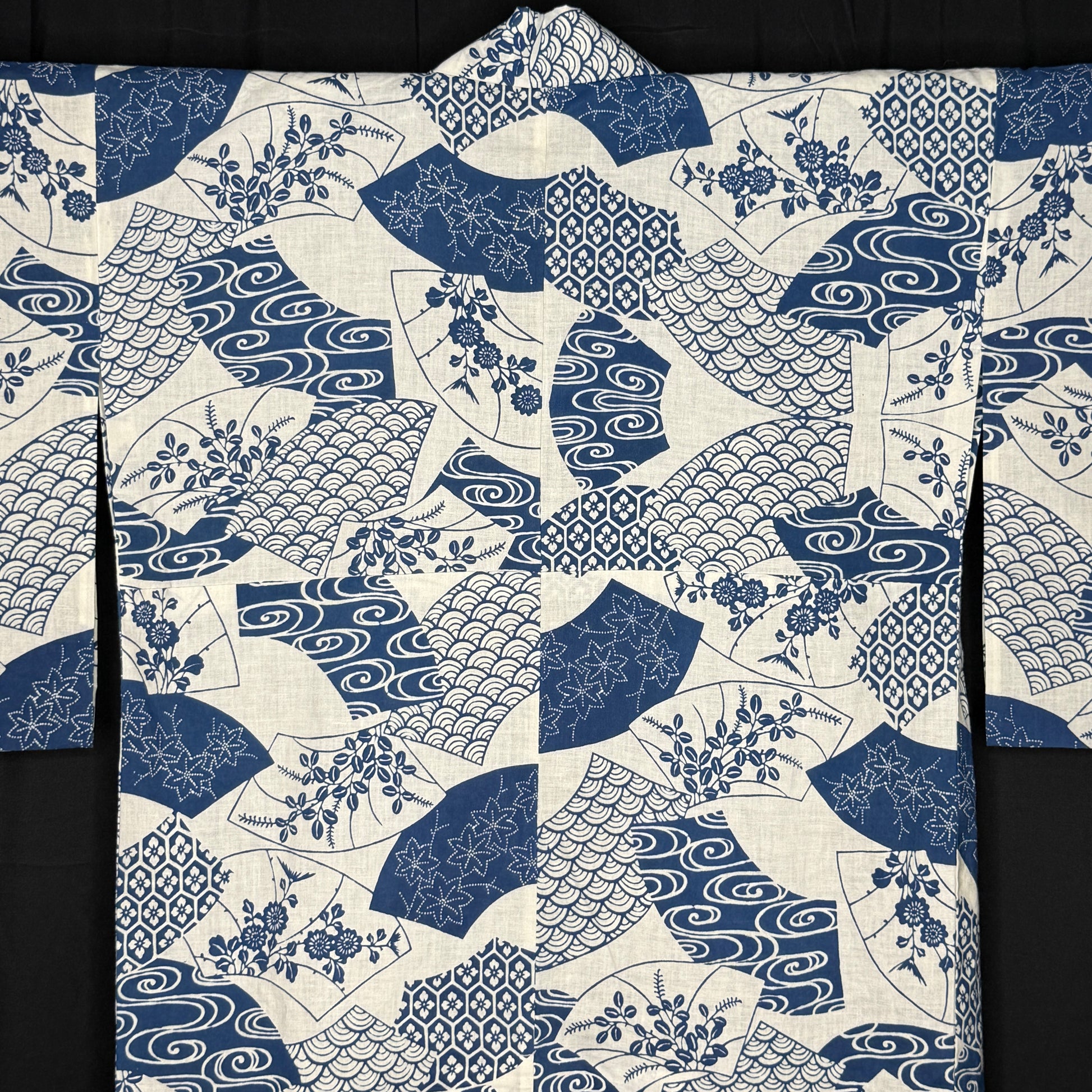 This vintage cotton yukata is a joyful collage of folding fans, each one filled with classic Japanese motifs like seigaiha (overlapping waves), blossoms, tortoise shells, and gentle river curls. The allover pattern feels lively and rhythmic, shifting from one fan to the next like a breeze turning pages in a storybook. A medium blue hue and soft white keep it light and summery.