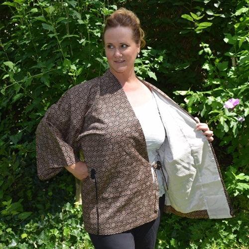 This is a dochugi style jacket, which crosses over in the kimono style (unlike the haori style which hangs open in the front). But instead of needing an obi, it closes with inner and outer ties, which can be tied loosely to allow for a more generous fit. Where haori are best for up to a size 12, dochugi can fit up to a size 16+.