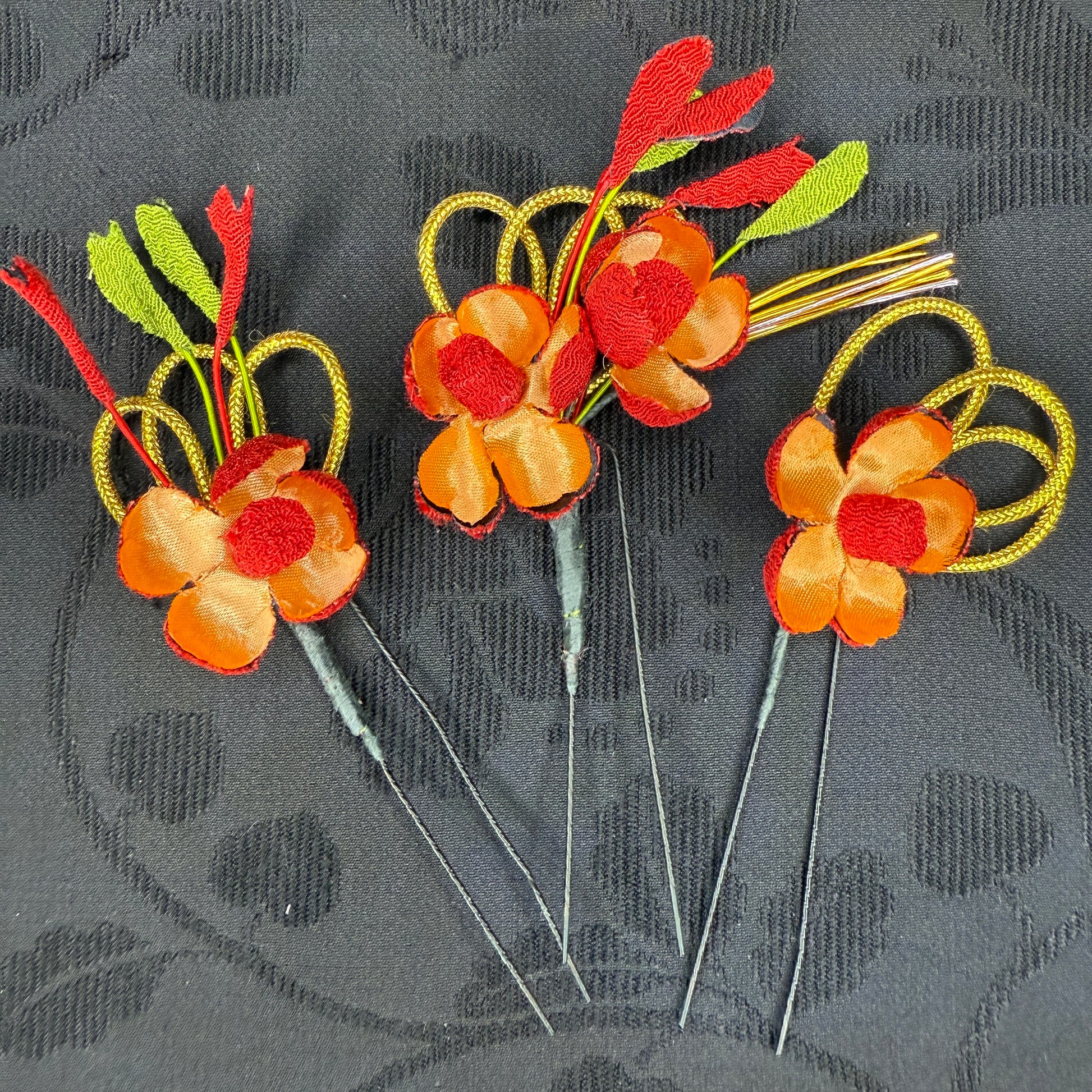 Vivid and full of fire, this trio of vintage Japanese kanzashi hair pins showcases the blaze of autumn in bloom. Each pin features petals of red and orange fabric with contrasting textures, accented by golden mizuhiki loops and sprigs of green and crimson. The interplay of fiery hues suggests turning maple leaves under the glow of festival lanterns.