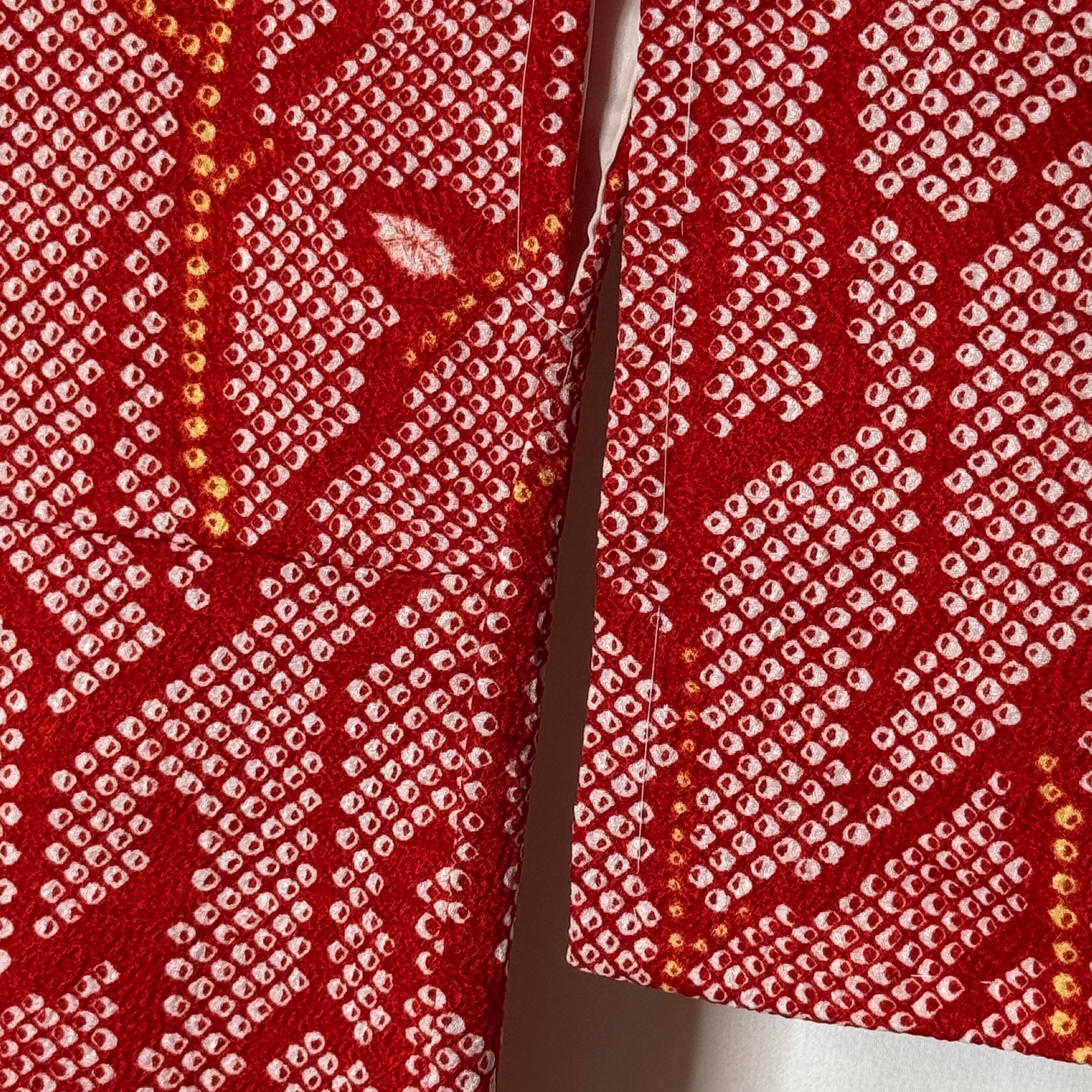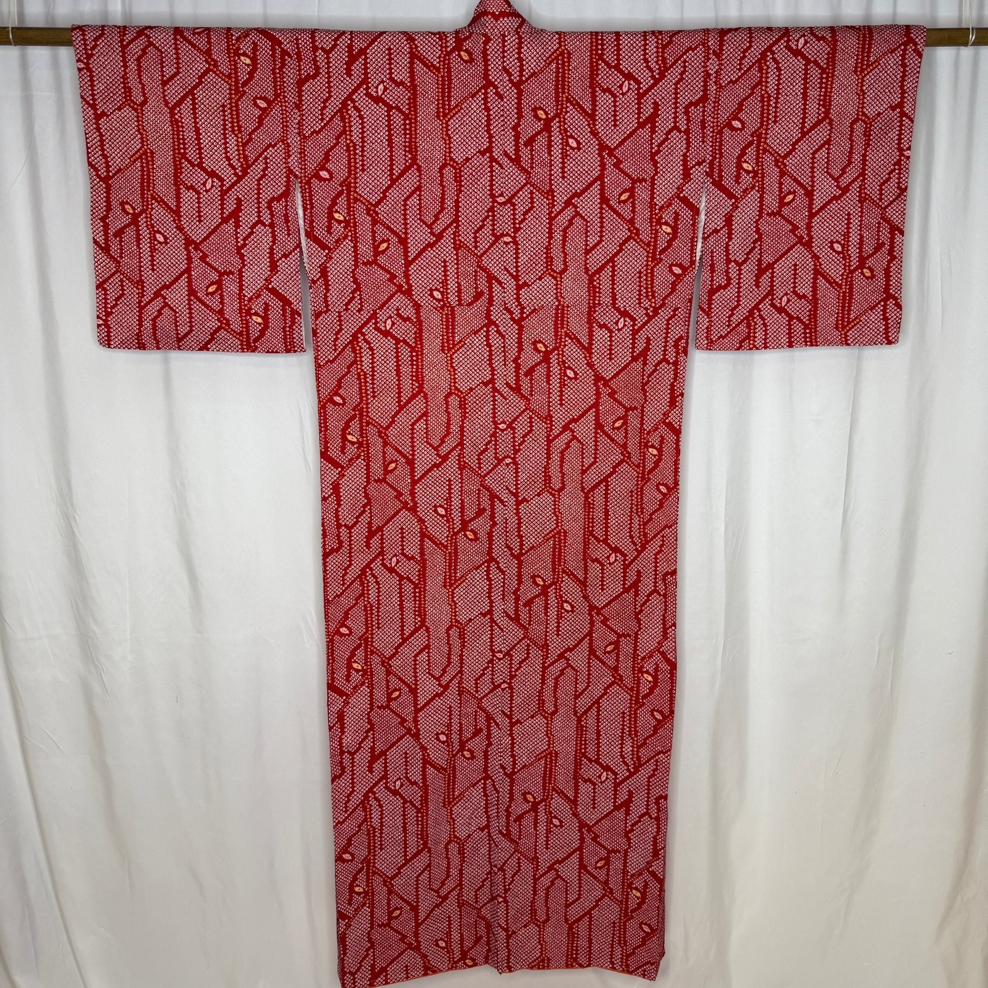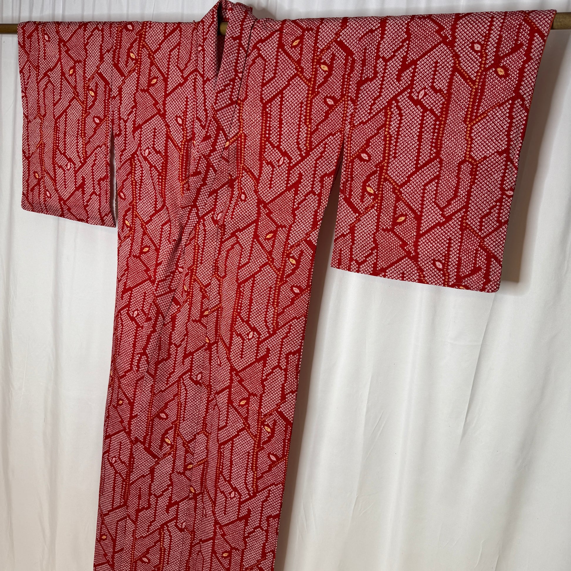 Bold, graphic, and full of festive energy, this vintage women's kimono brings instant impact with its vivid red palette and stenciled shibori style design that mimics the look of tied resist dyeing. The branching geometric pattern is dotted with little pops of warm gold, adding a holiday touch while keeping the overall feel modern and playful.