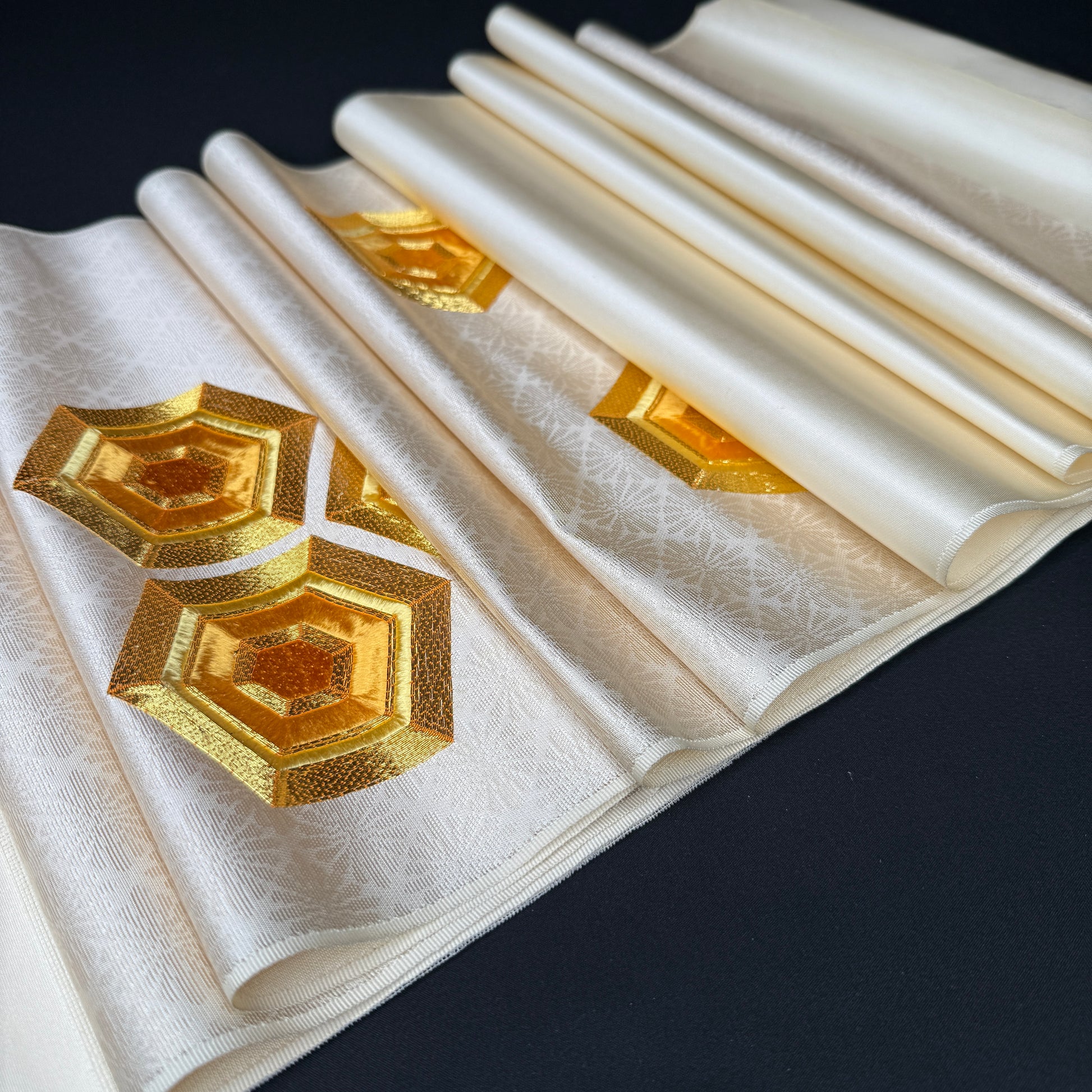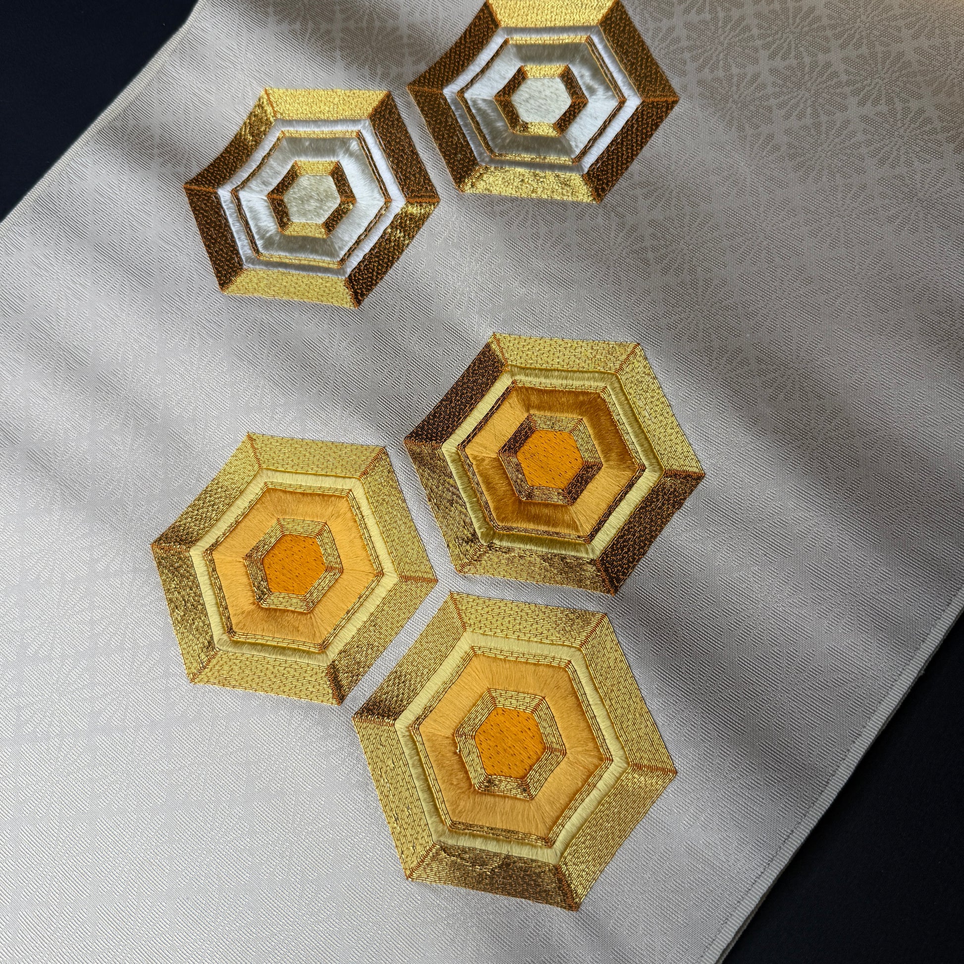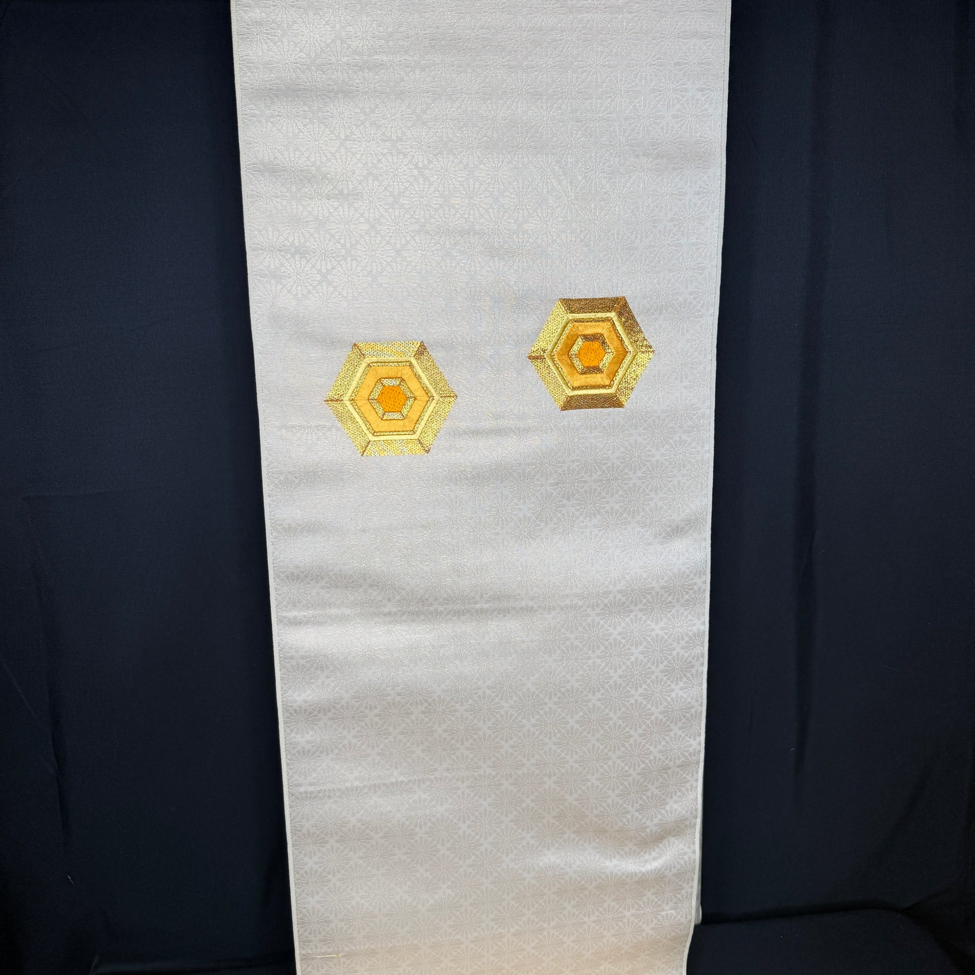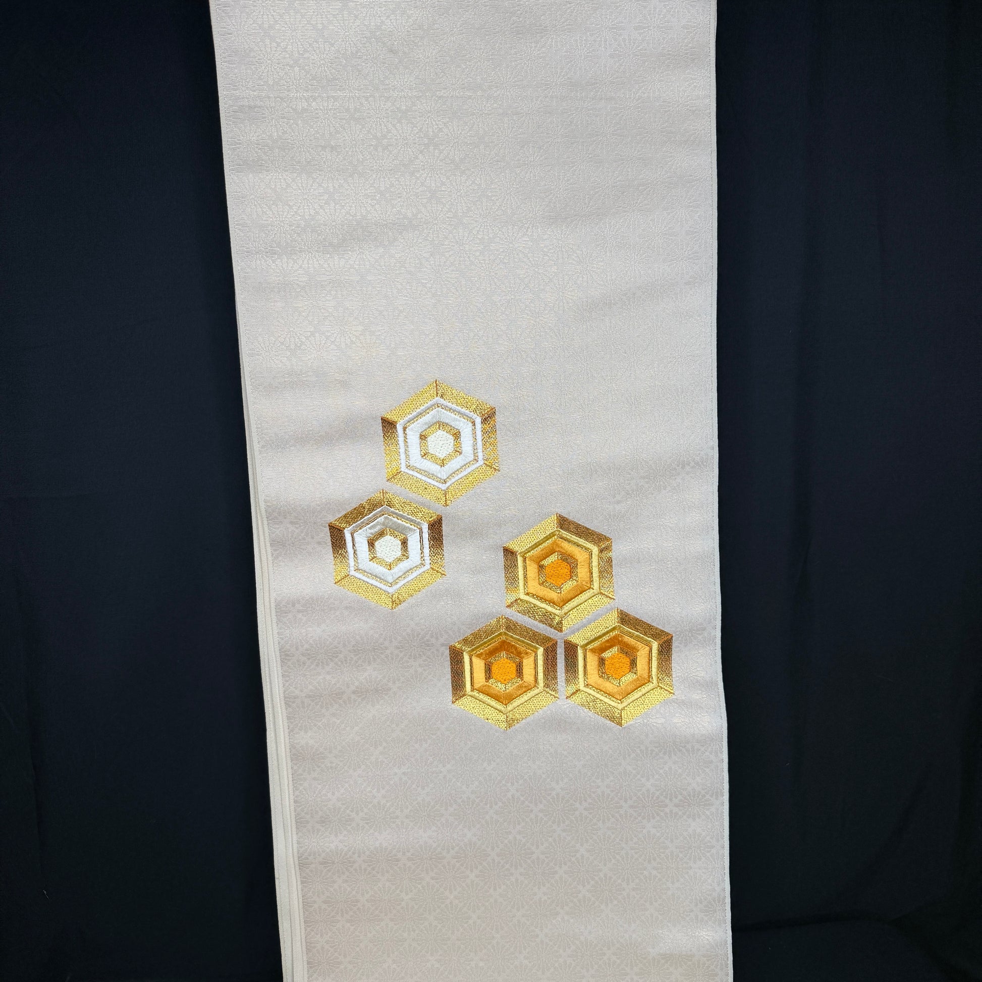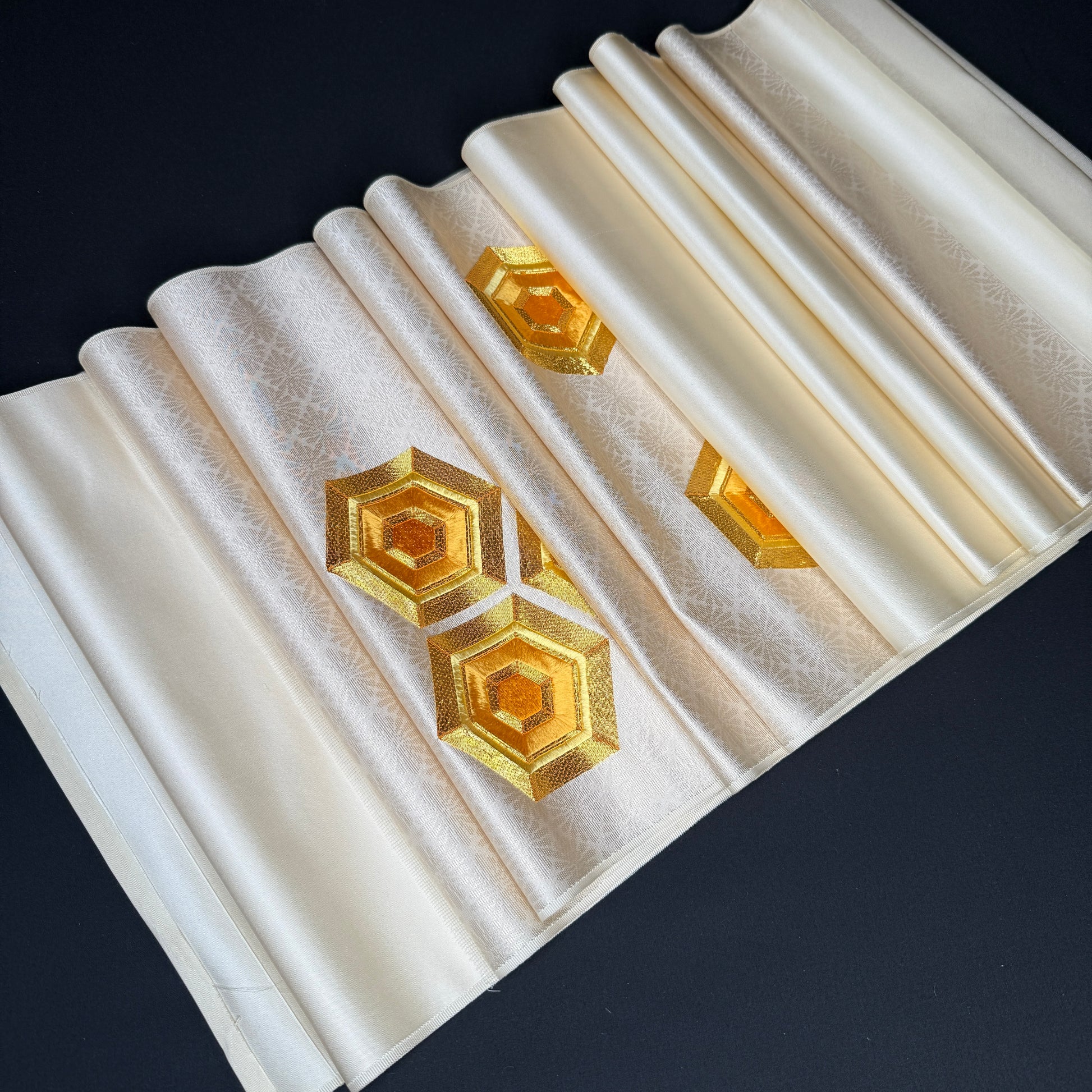 This bolt is laid out in the traditional nagoya obi format: 45" of plain fabric that would be the backside of the obi, followed by an 80" jacquard section, then 50" of plain fabric, and then another 8" jacquard section. The patterned hexagons are two sections: 11" and 5", both with the floral jacquard background.