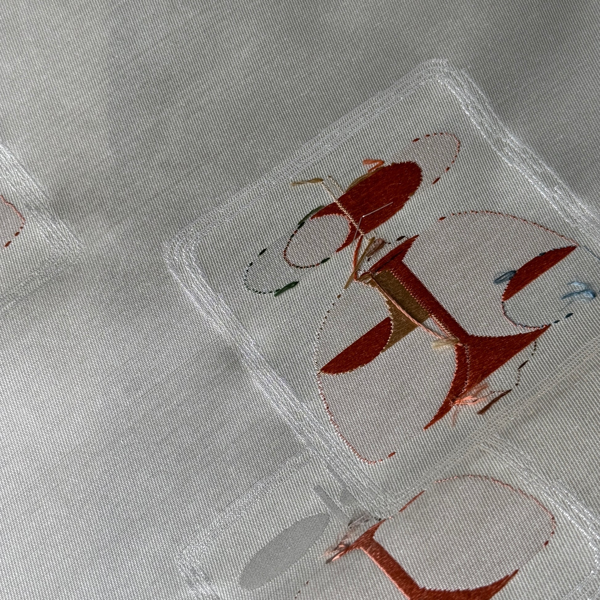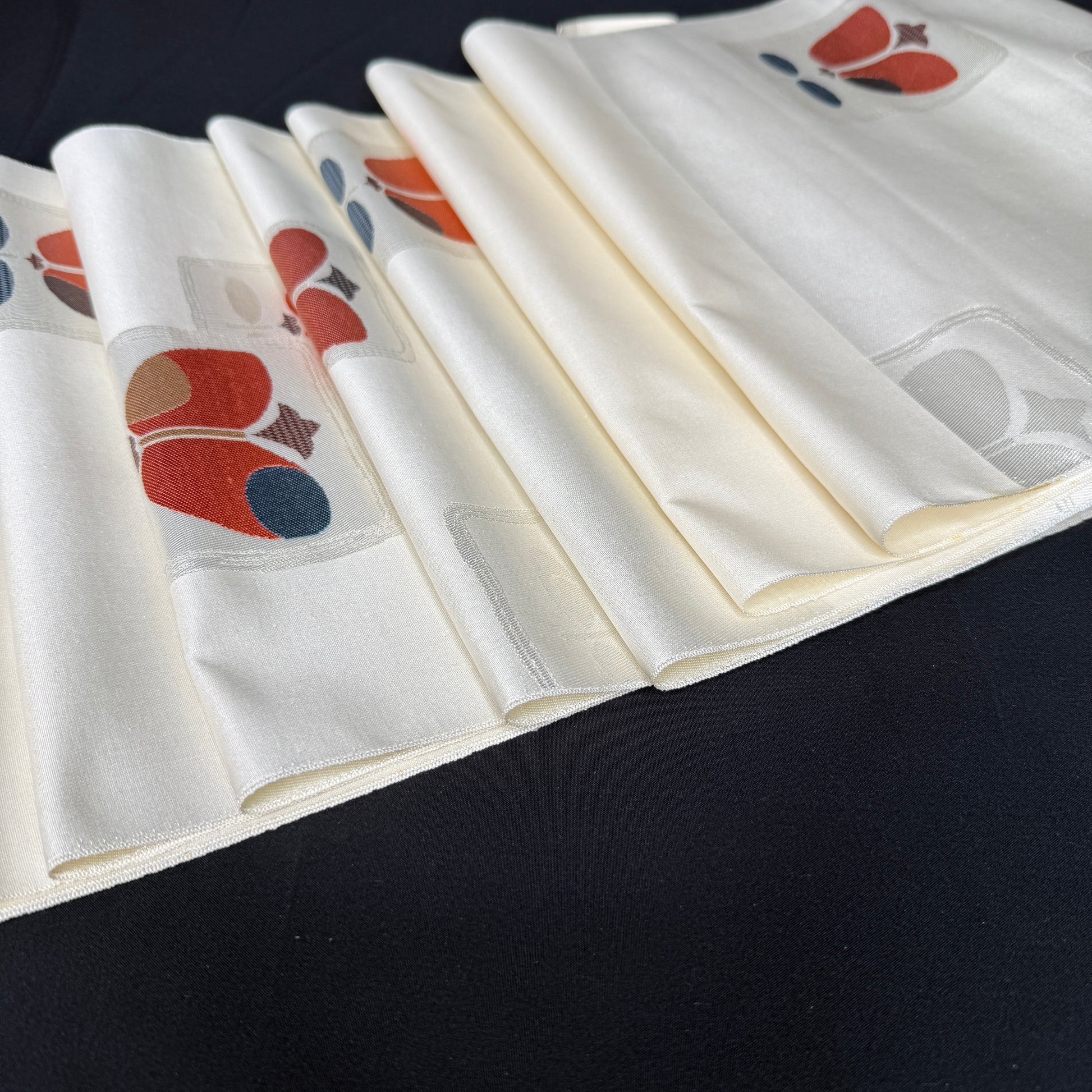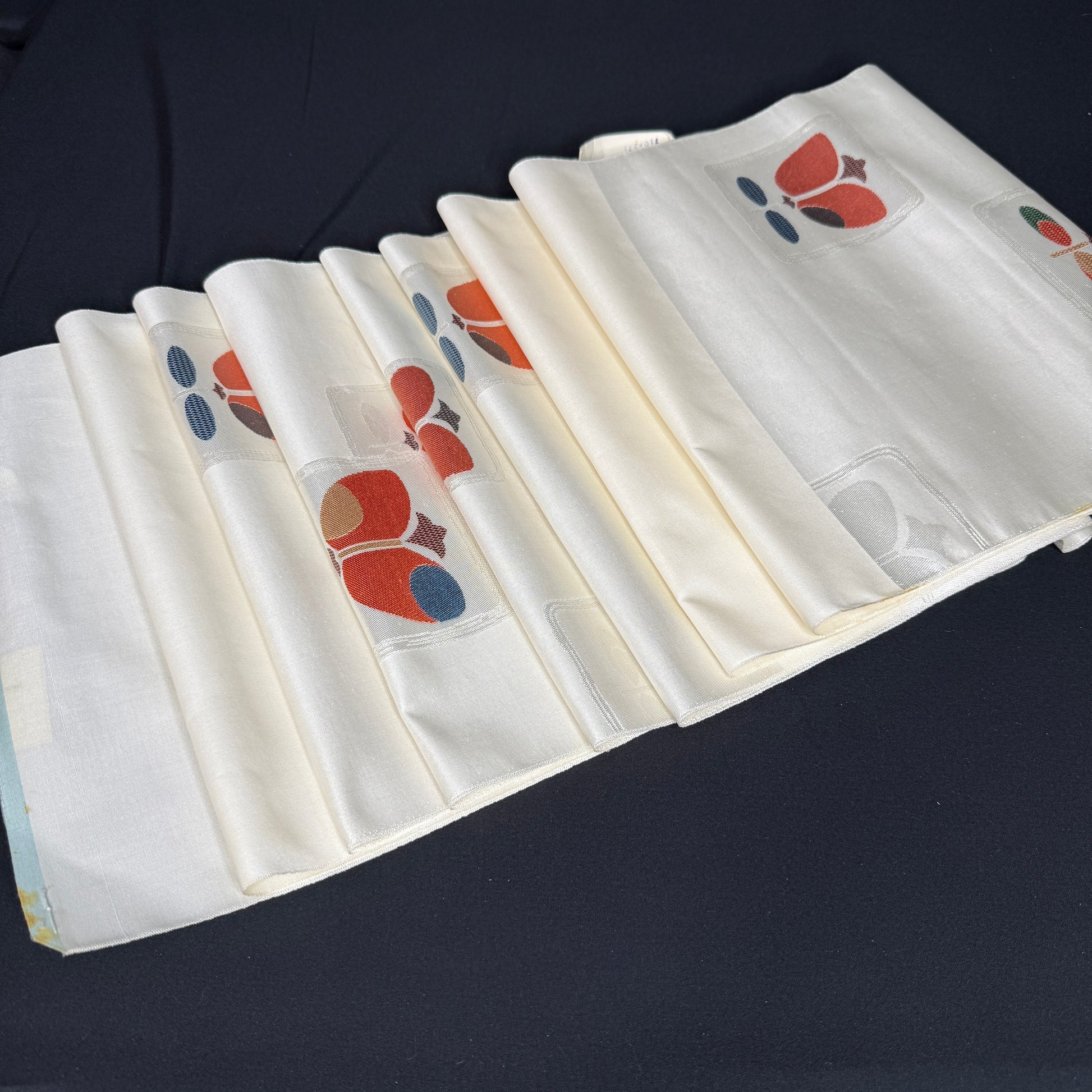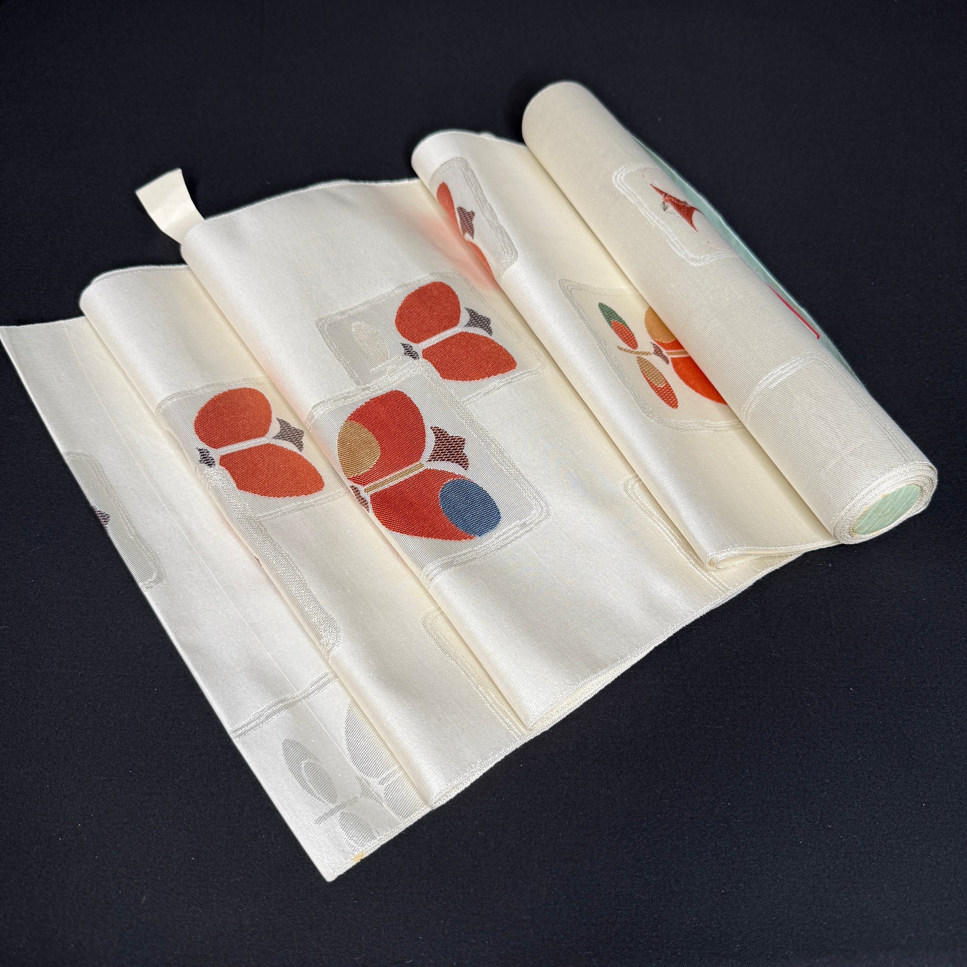 This full bolt is 5 yards long with alternating solid and patterned sections: 46 inches of solid cream which would have been sewn as the backside, then 84 inches of the repeated pattern, then 47 inches of more solid cream that would be hidden as an underlayer when the obi was wrapped. At the very end is another 14 inches of pattern that would be part of the bow when tied.
