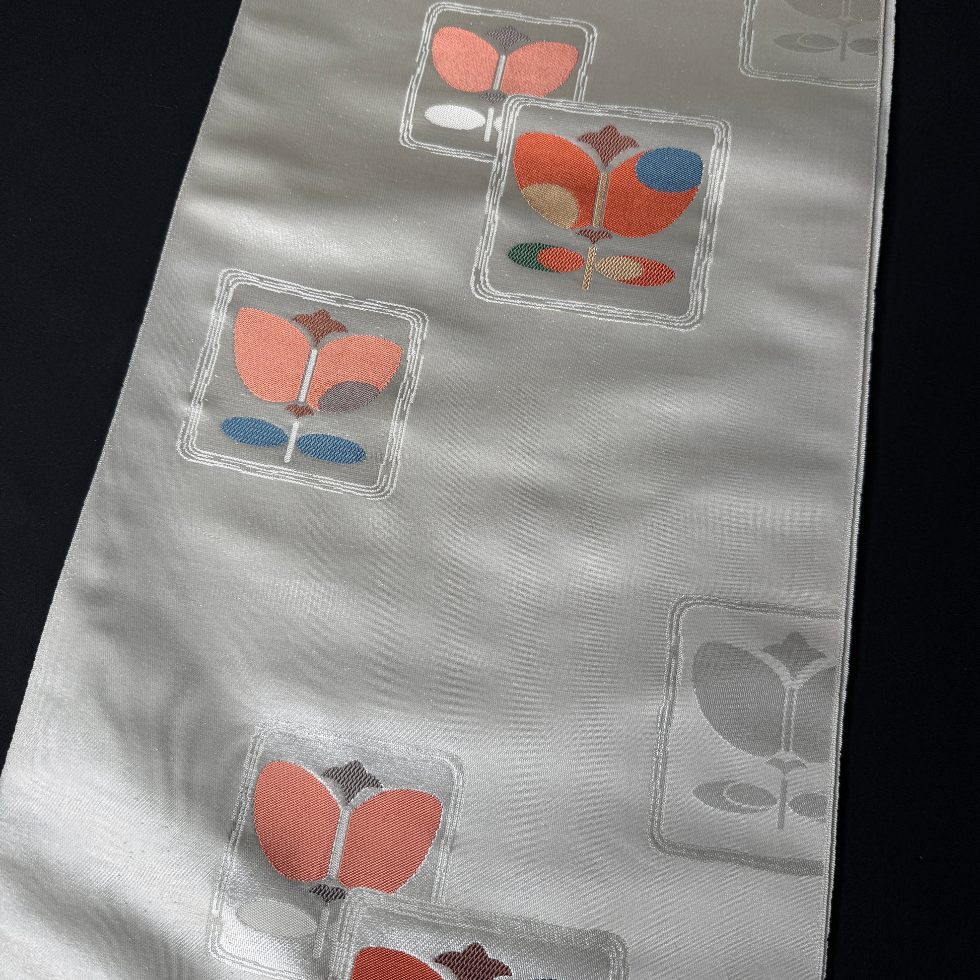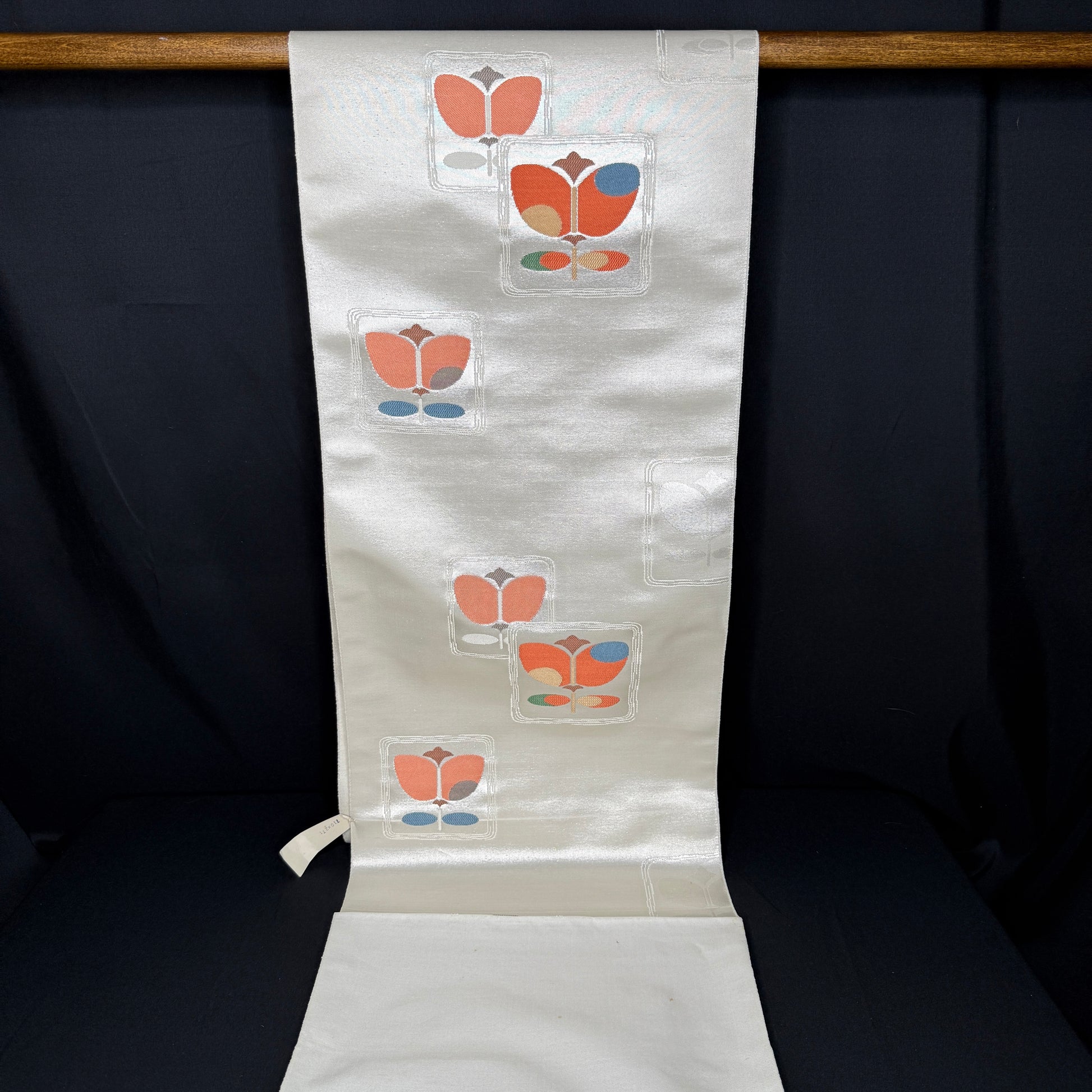 The woven, blocky design includes chunky-shaped florals framed in silver blocks. Retro colors on lovely cream silk.