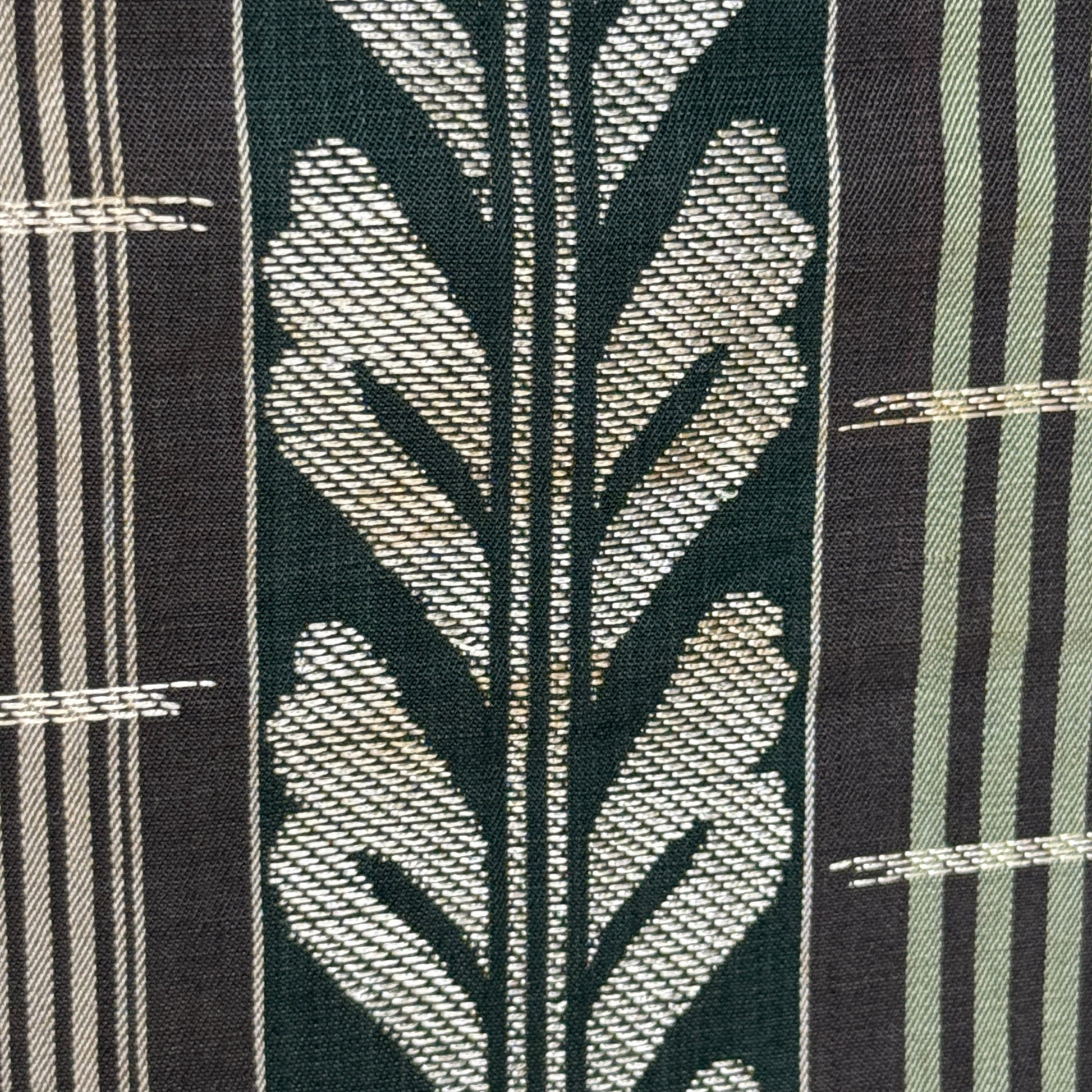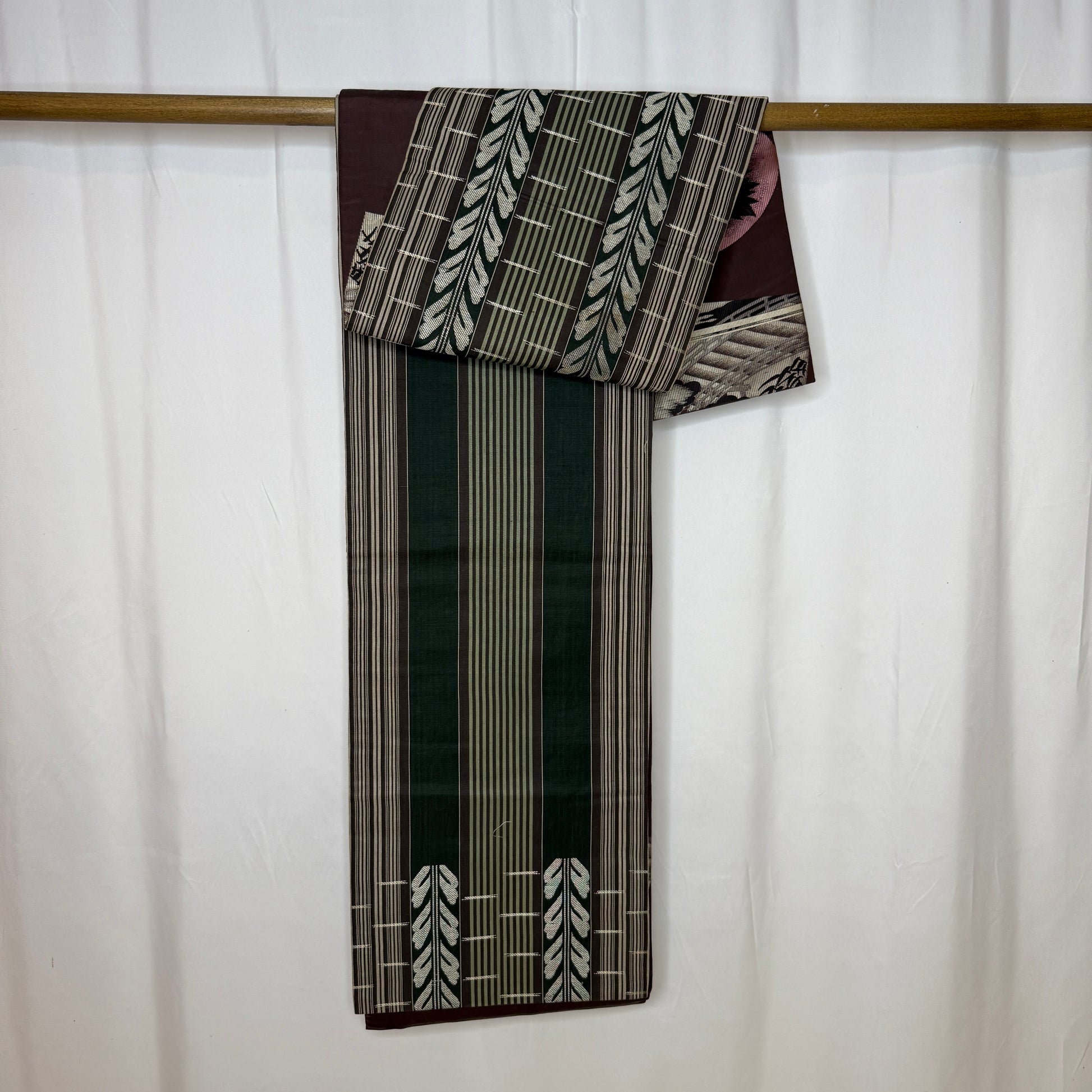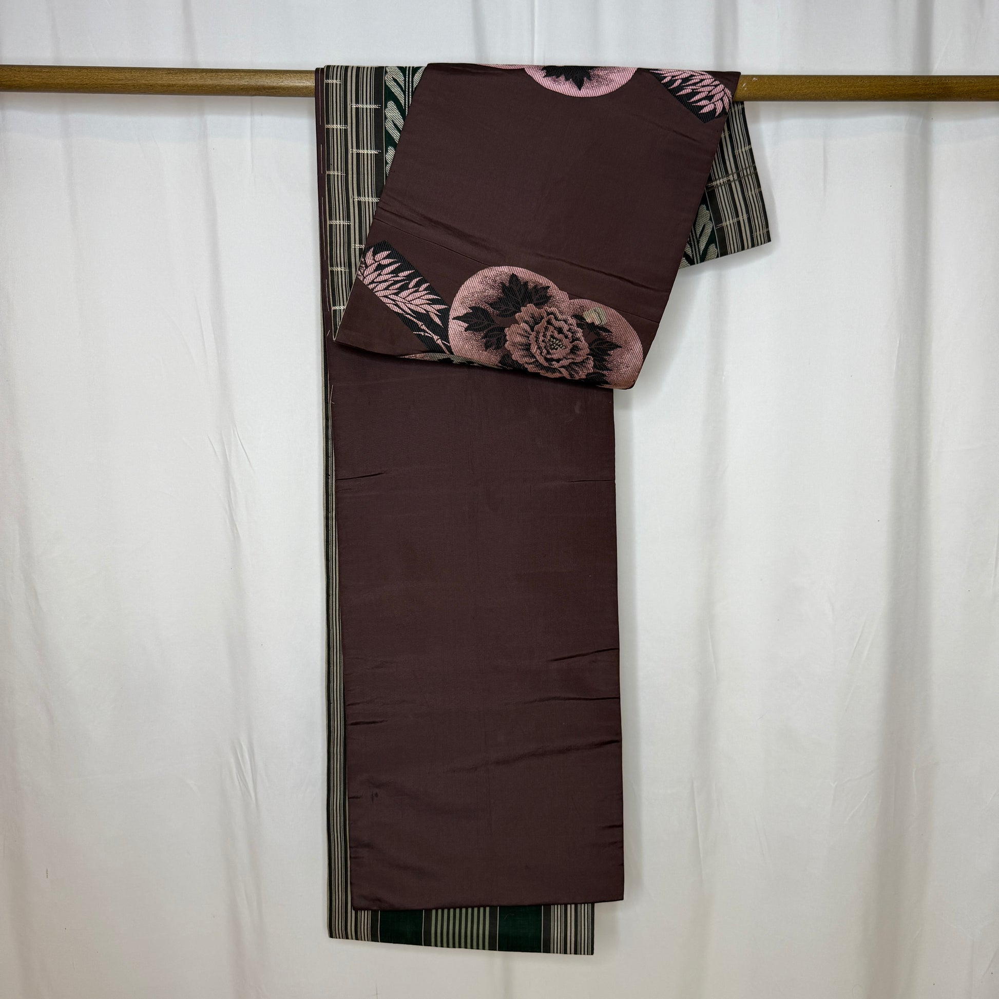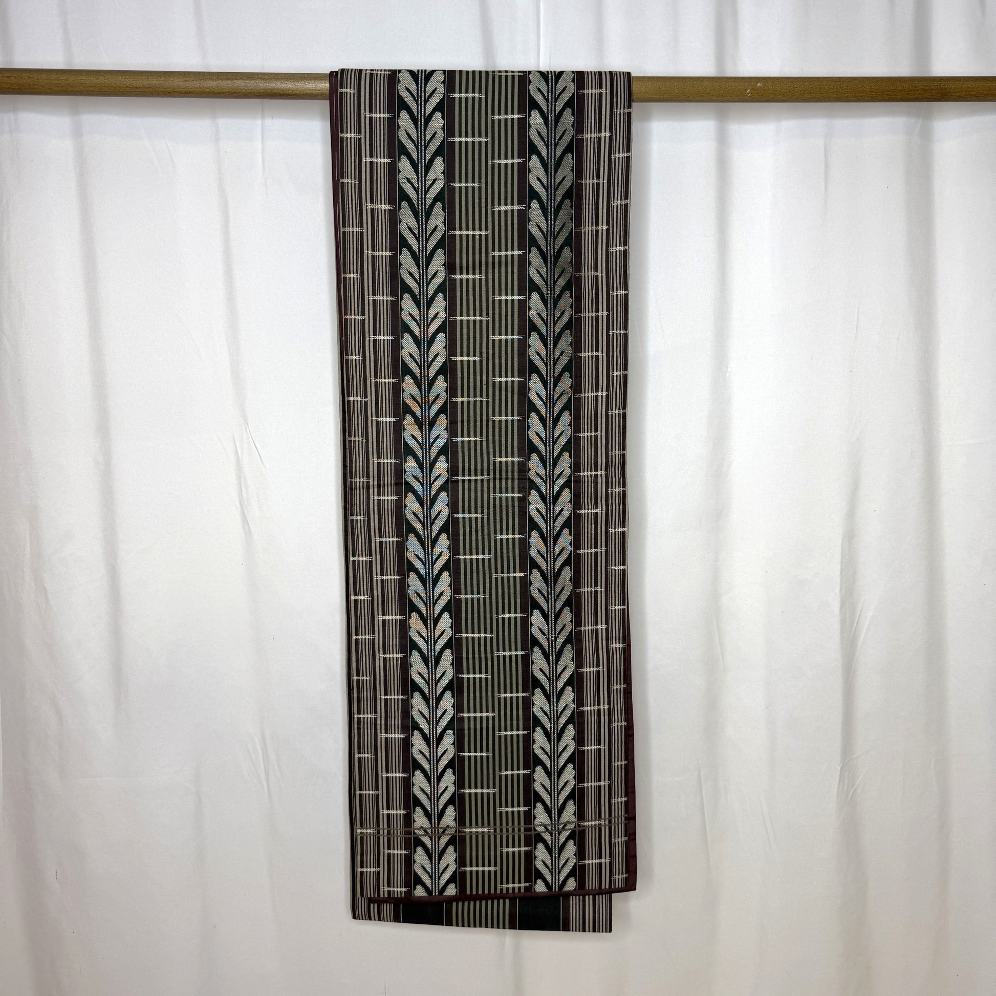 This vintage chuya obi is a captivating piece that balances refined structure with floral romance. One side features a fence and vine motif in earthy tones of deep eggplant, sage, and silver, giving it a stately, architectural elegance.