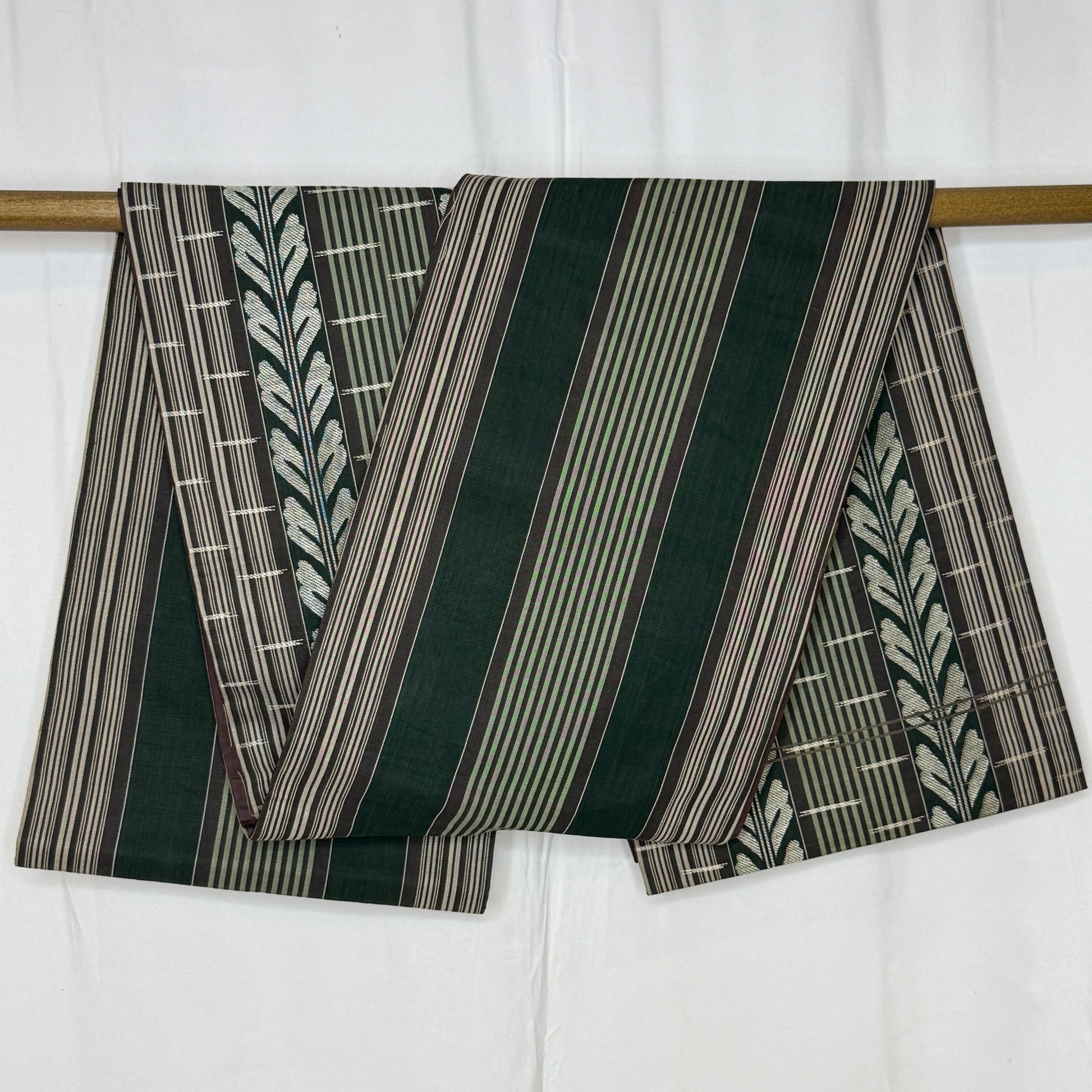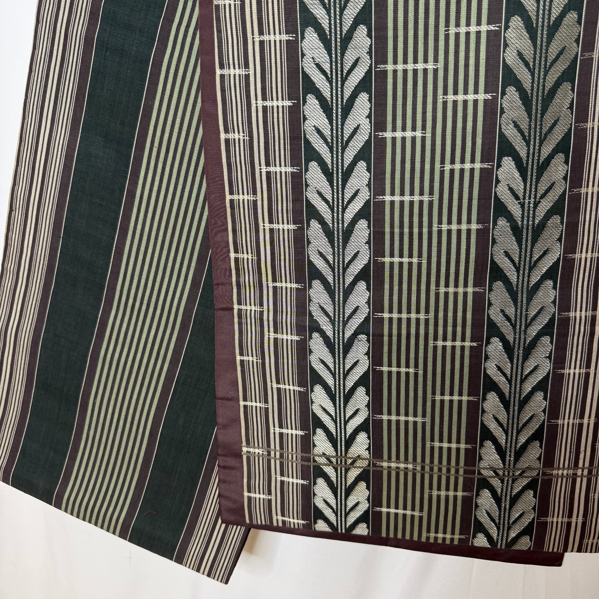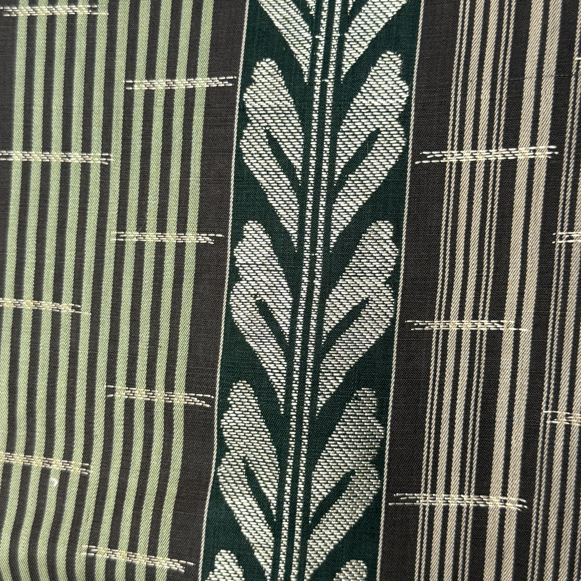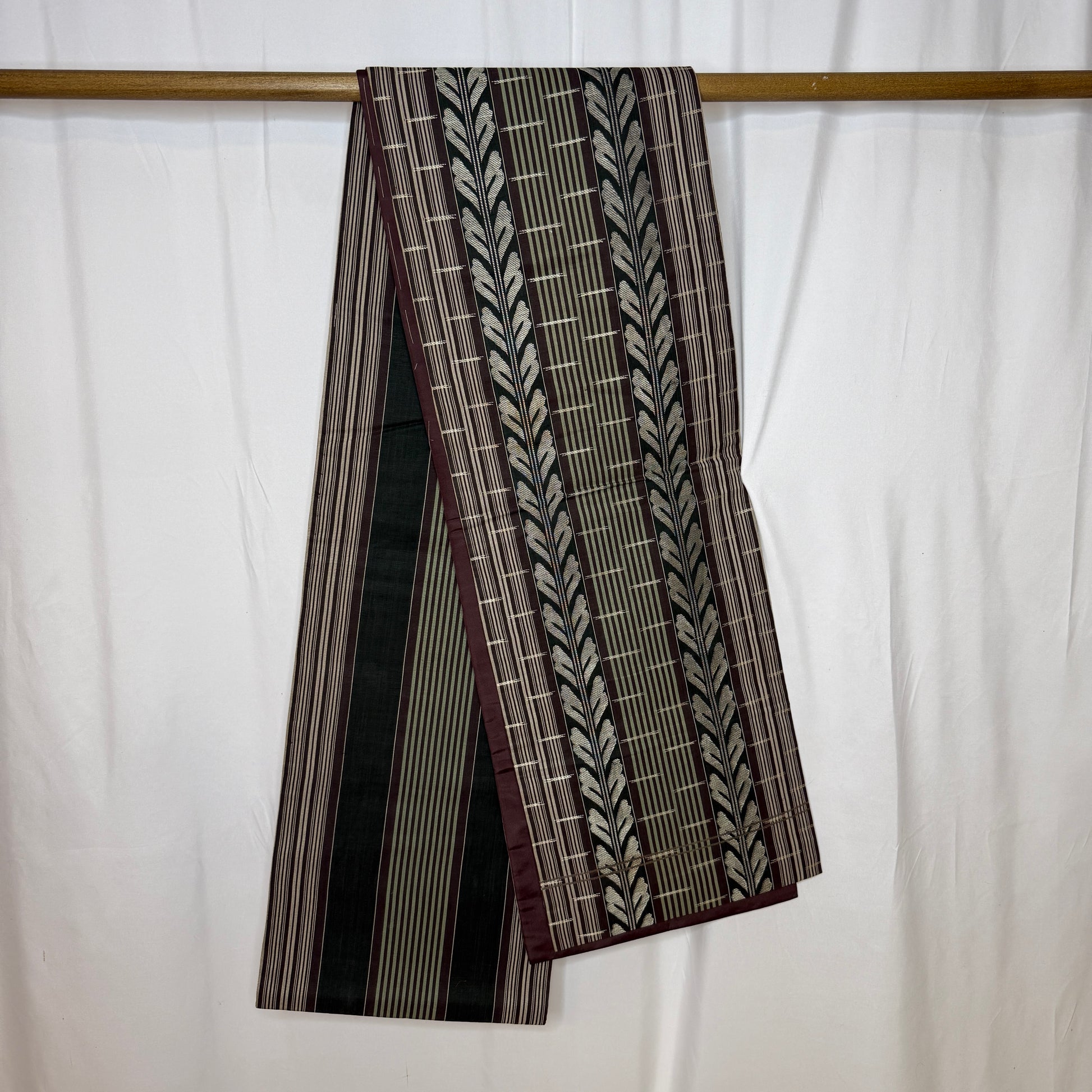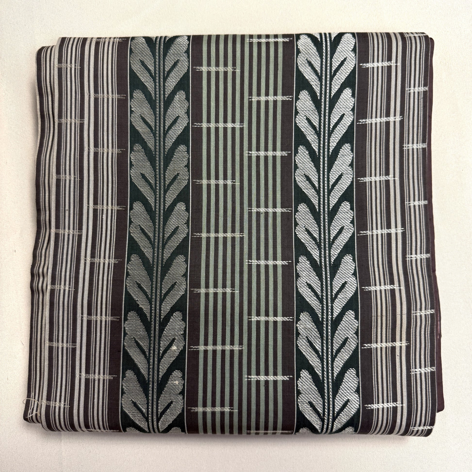 This vintage chuya obi is a captivating piece that balances refined structure with floral romance. One side features a fence and vine motif in earthy tones of deep eggplant, sage, and silver, giving it a stately, architectural elegance.