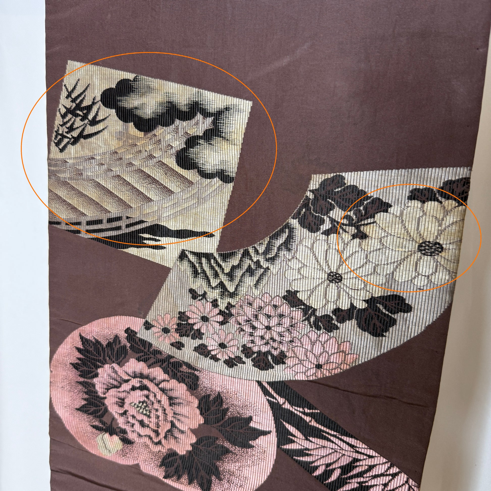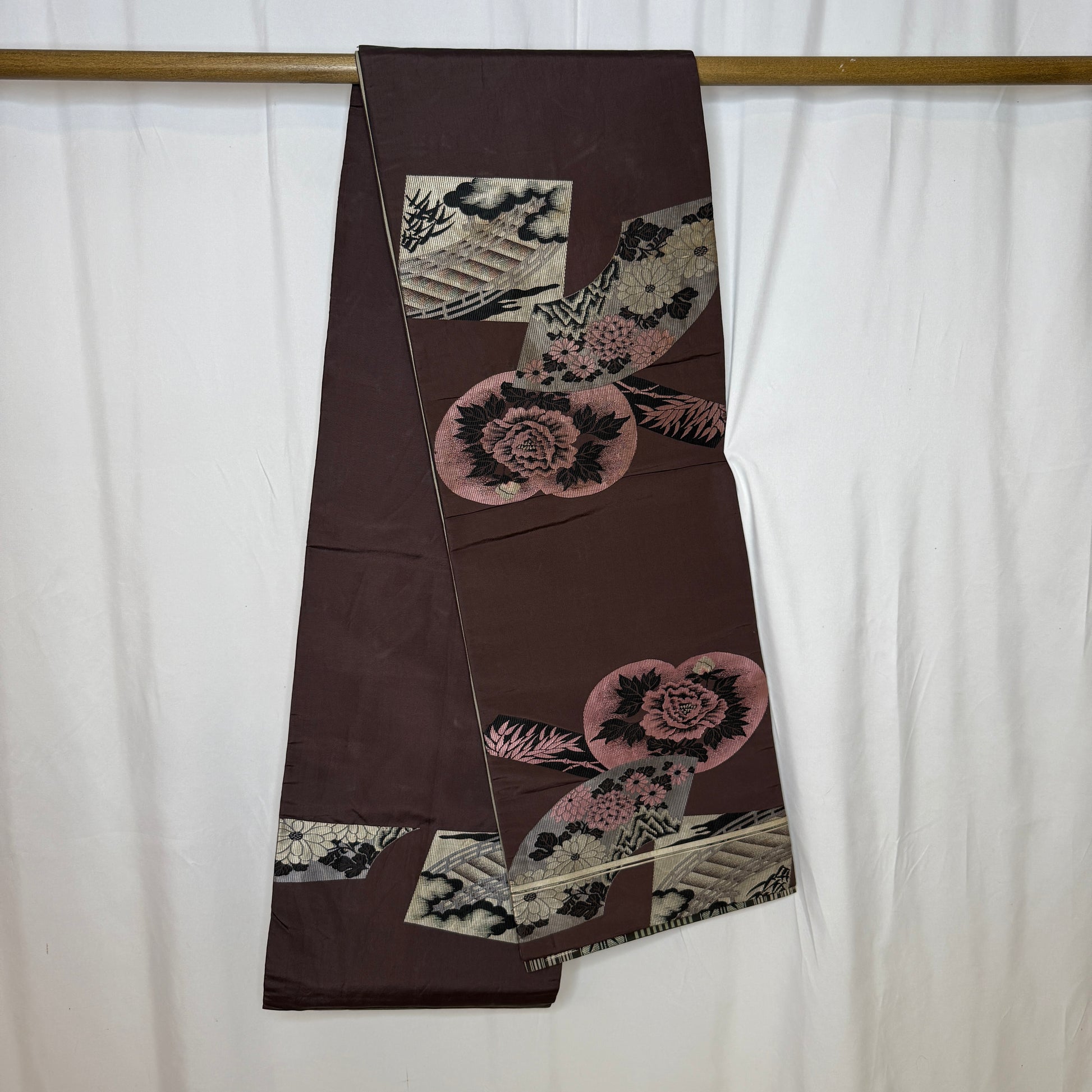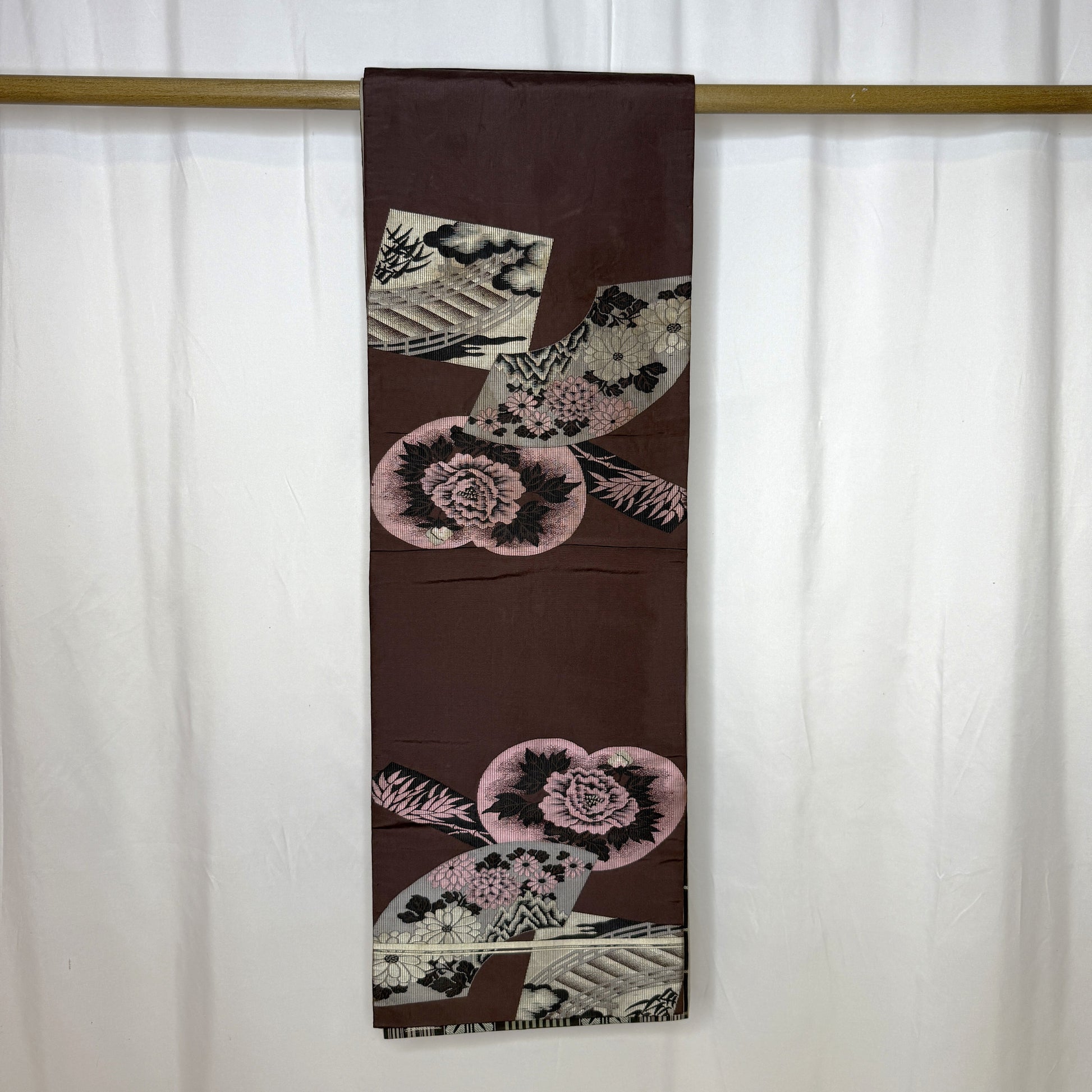 The reverse reveals a more poetic side: a rich chocolate brown background adorned with pink and black peonies, chrysanthemums, and scenic imagery on folding fans. The finely woven details catch the light beautifully. The double-side design makes it versatile for styling or display, offering two distinct aesthetics in one textile.