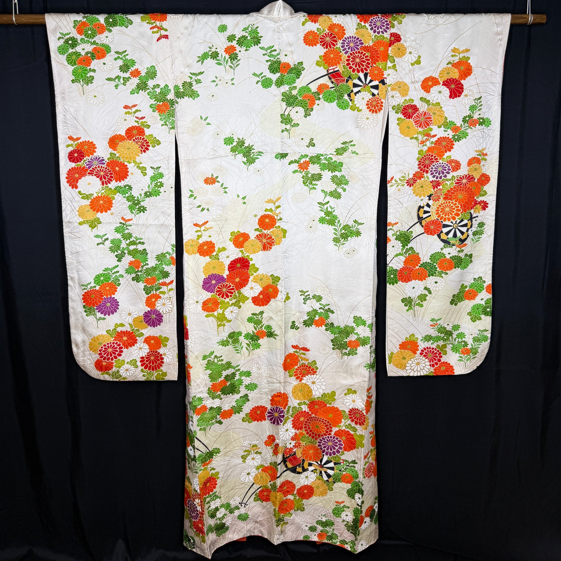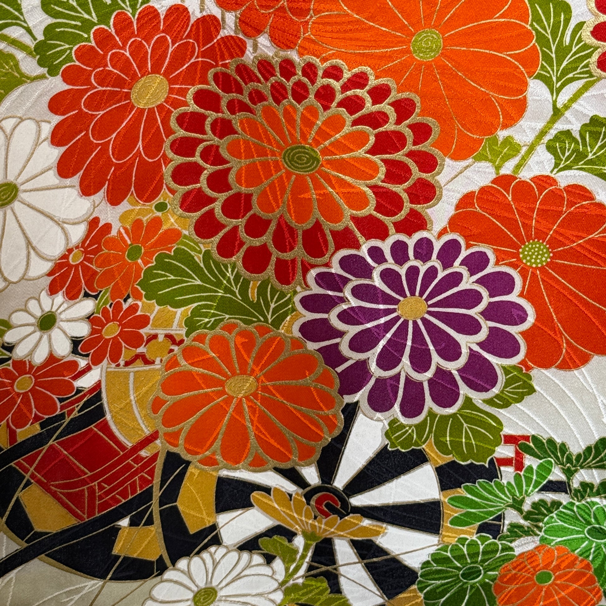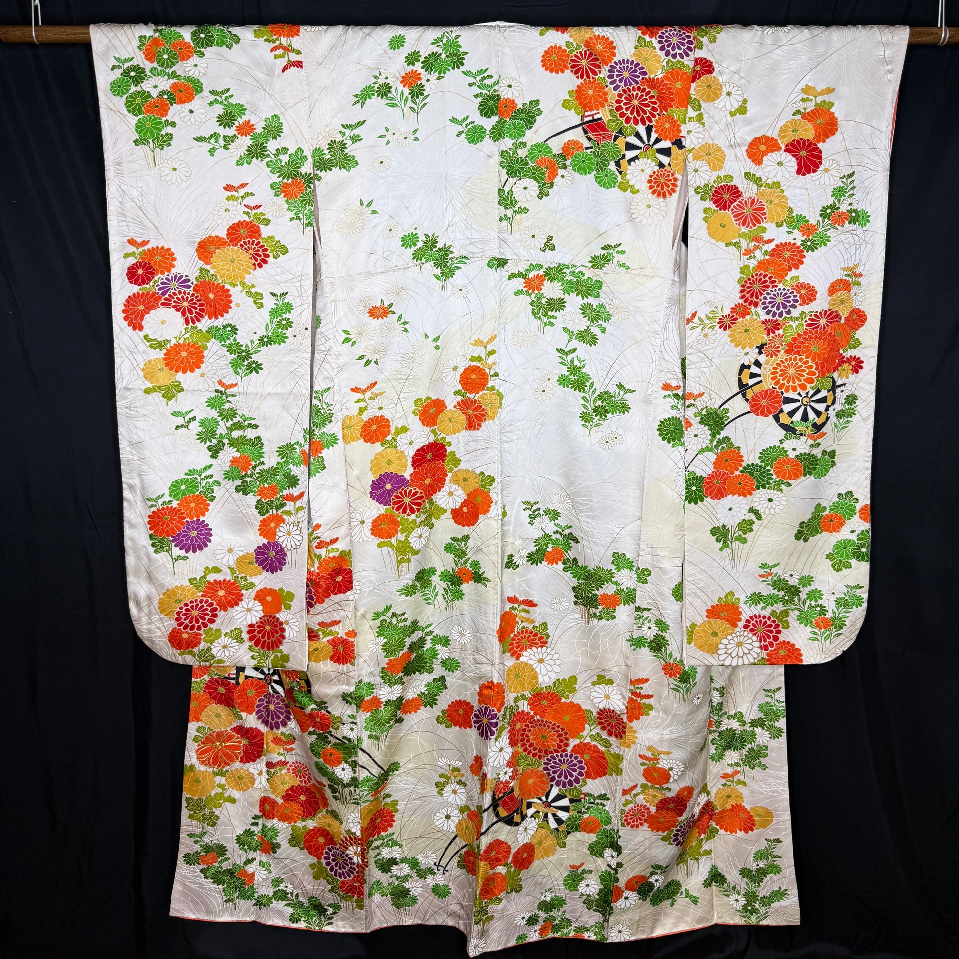 This kimono is a classic beauty, featuring traditional goshoguruma - imperial carts that were used to transport valuables to the feudal lord - festooned with flowers. Some petals have edges with gold leaf, others are fully embroidered.