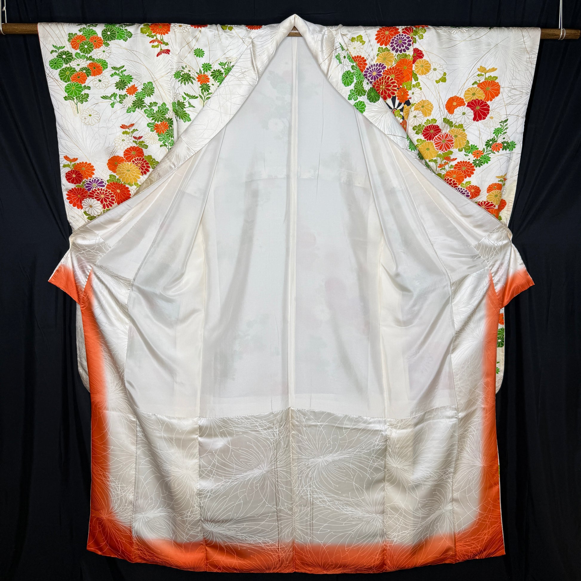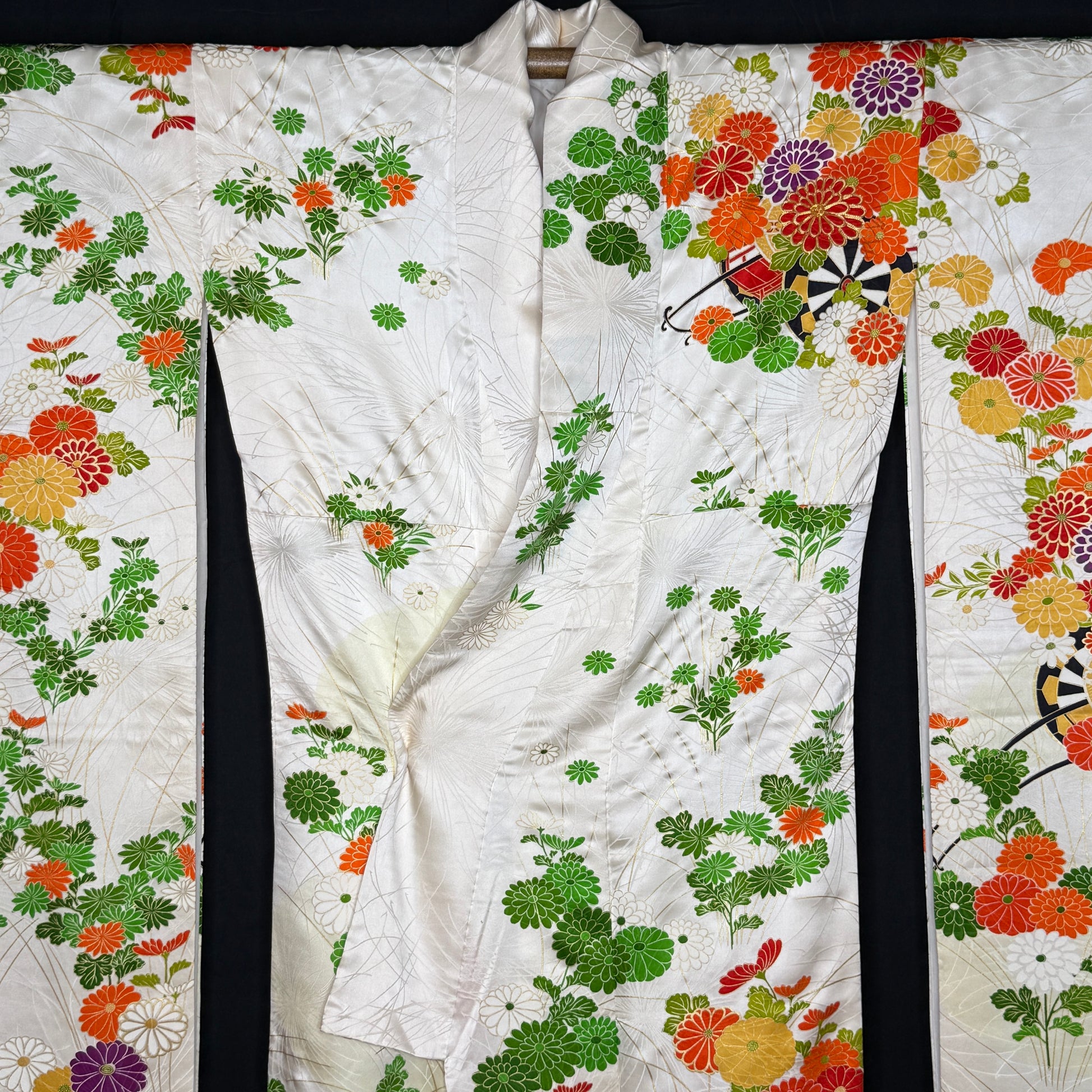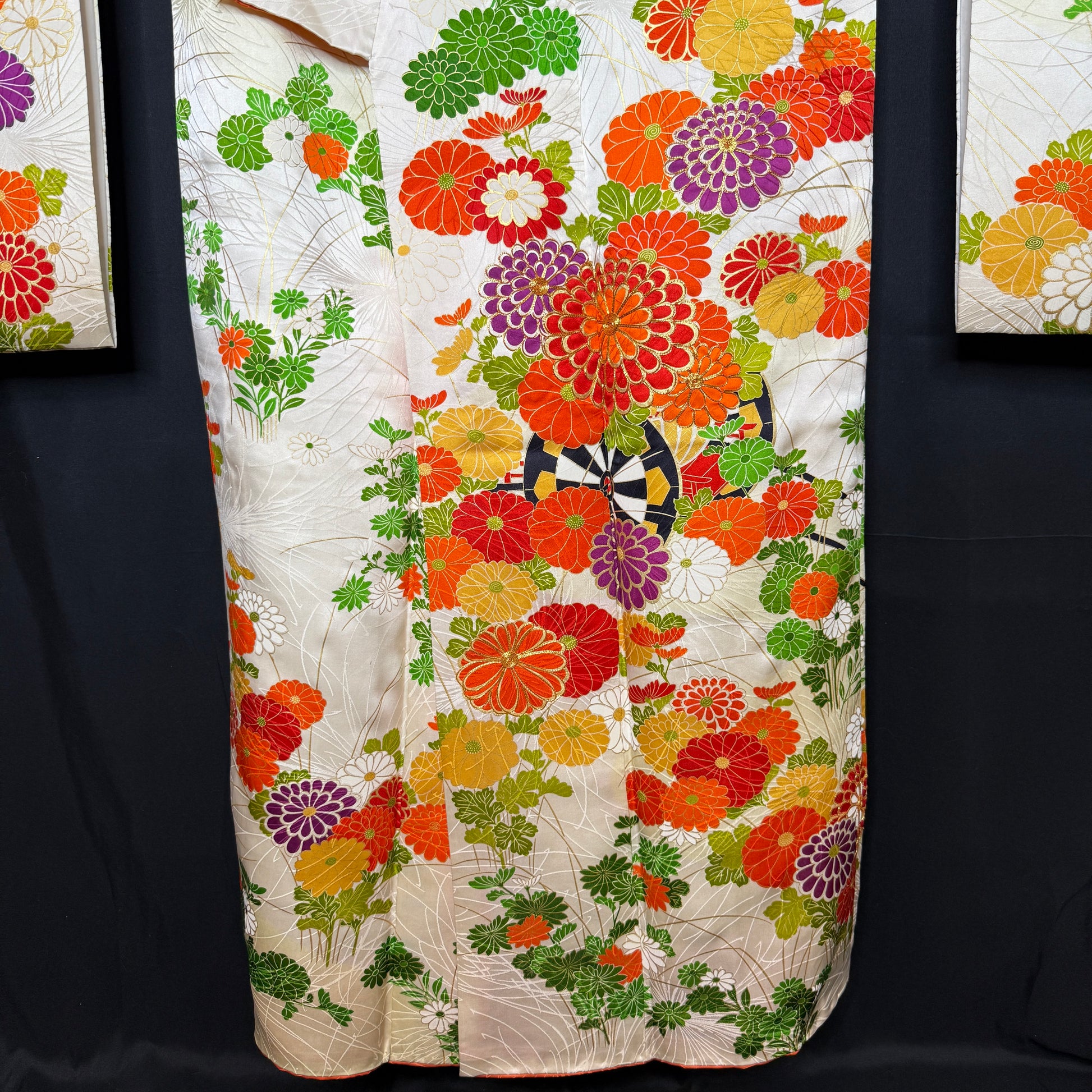 This kimono is a classic beauty, featuring traditional goshoguruma - imperial carts that were used to transport valuables to the feudal lord - festooned with flowers. Some petals have edges with gold leaf, others are fully embroidered.