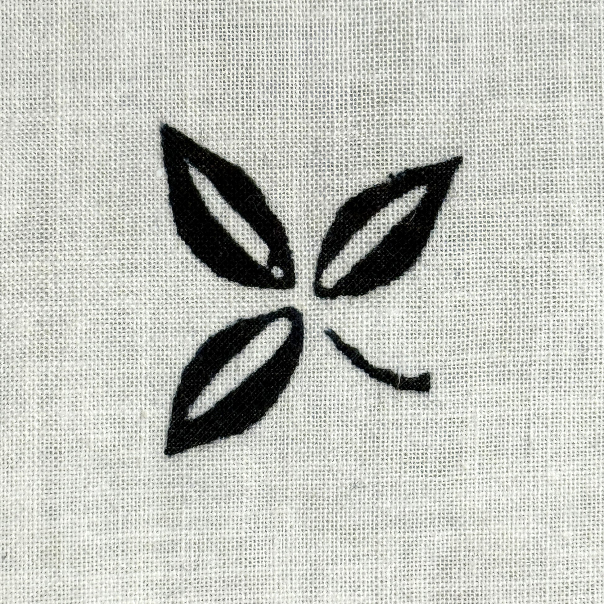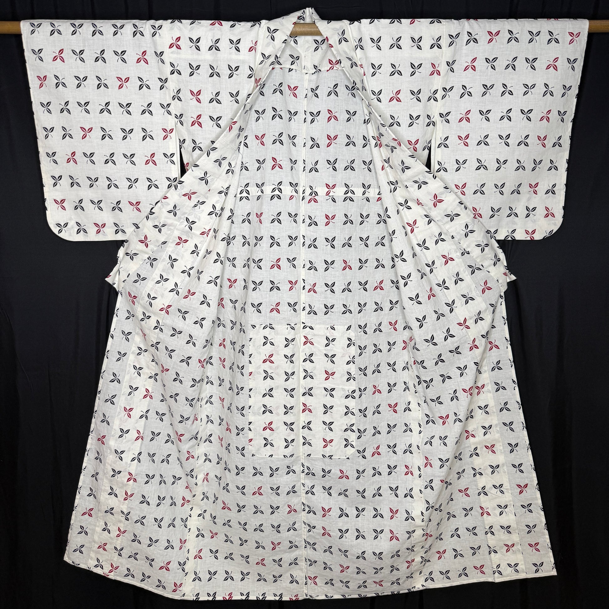 This vintage cotton yukata has a sweet charm that comes through in its repeating three petal or leaf motifs, scattered in a balanced grid of black and red, almost like a field of tiny leaves caught mid-spin. The pattern is simple but spirited, giving the piece a light and cheerful summer energy. Playful minimal style.