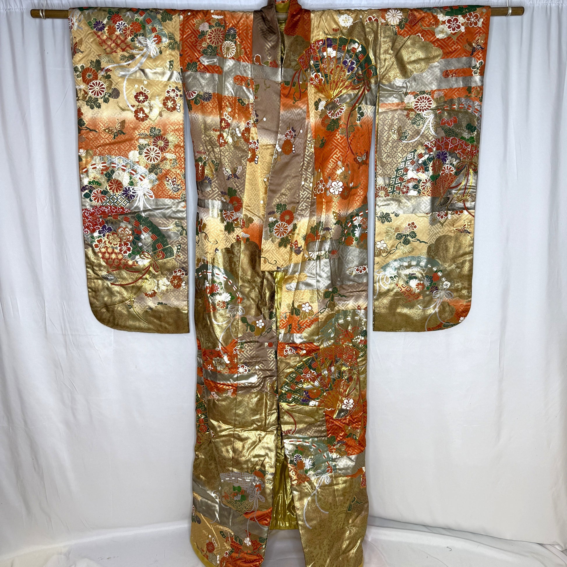 An opulent tapestry of celebration and refinement, this wedding kimono unfolds like a ceremonial screen filled with layered symbolism and exquisite detail. Elaborately decorated folding fans reveal chrysanthemums, peonies, plum blossoms, and other seasonal florals, interspersed with fluttering butterflies and an emerging radiant phoenix.