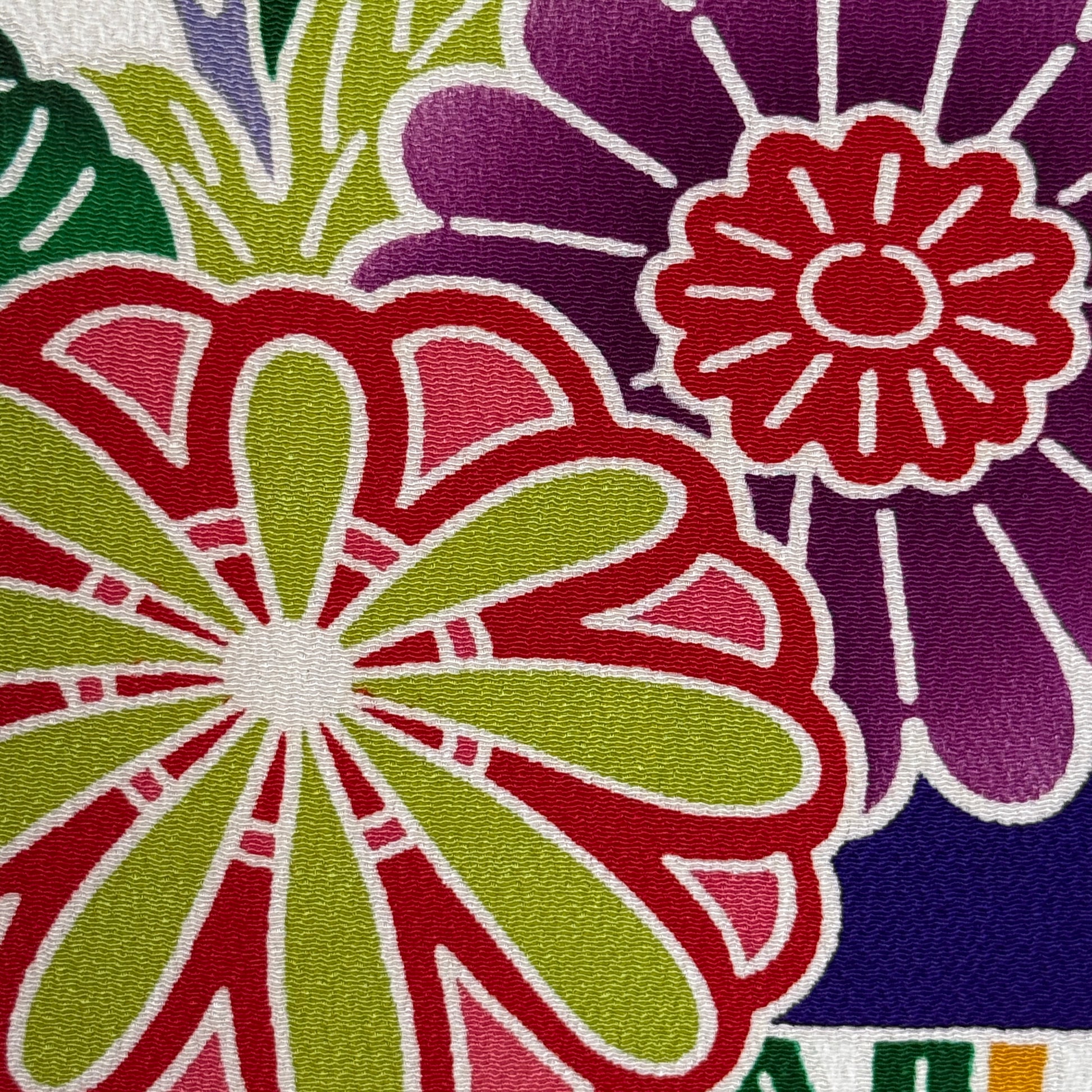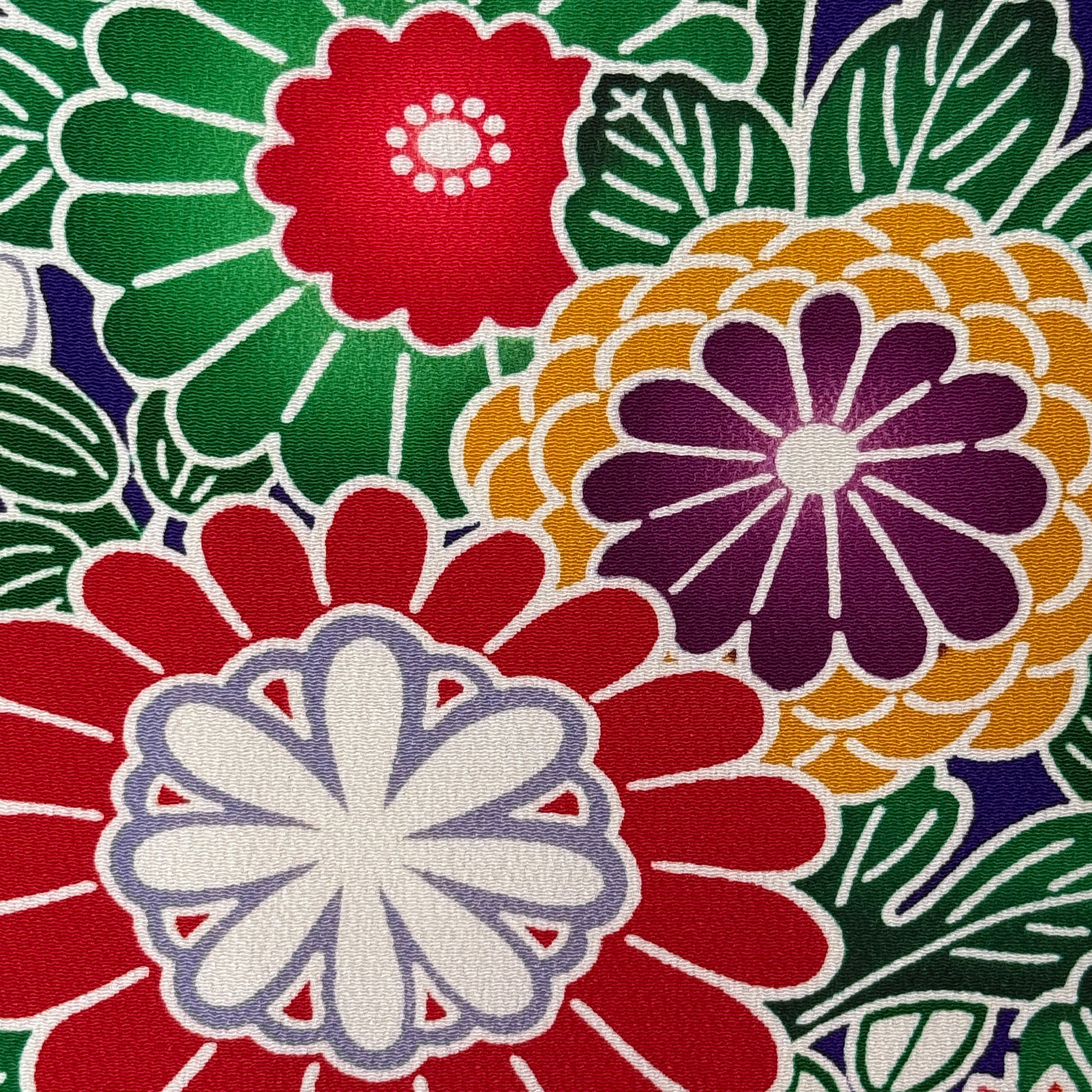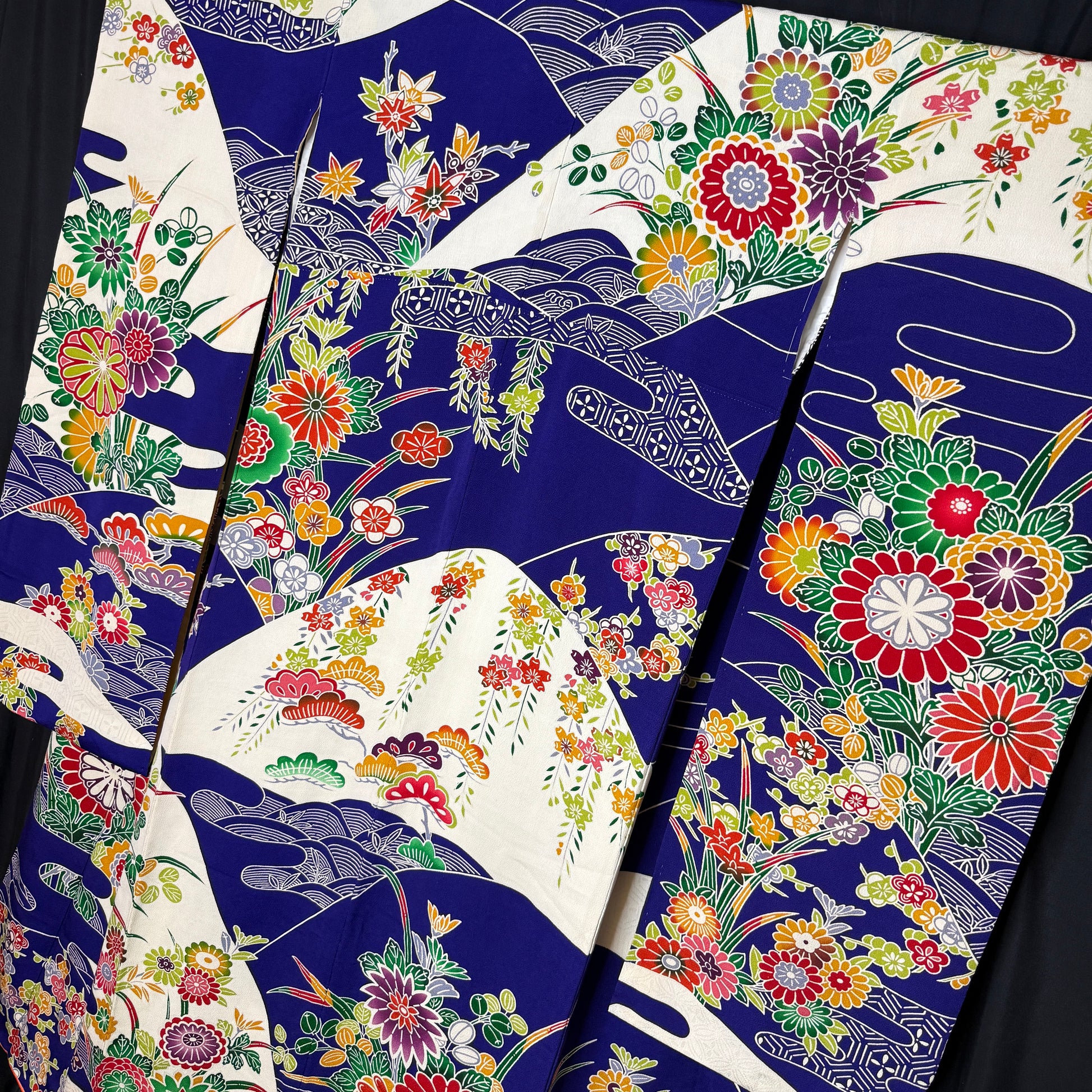 A celebration of color, movement, and joy, this striking vintage furisode kimono feels like a painted festival in motion. A saturated cobalt blue flows like stylized water below white hillsides, setting the stage for a lush parade of florals and pine motifs inspired by traditional bingata aesthetics. Bingata is a traditional Okinawan dyeing technique that uses hand-cut stencils and layered dyes to create bold, joyful patterns with crisp outlines and richly shaded colors. Chrysanthemums, plum blossoms, cherry blossoms, maple leaves, and trailing wisteria appear in a vivid palette of crimson, saffron, emerald, lavender, coral, and soft gray. Truely a show-stopping kimono as wearable art!