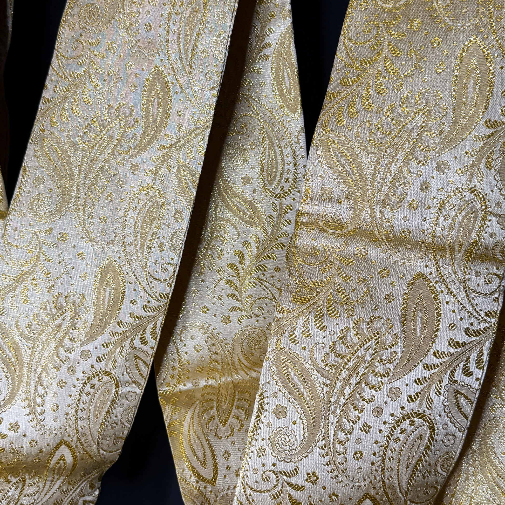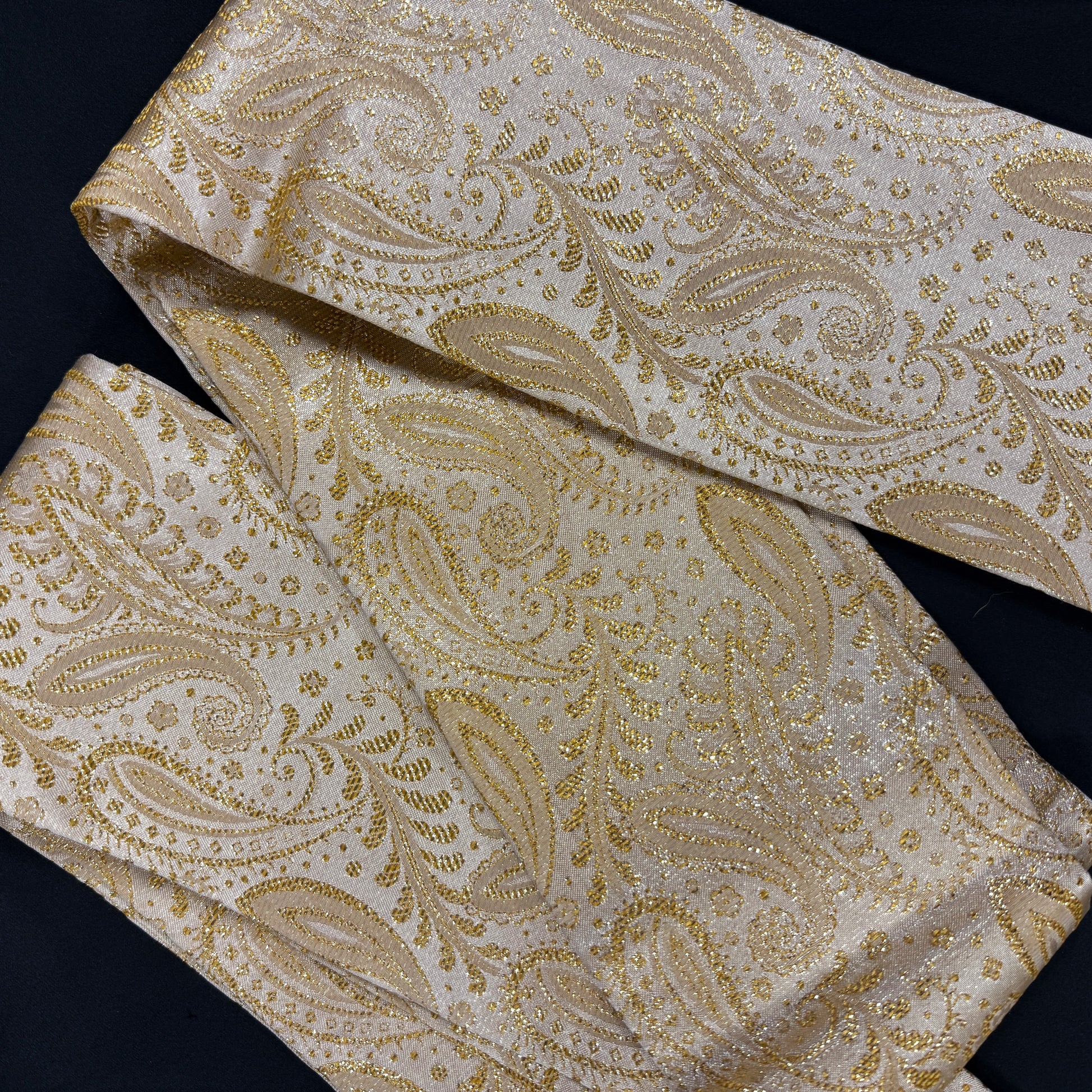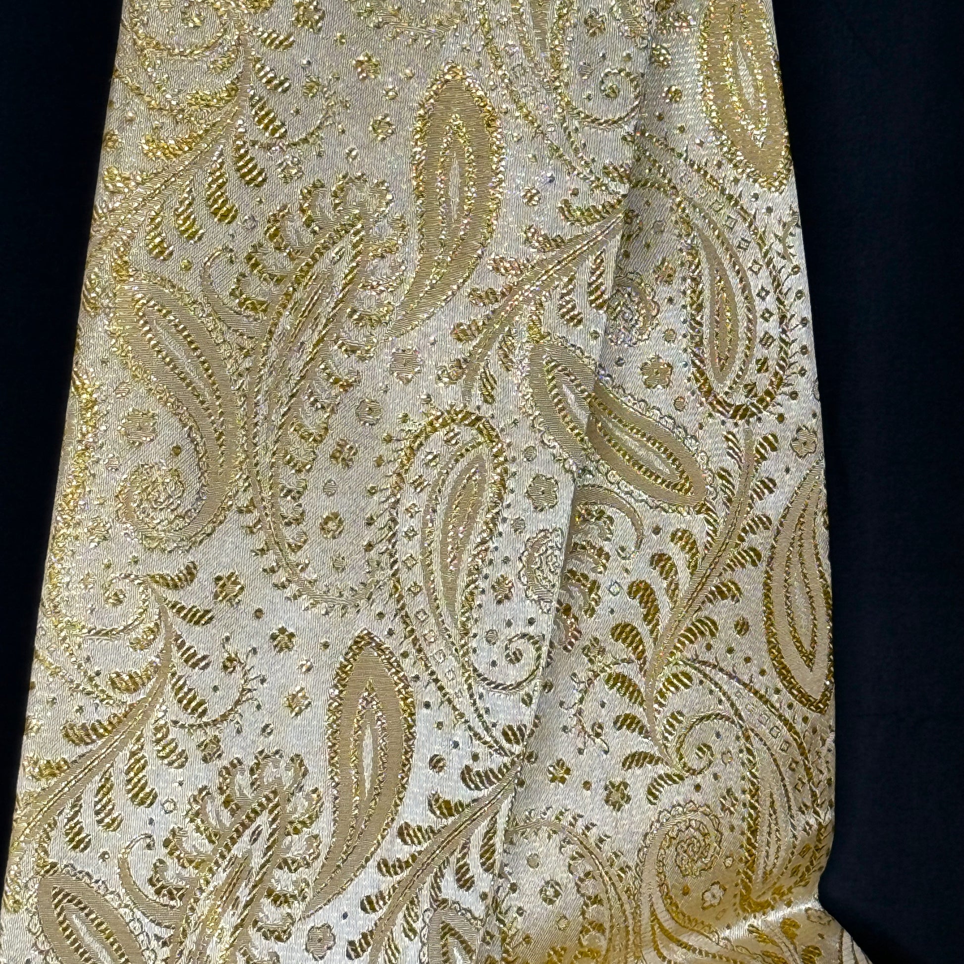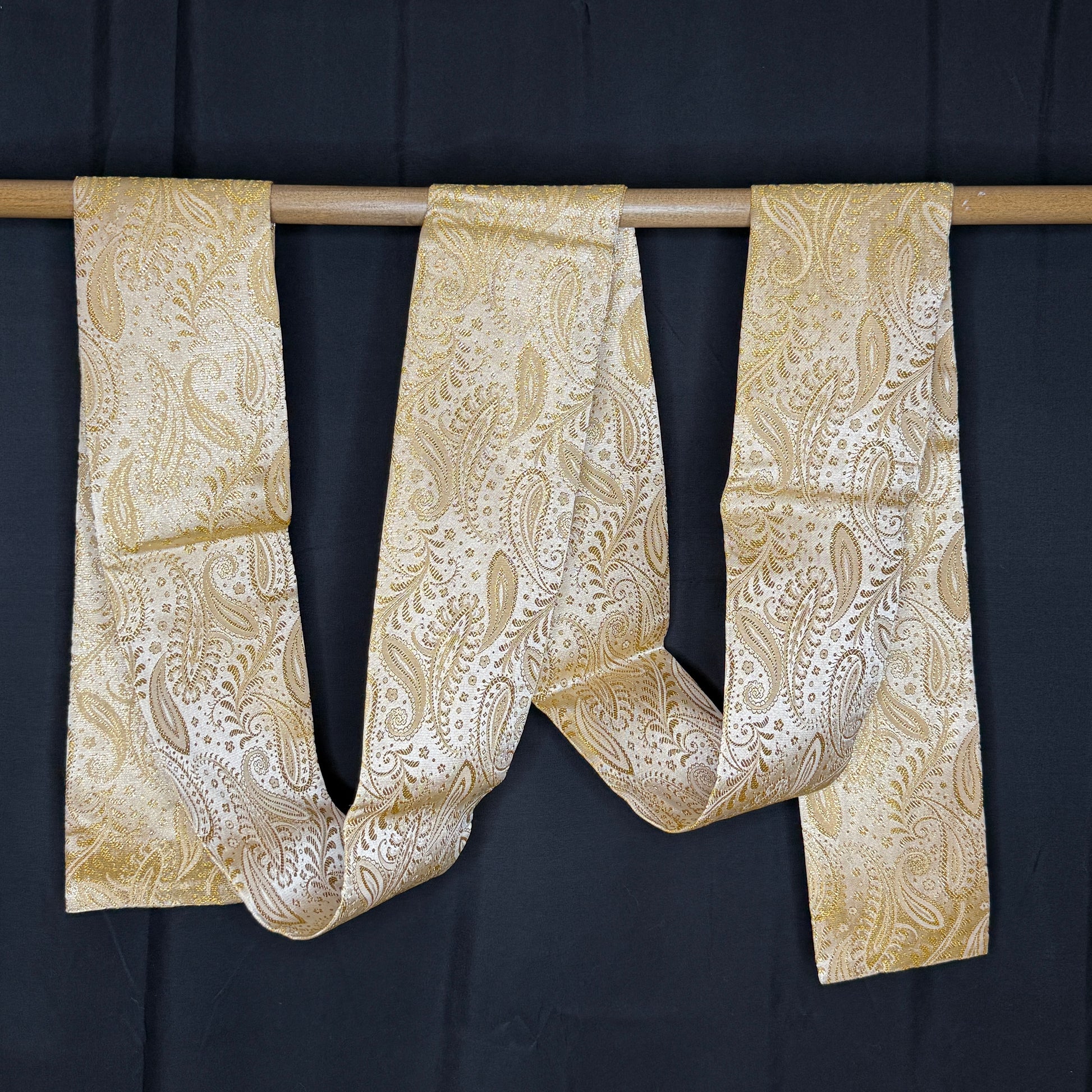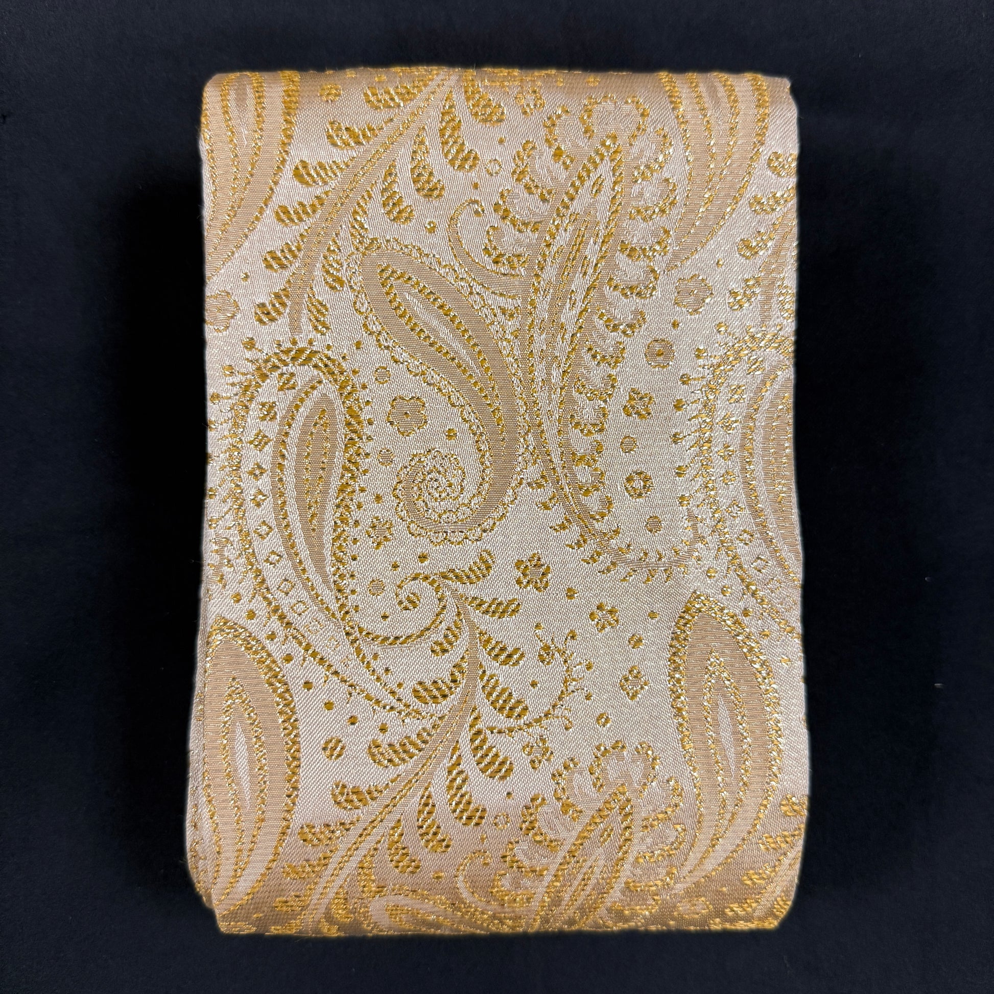 It just shimmers with holiday cheer, this luminous vintage obi, woven in a glowing palette of pale gold and champagne. The delicate paisley pattern curls across the surface like drifting winter whirls, each element highlighted with metallic threads that catch the light beautifully.