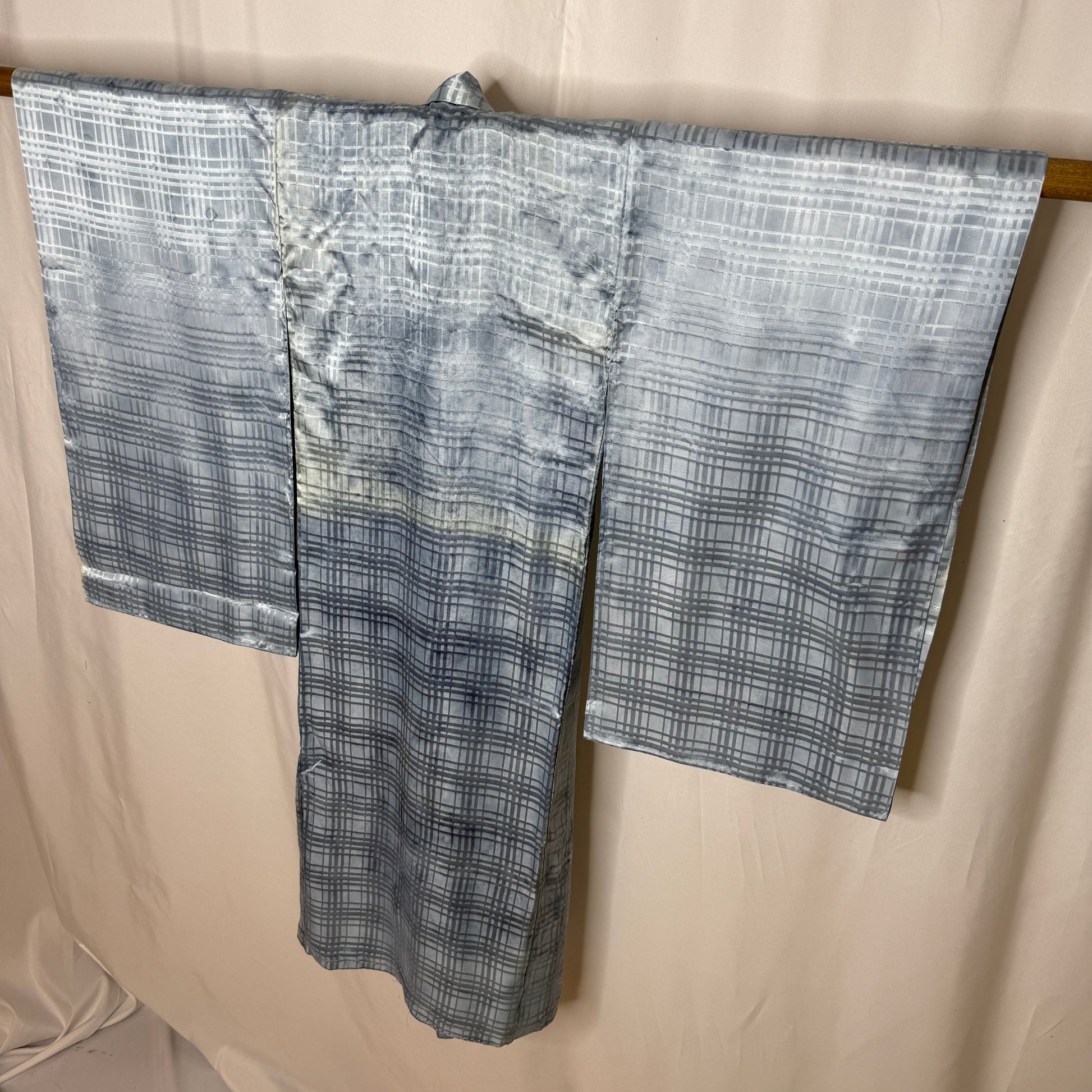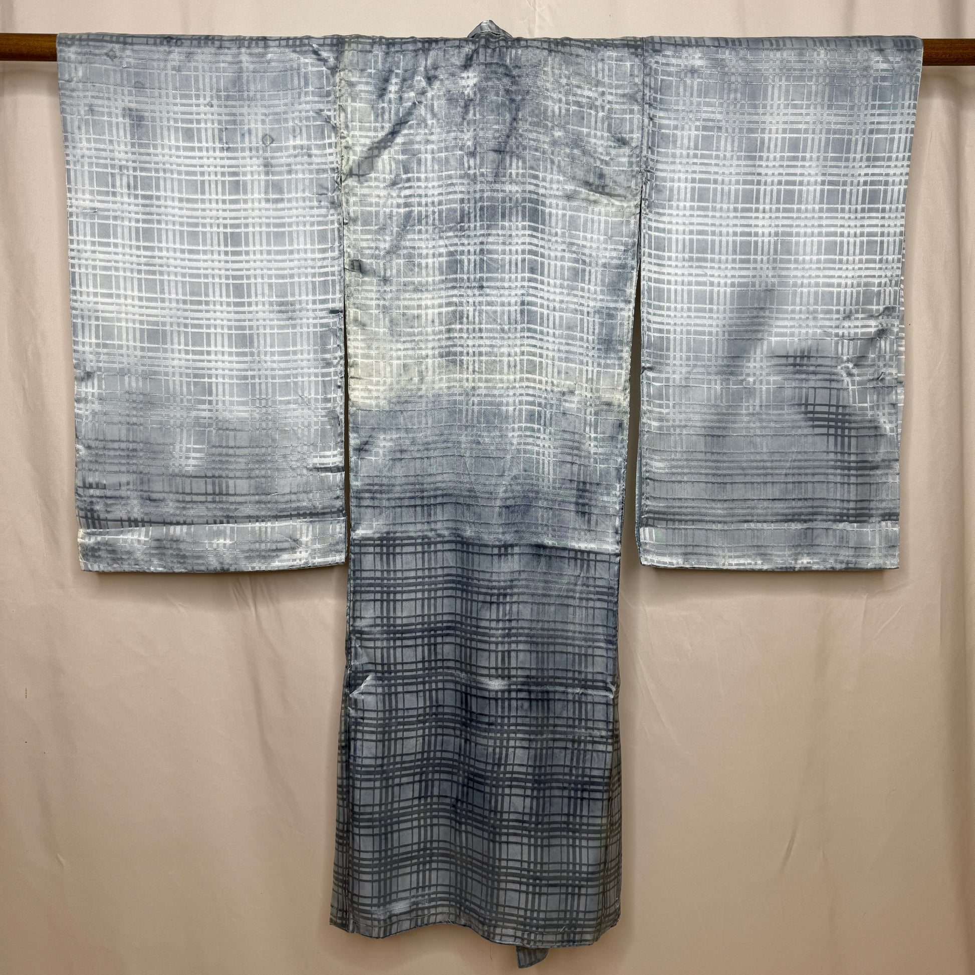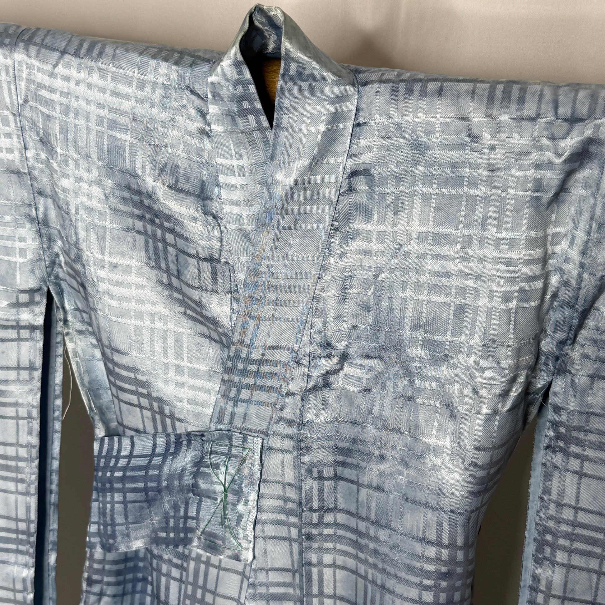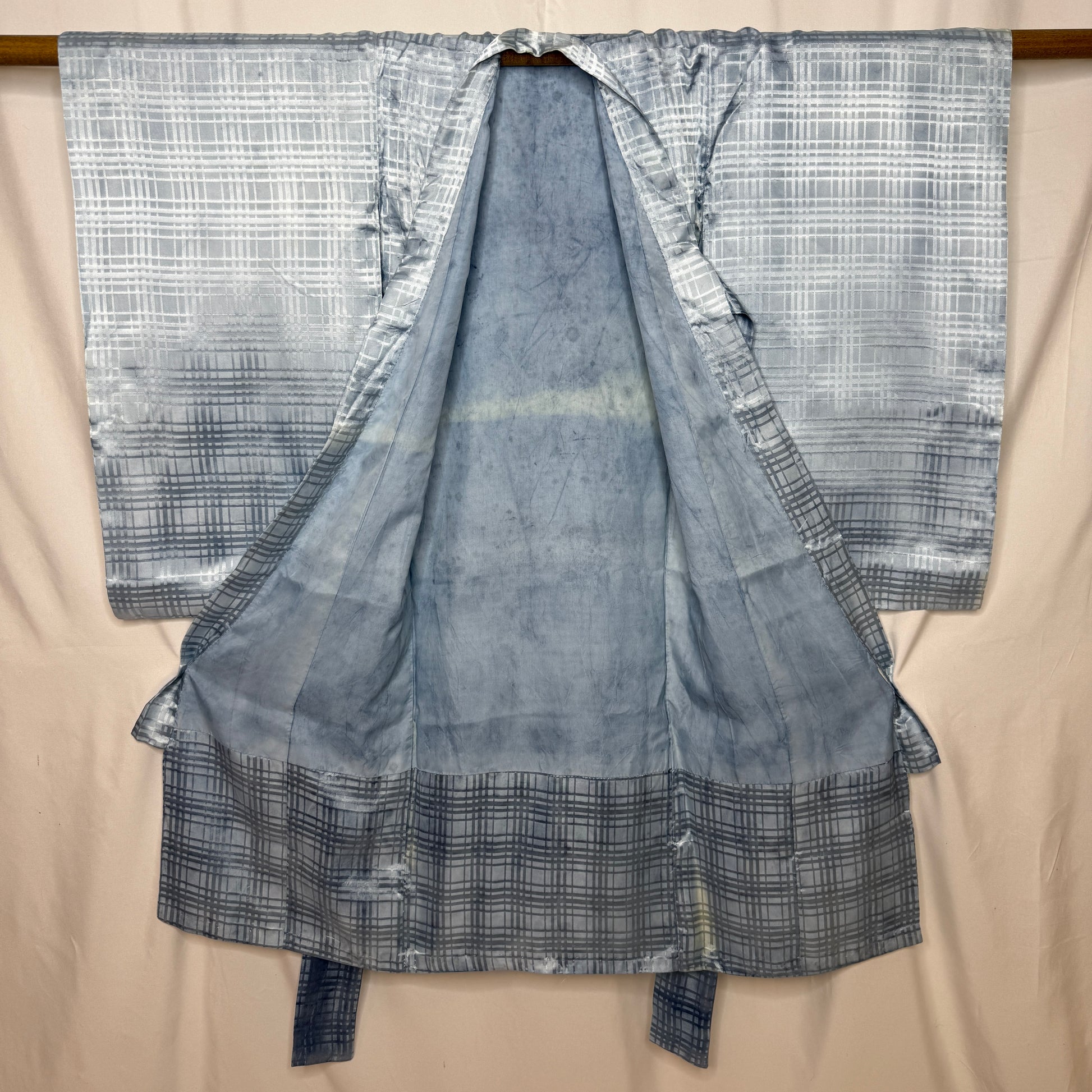 The underlying pattern is a woven grid, and the kimono still has the long ties at the front collar that would have been used to close it.