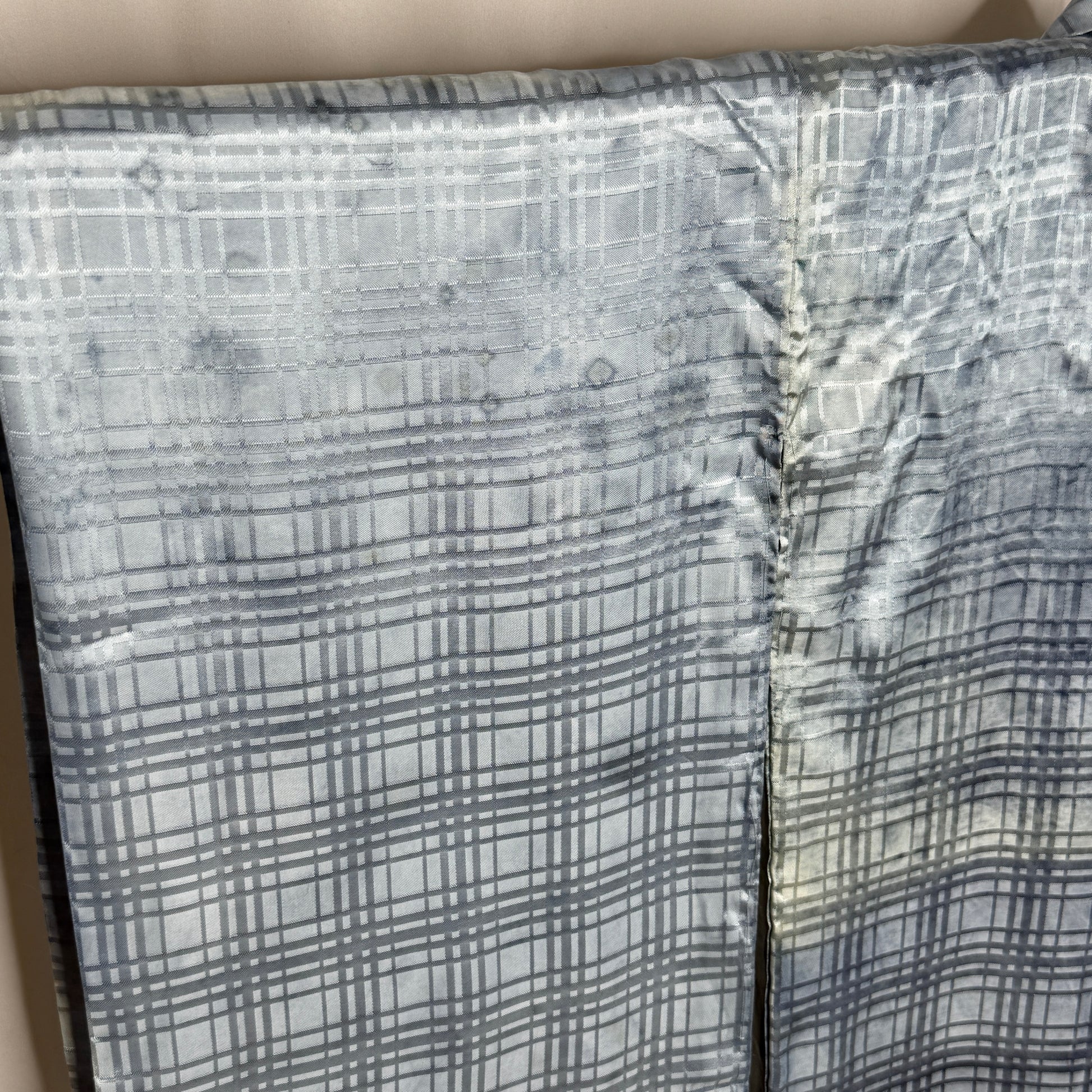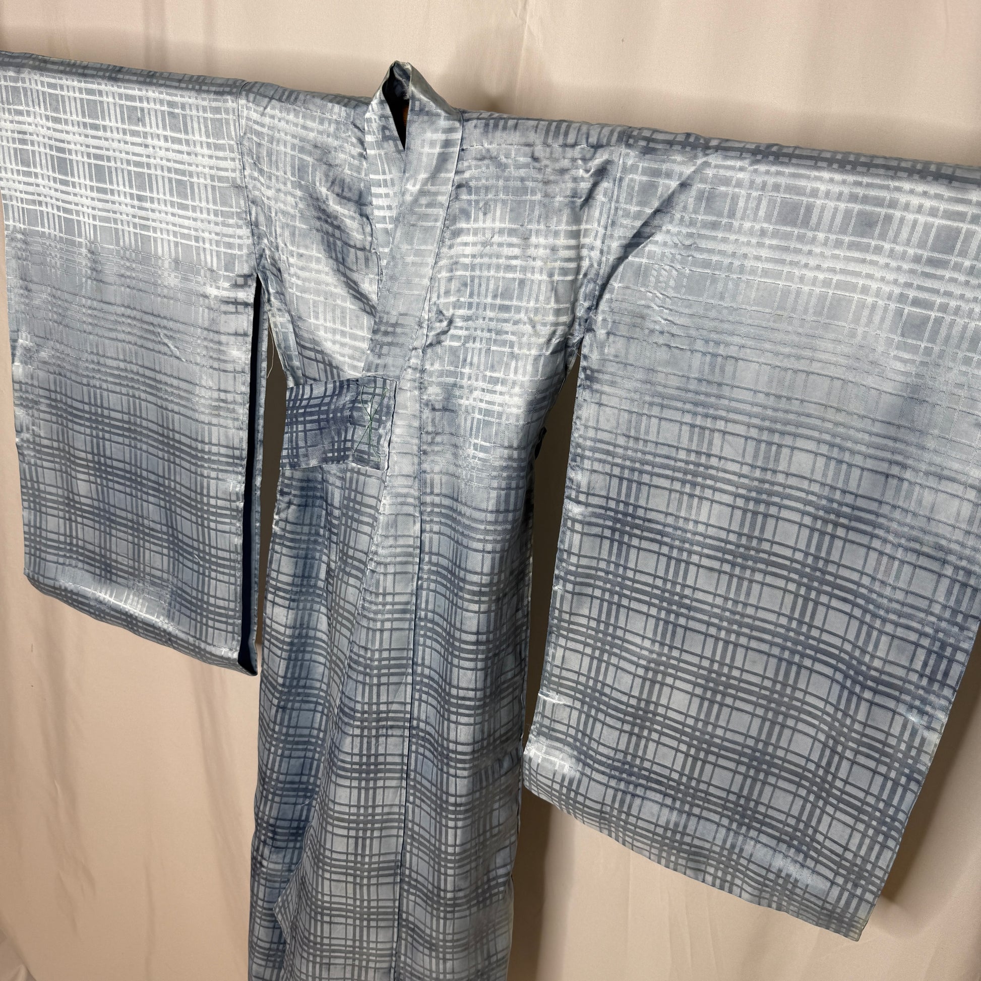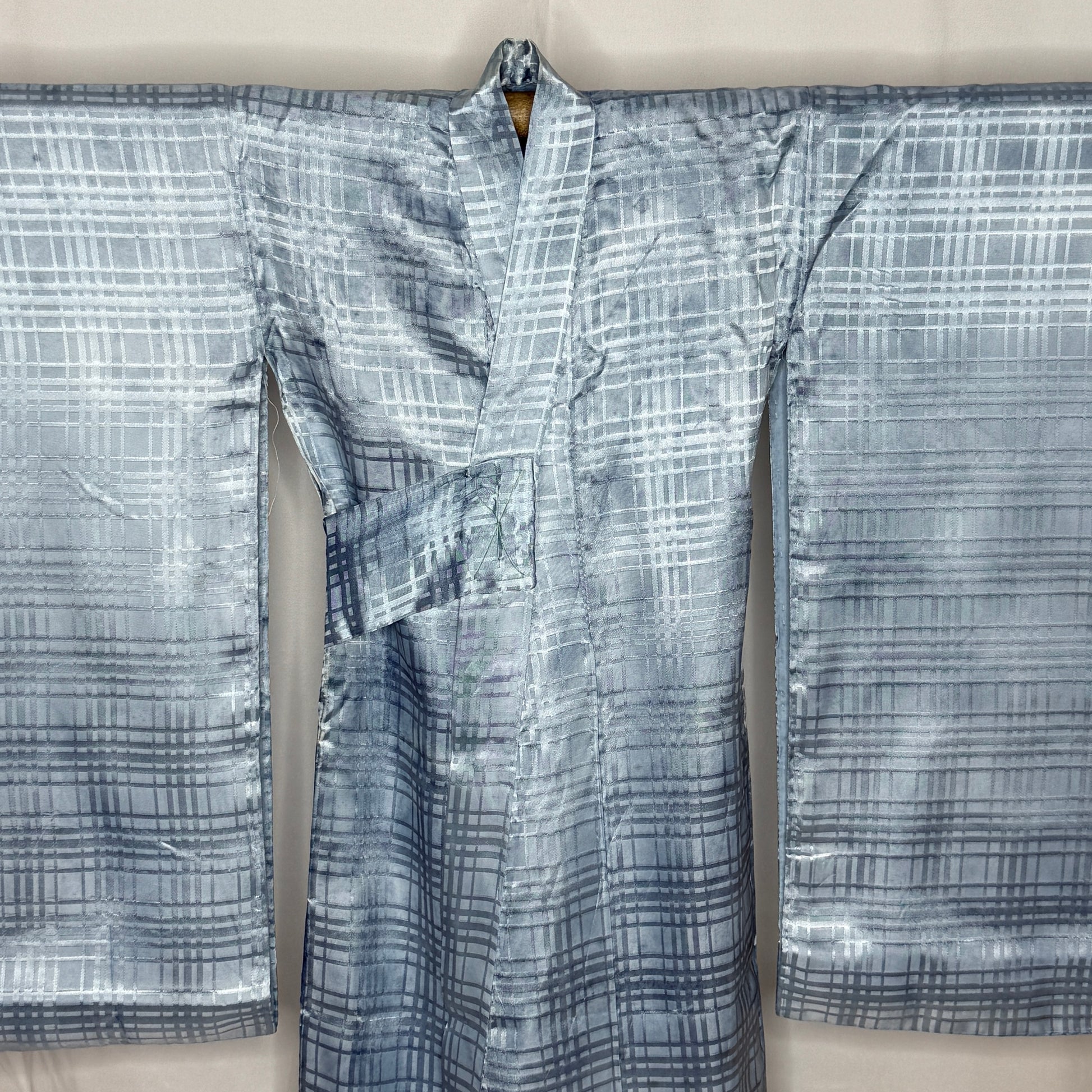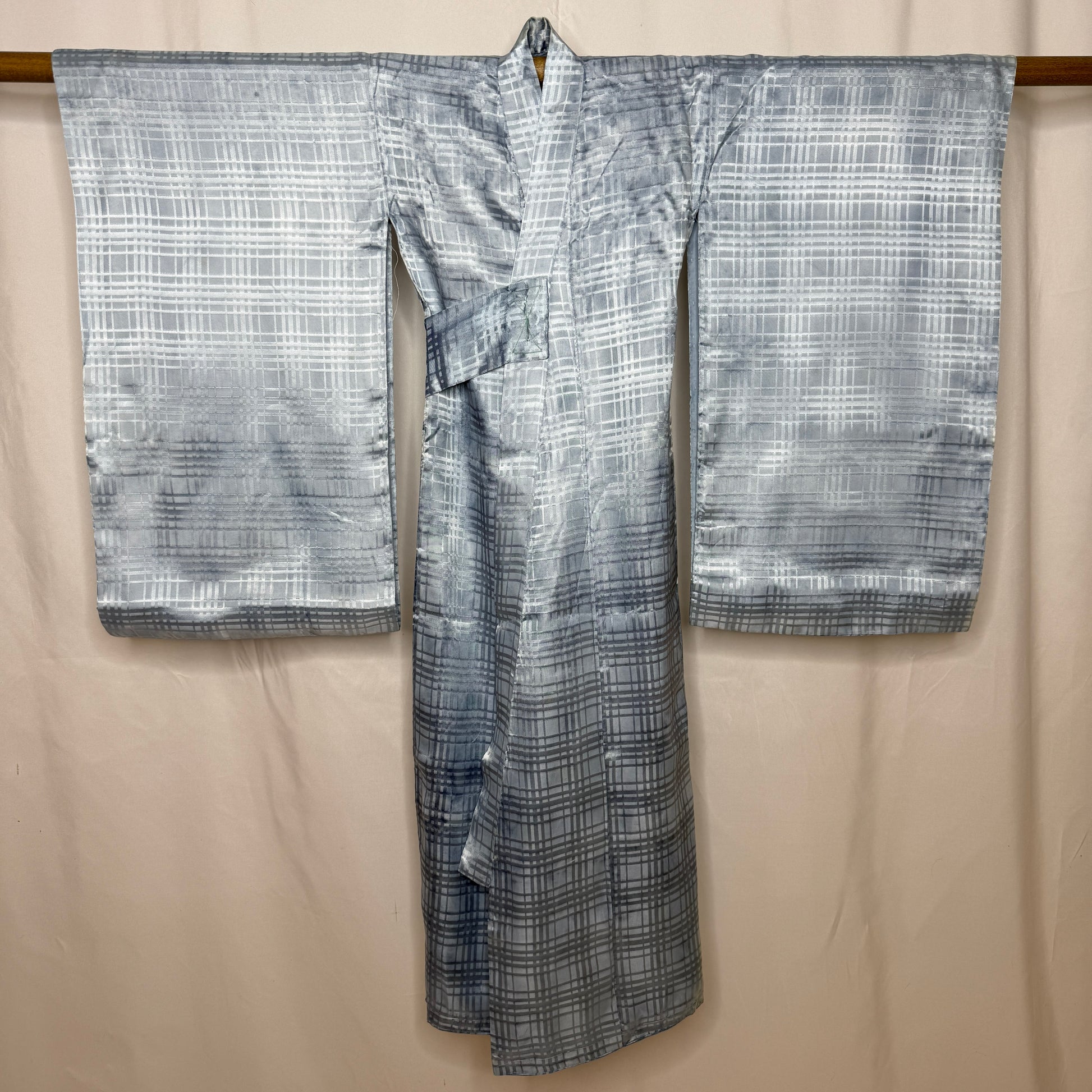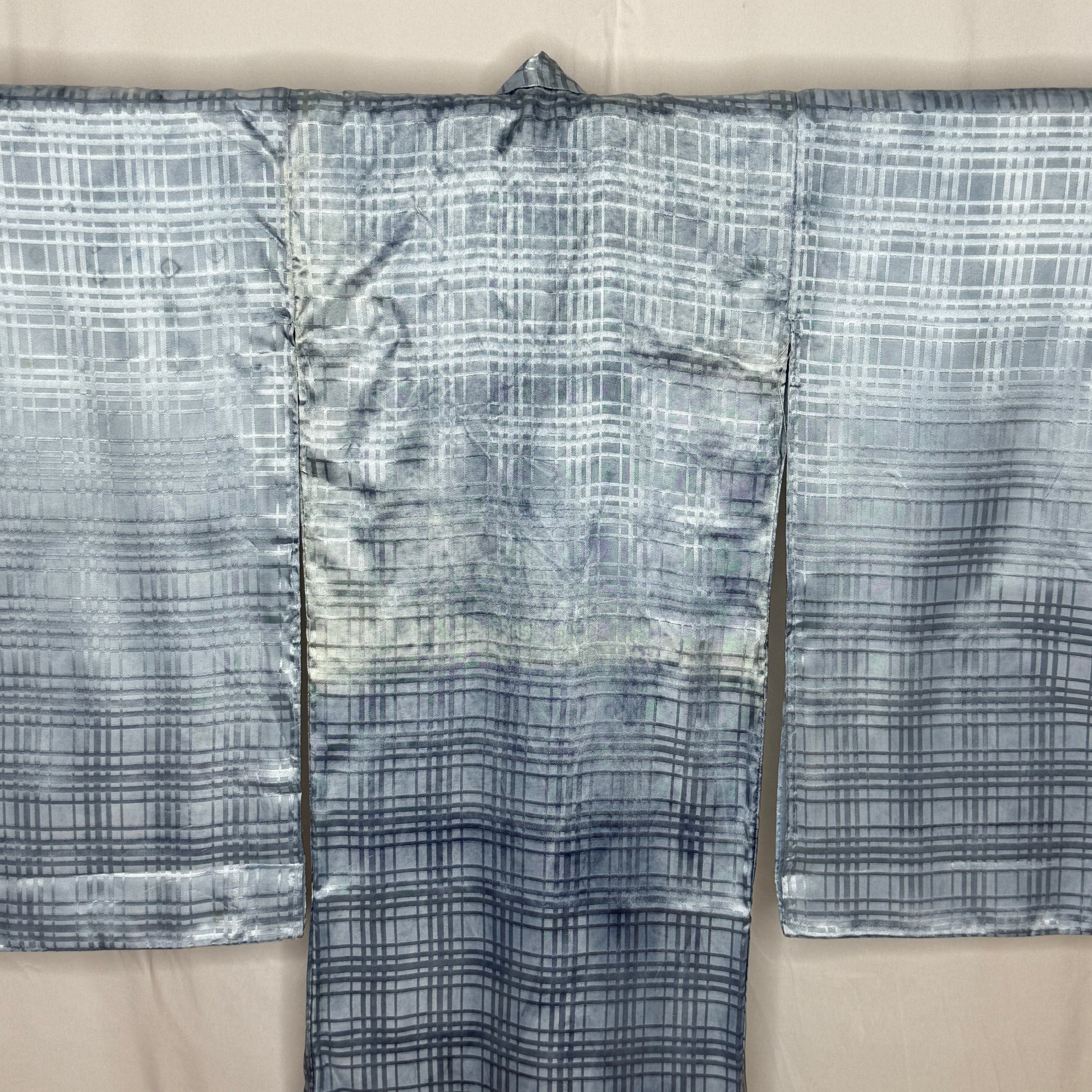The underlying pattern is a woven grid, and the kimono still has the long ties at the front collar that would have been used to close it.