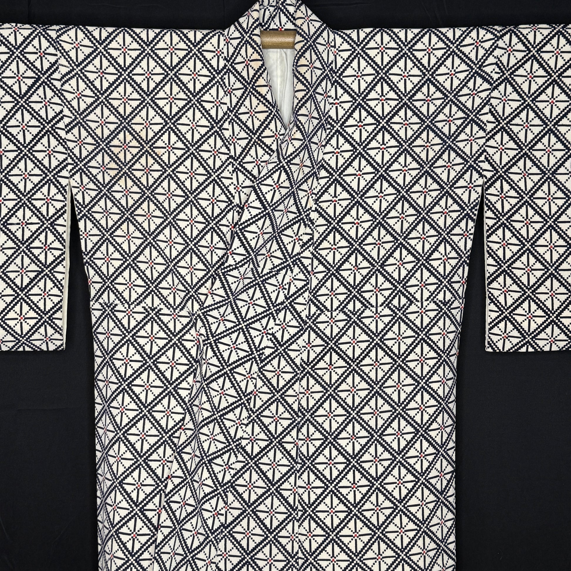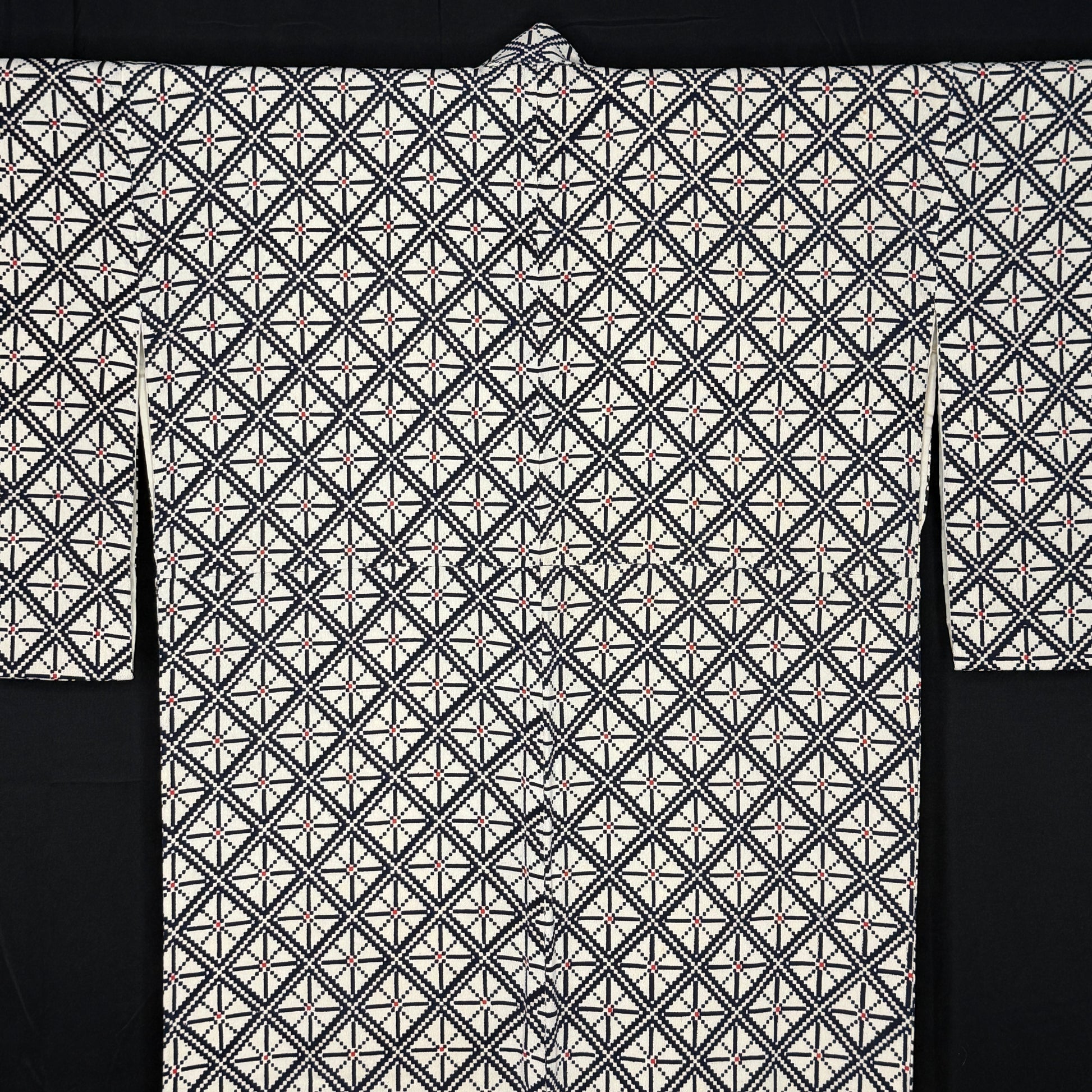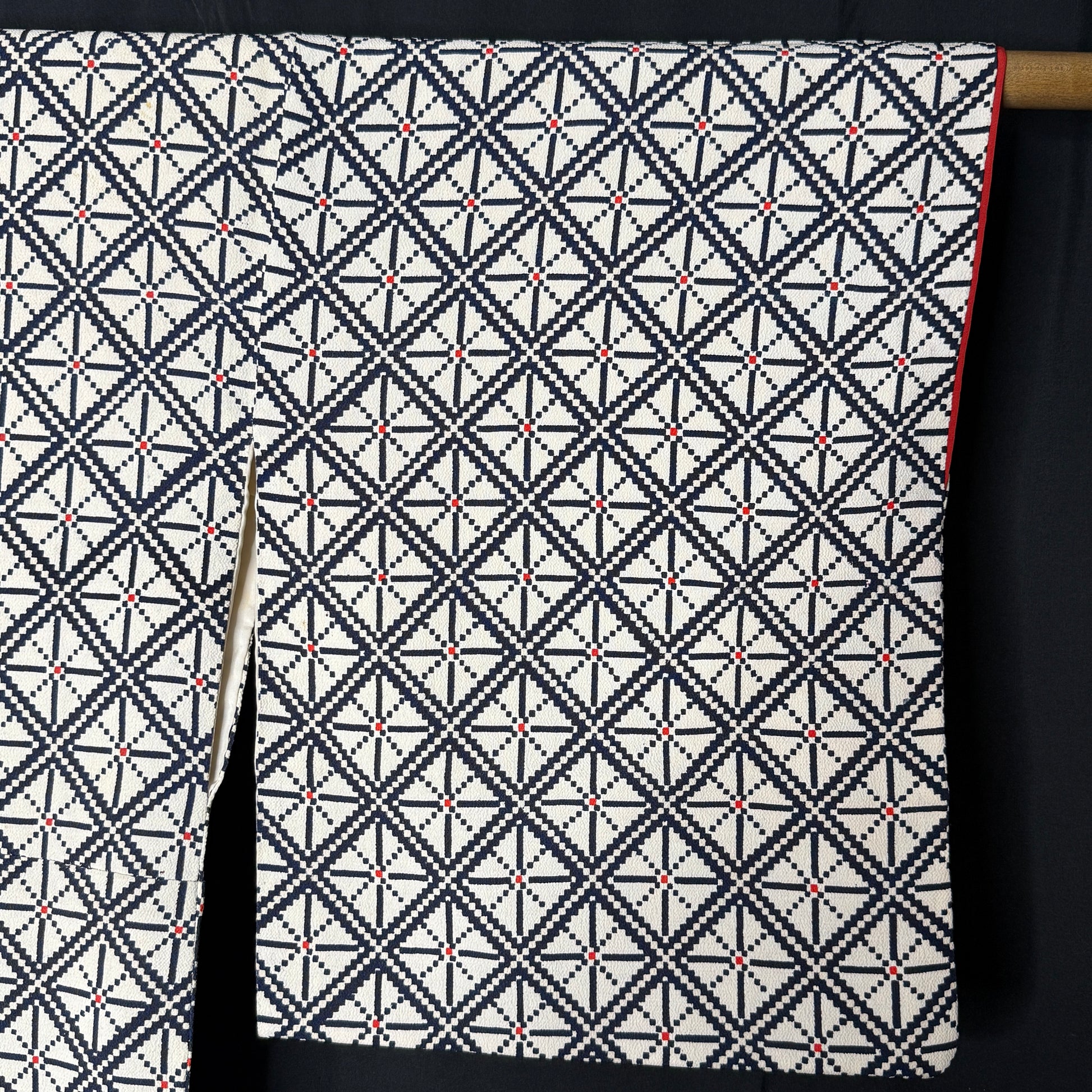 Fresh, graphic, and striking, this casual kimono features a repeating diamond lattice in deep indigo set against a soft white background, with each intersection punctuated with a tiny red center like a subtle spark. The rhythmic grid creates a beautifully structured look, almost architectural in its precision, while the small red accents add just enough warmth and personality.