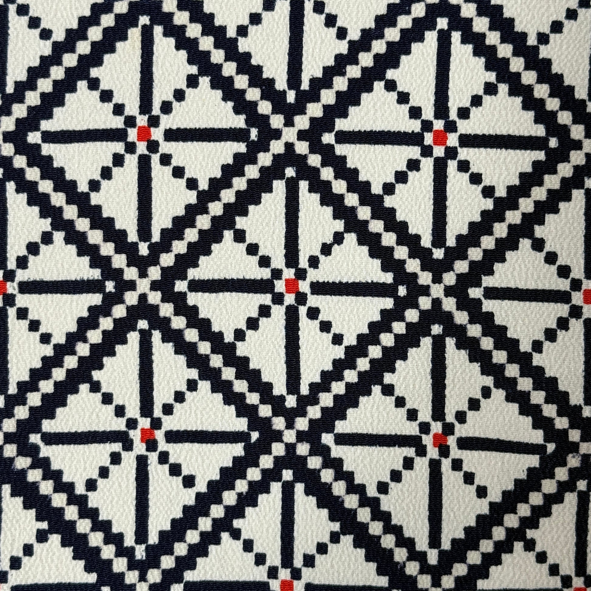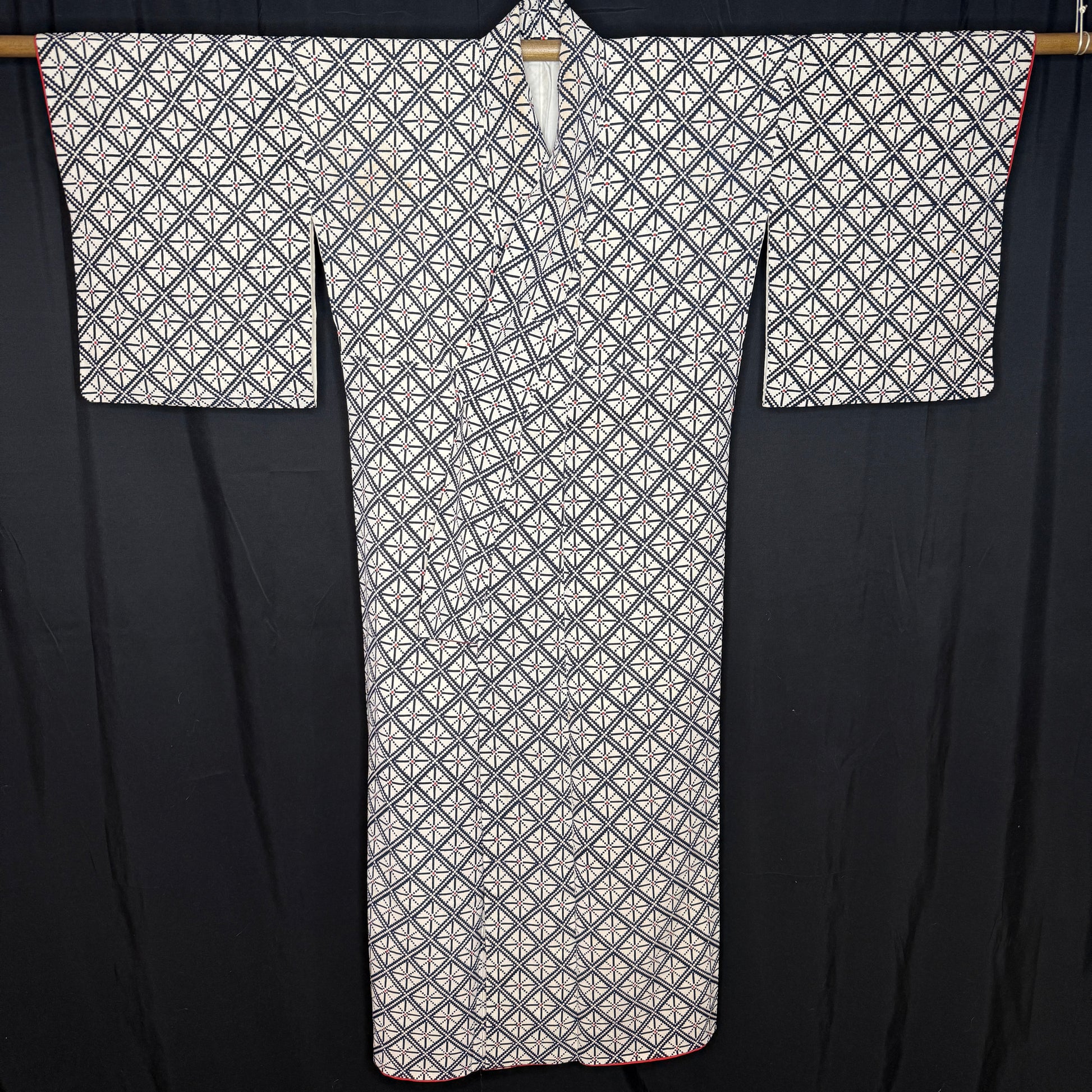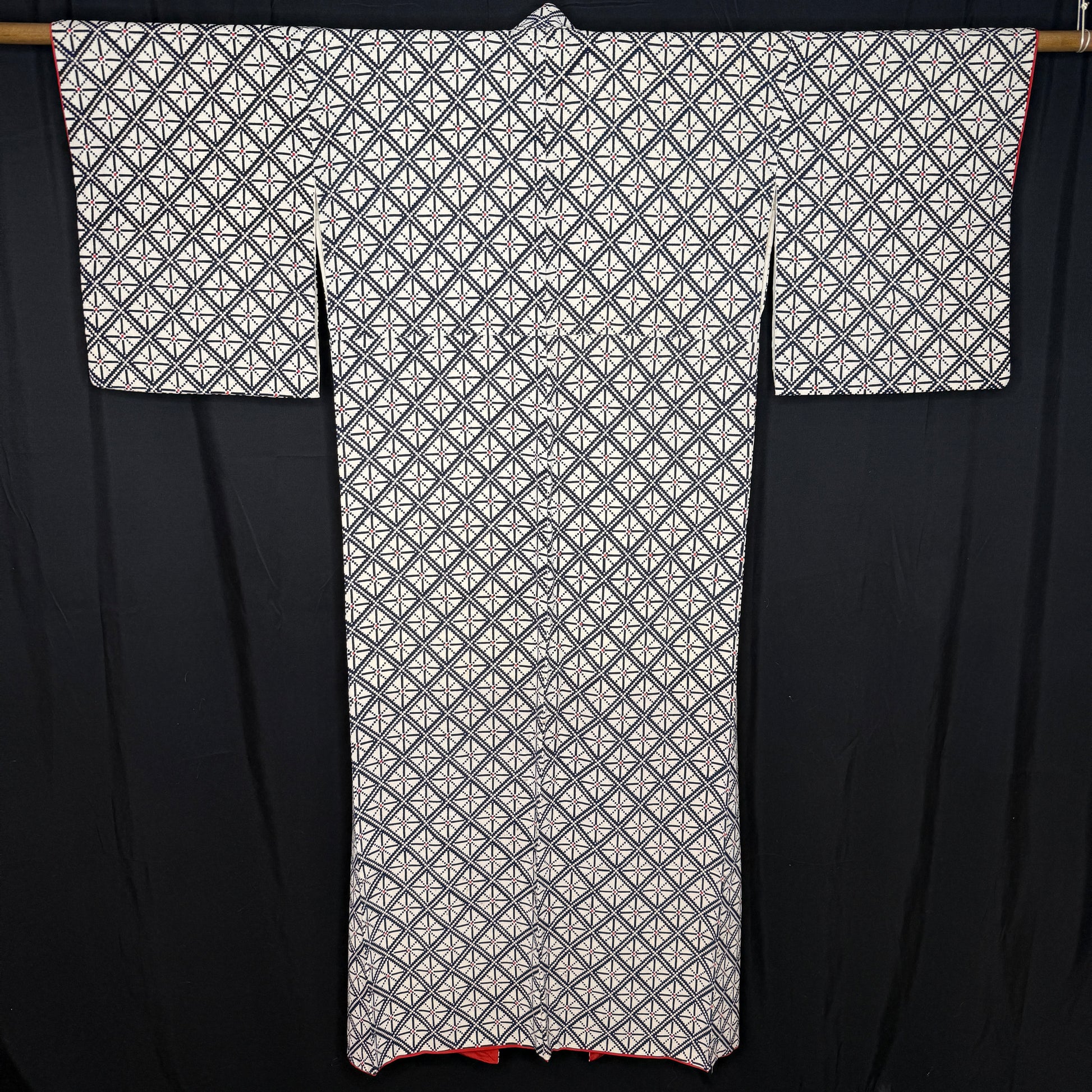 Fresh, graphic, and striking, this casual kimono features a repeating diamond lattice in deep indigo set against a soft white background, with each intersection punctuated with a tiny red center like a subtle spark. The rhythmic grid creates a beautifully structured look, almost architectural in its precision, while the small red accents add just enough warmth and personality.