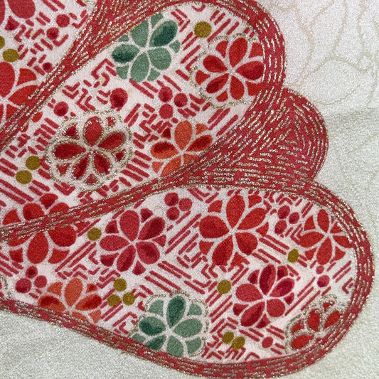 Striking and celebratory, this vintage furisode kimono commands attention with sweeping chrysanthemums blooming across a vivid green background. Oversized red, white, and golden yellow spider mums cascade, their petals enhanced with gold leaf and fine couching that catch the light with every movement. Dozens more are outined in white.