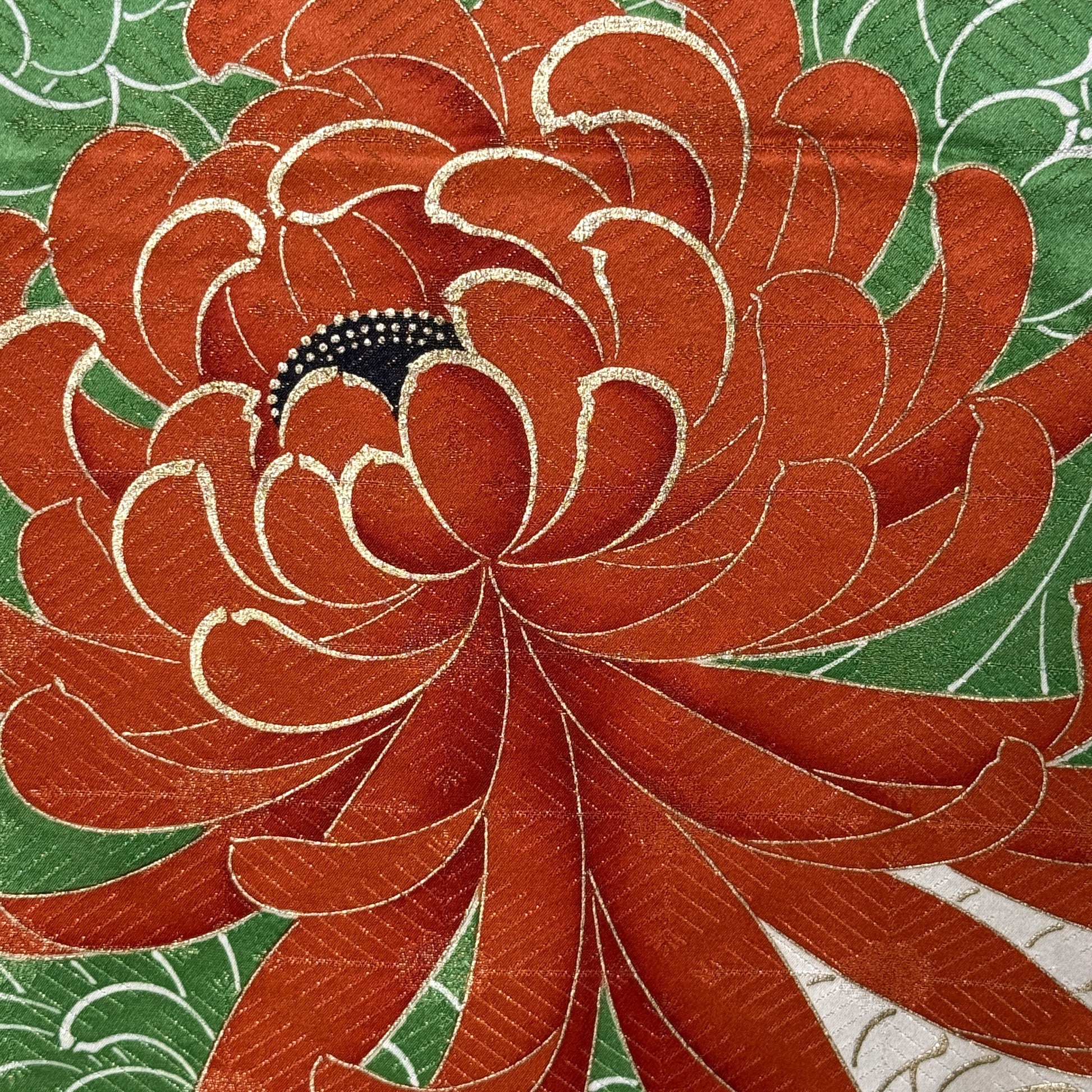 Beneath the surface, a refined pine diamond jacquard and an overall woven gold metallic shimmer add depth and texture, elevating the composition from bold to truly luxurious. The chrysanthemums, a symbol of longevity and refinement, lend timeless cultural significance. Festive yet regal!