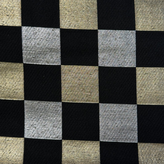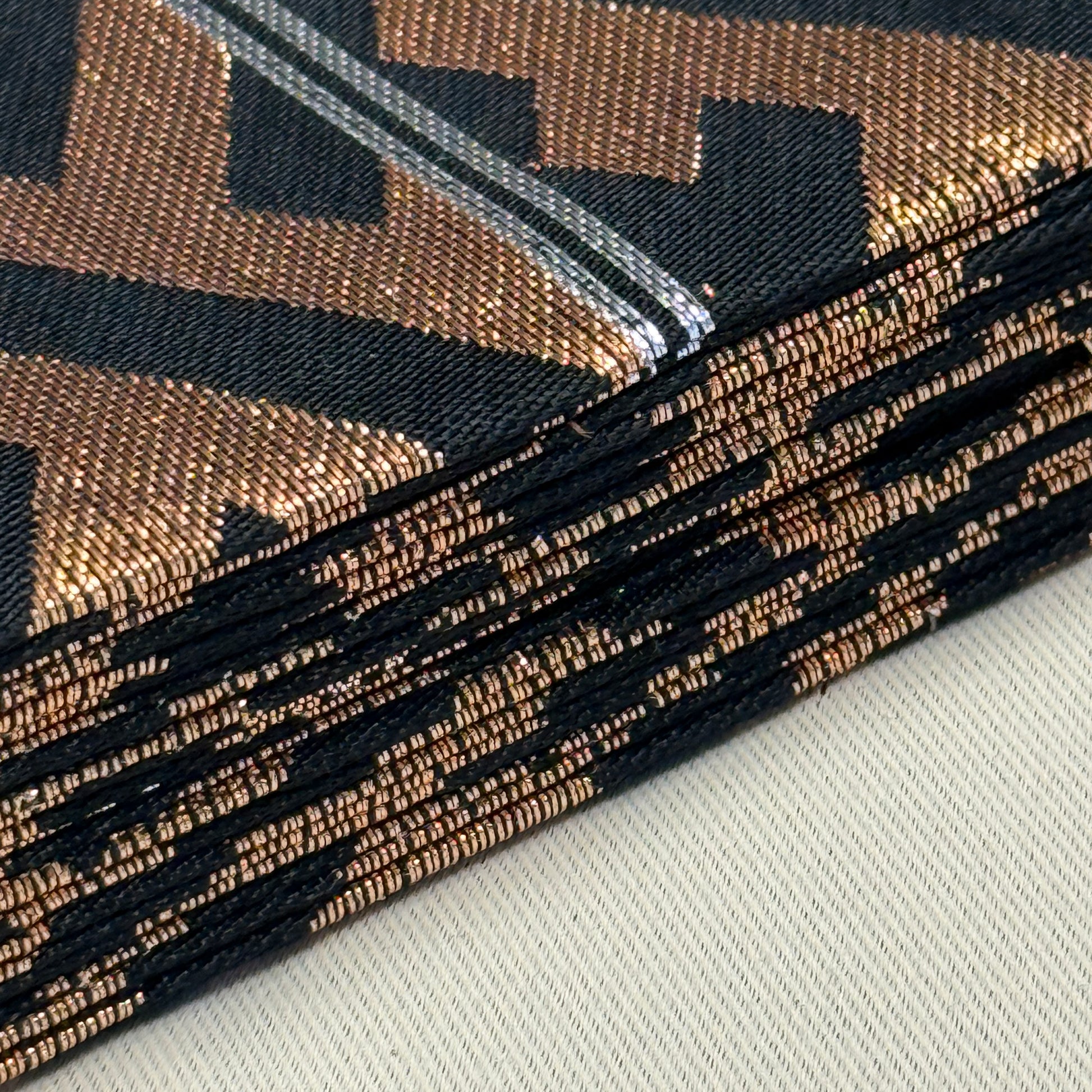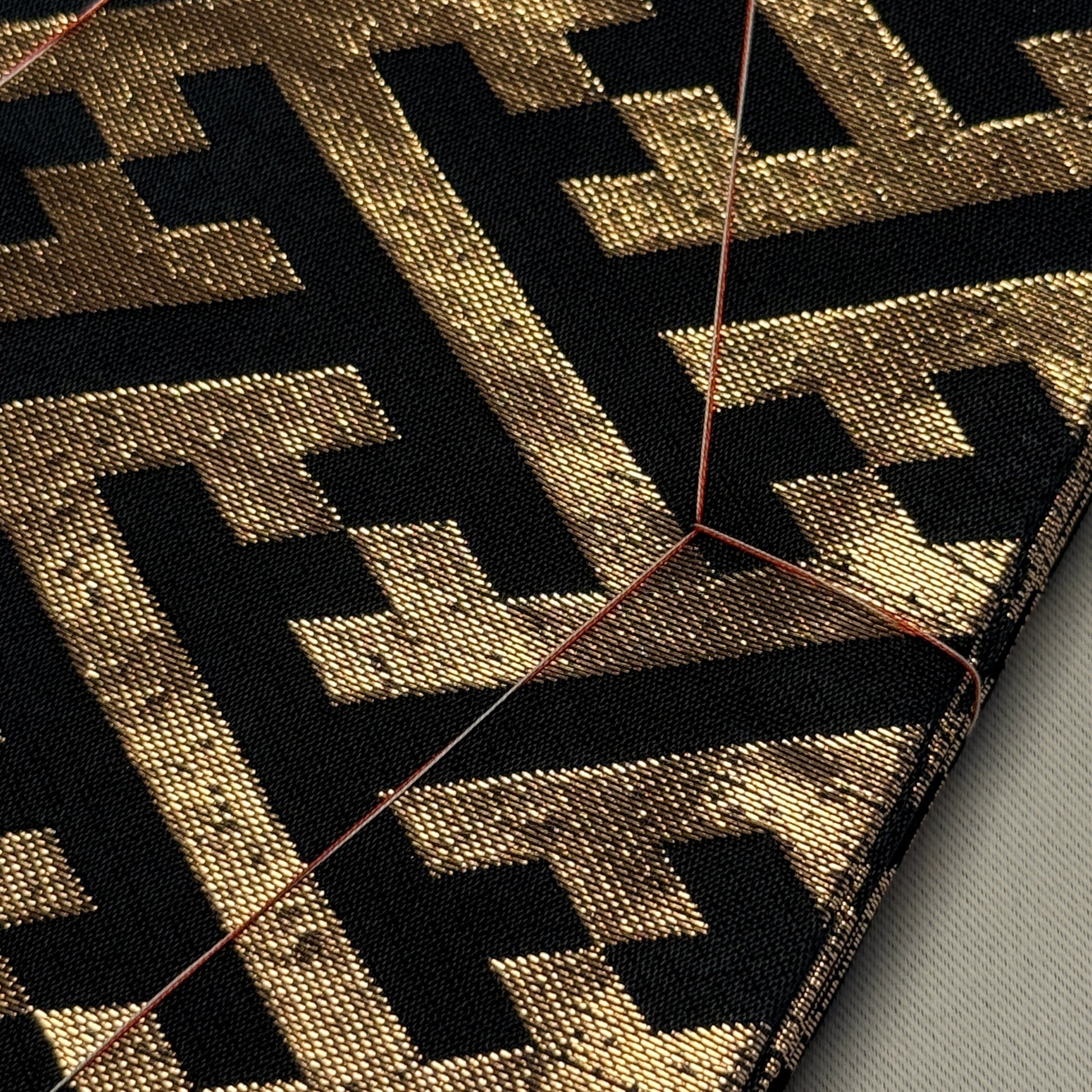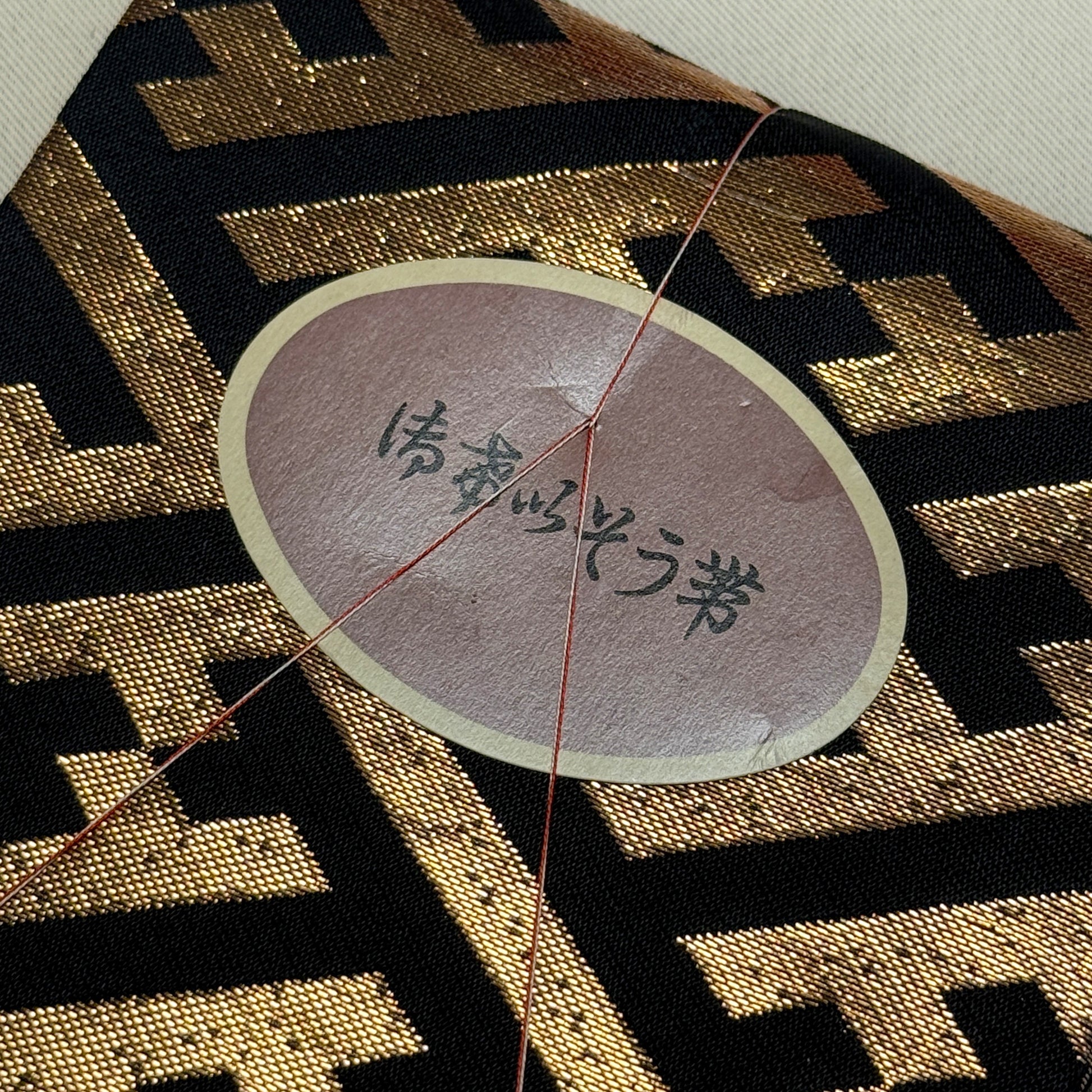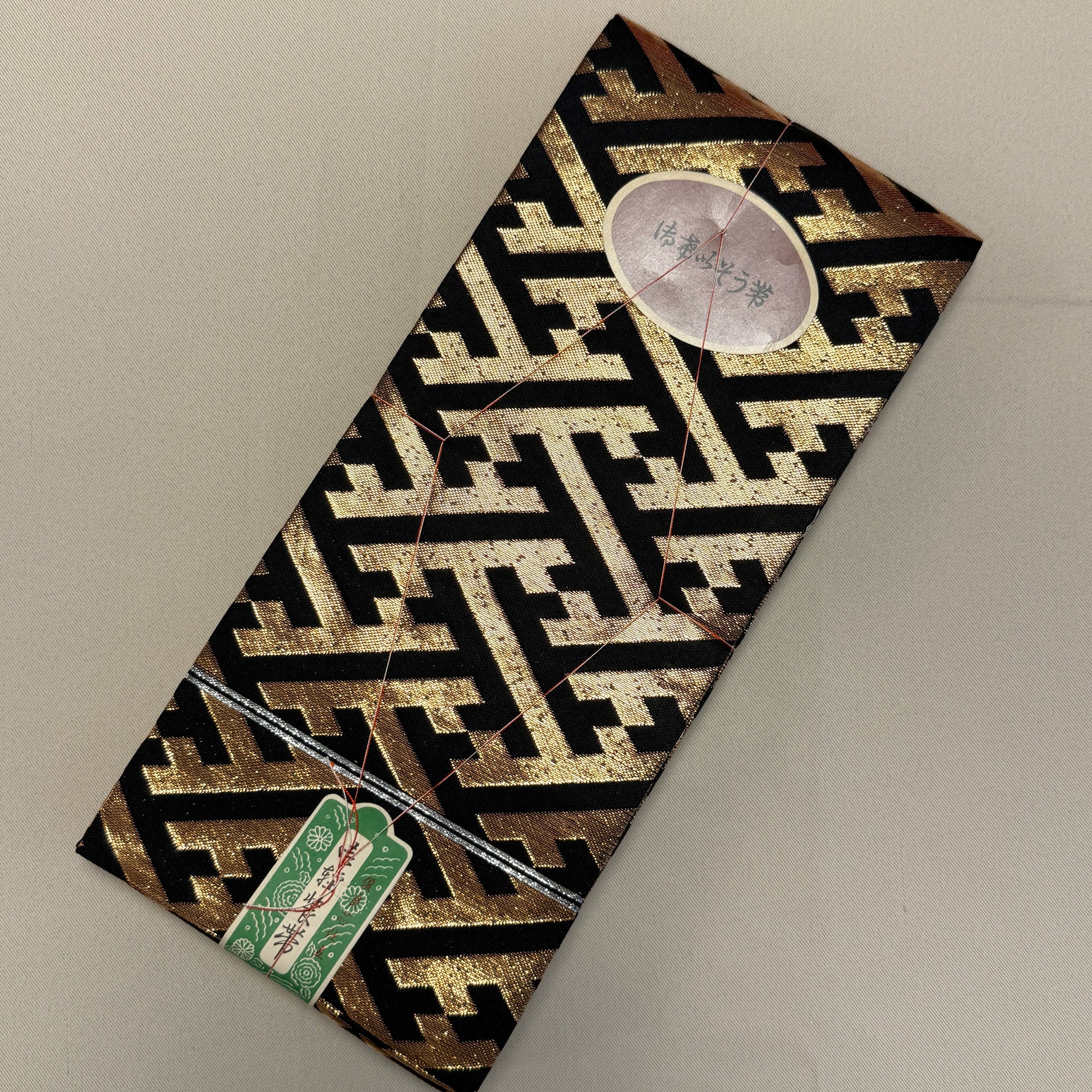 Bold, architectural, and striking, this han obi commands attention from across the room. A black background sets the stage for luminous gold geometric patterning that forms an interlocking maze of strong lines and angles. The metallic threads shimmer with movement, creating depth and drama while maintaining a clean, modern aesthetic. With the original tags still attached, this obi carries the rare appeal of preserved vintage condition.