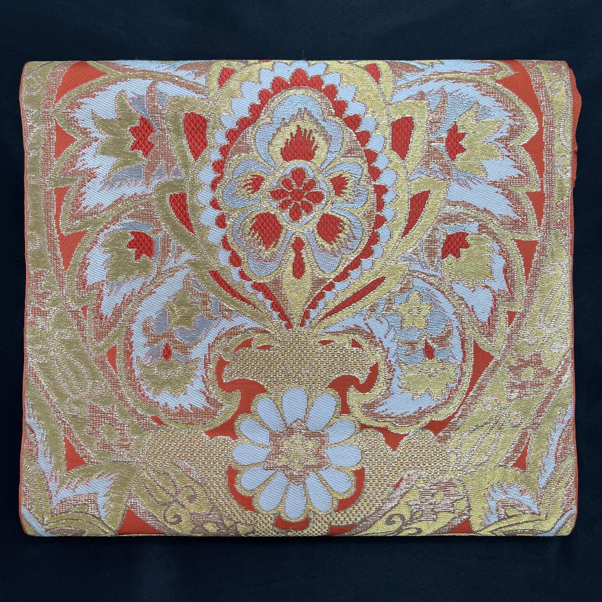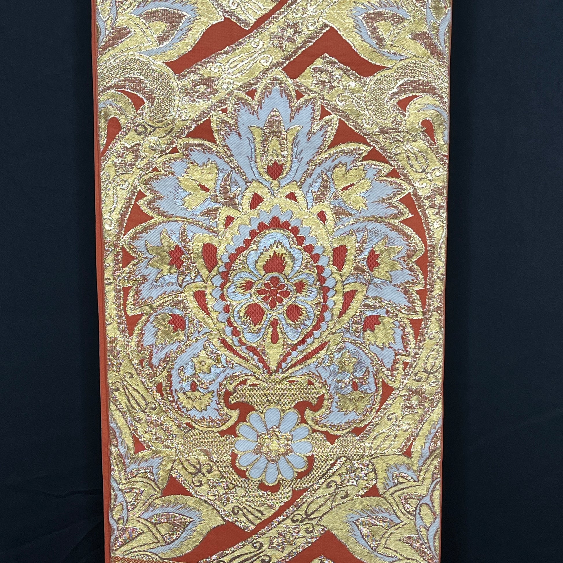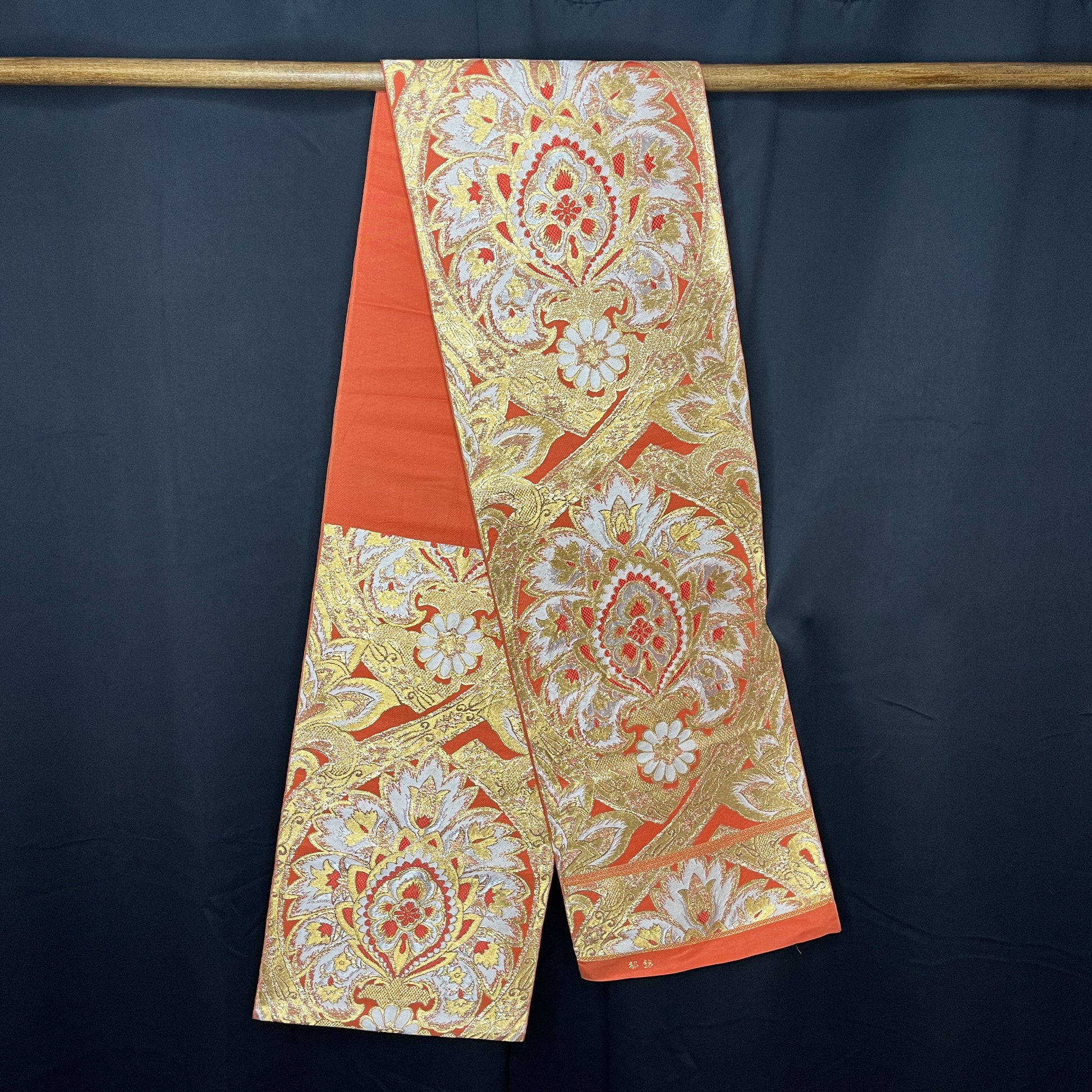 This listing is for a traditional fukuro style obi that features a bright and bold design that is sure to prompt conversation. The intricate, ornate weave features large abstract florals with many layers of petals and detail.