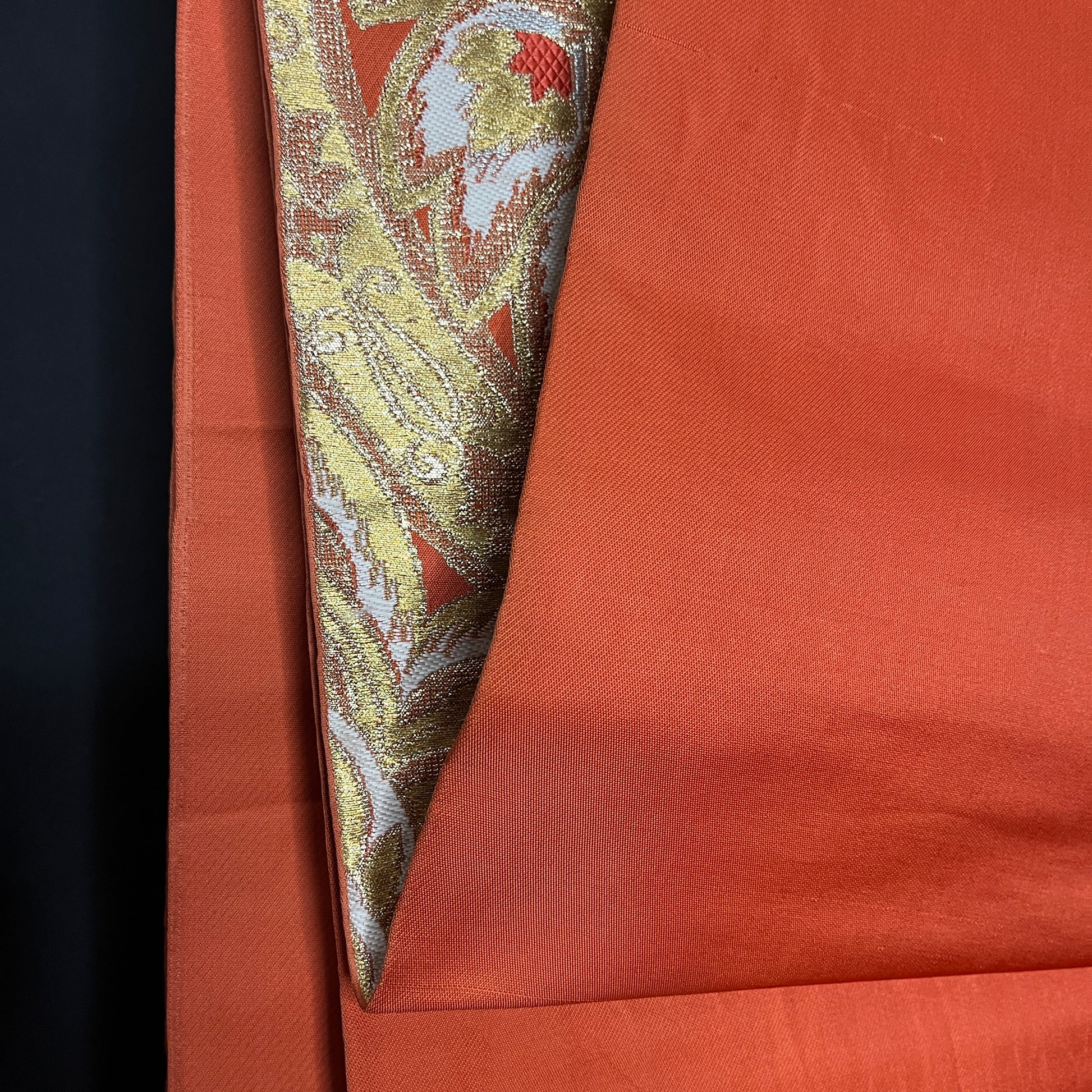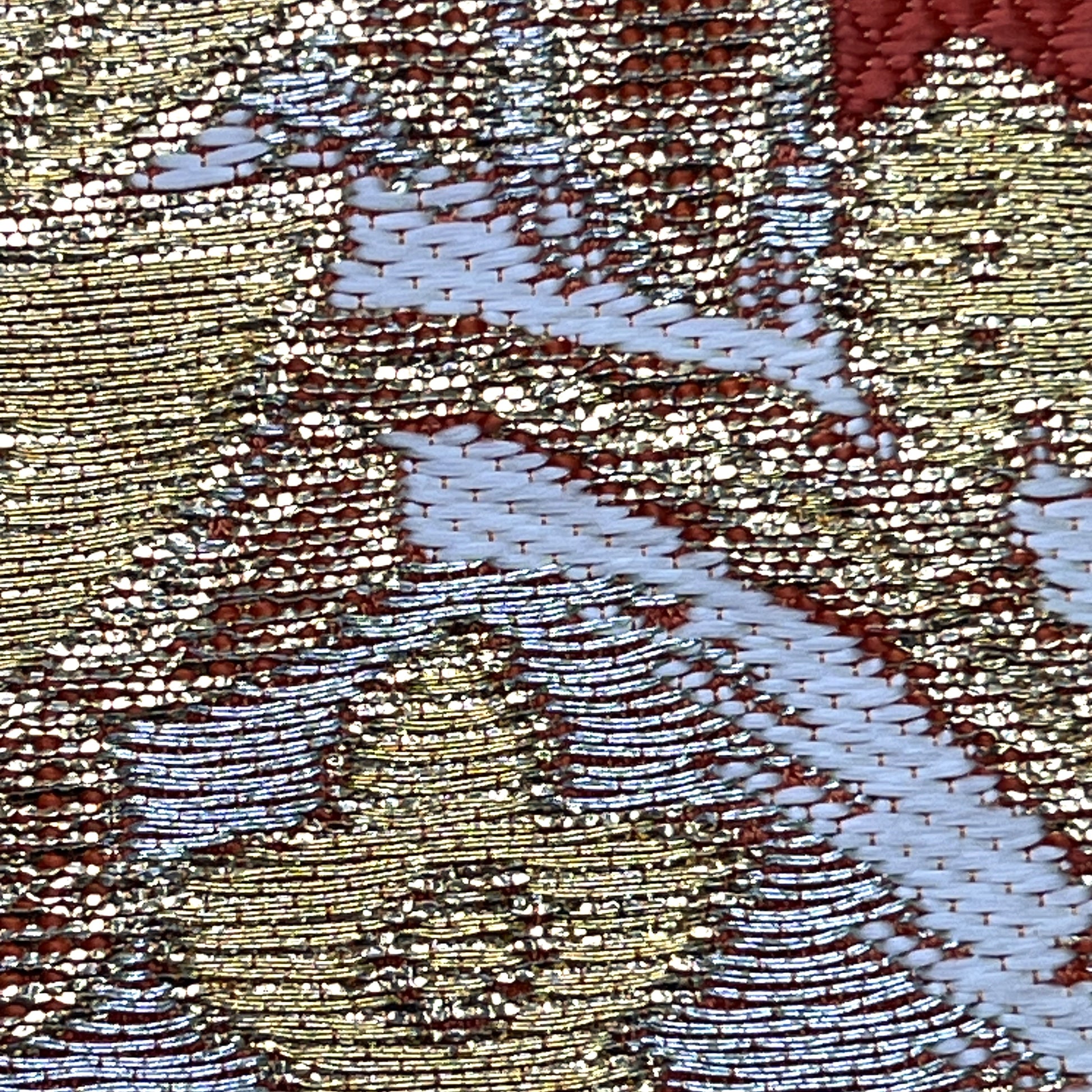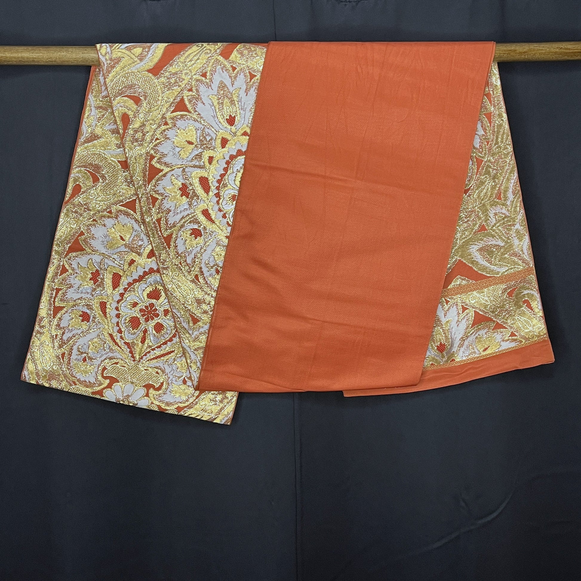 This is a fukuro obi - wide for the entire length, plain on the backside and a patterned design only on the front. There is a one yard "blank" section on the front, as is common with contemporary fukuro obi, where some cost can be saved by leaving it blank where the first wrap layer of the belt portion occurs, since it doesn't show to the public.