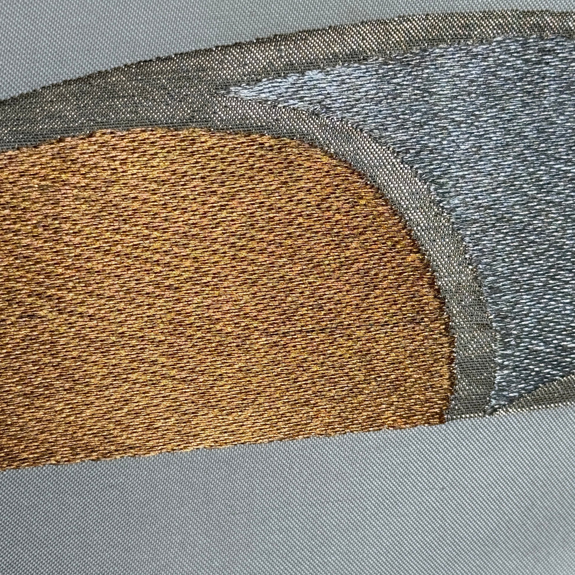 Soft curves and bold metallic tones come together in a composition that feels both modern and timeless. This tapestry highlights sweeping oval forms in gold and silver that drift across a neutral ground, creating a sense of movement and balance.