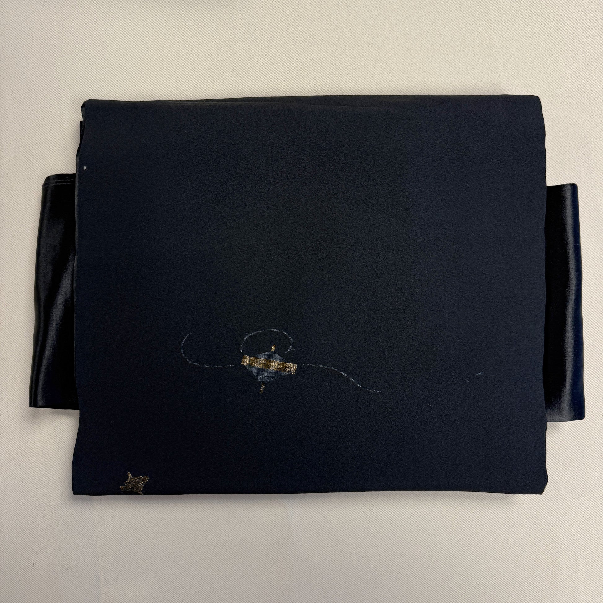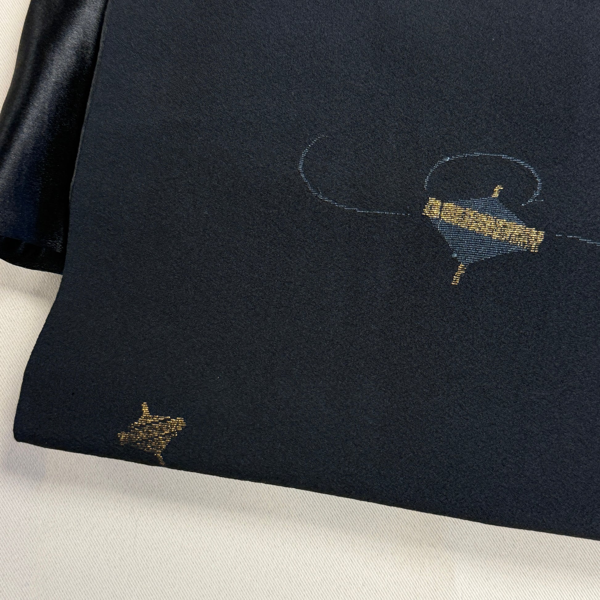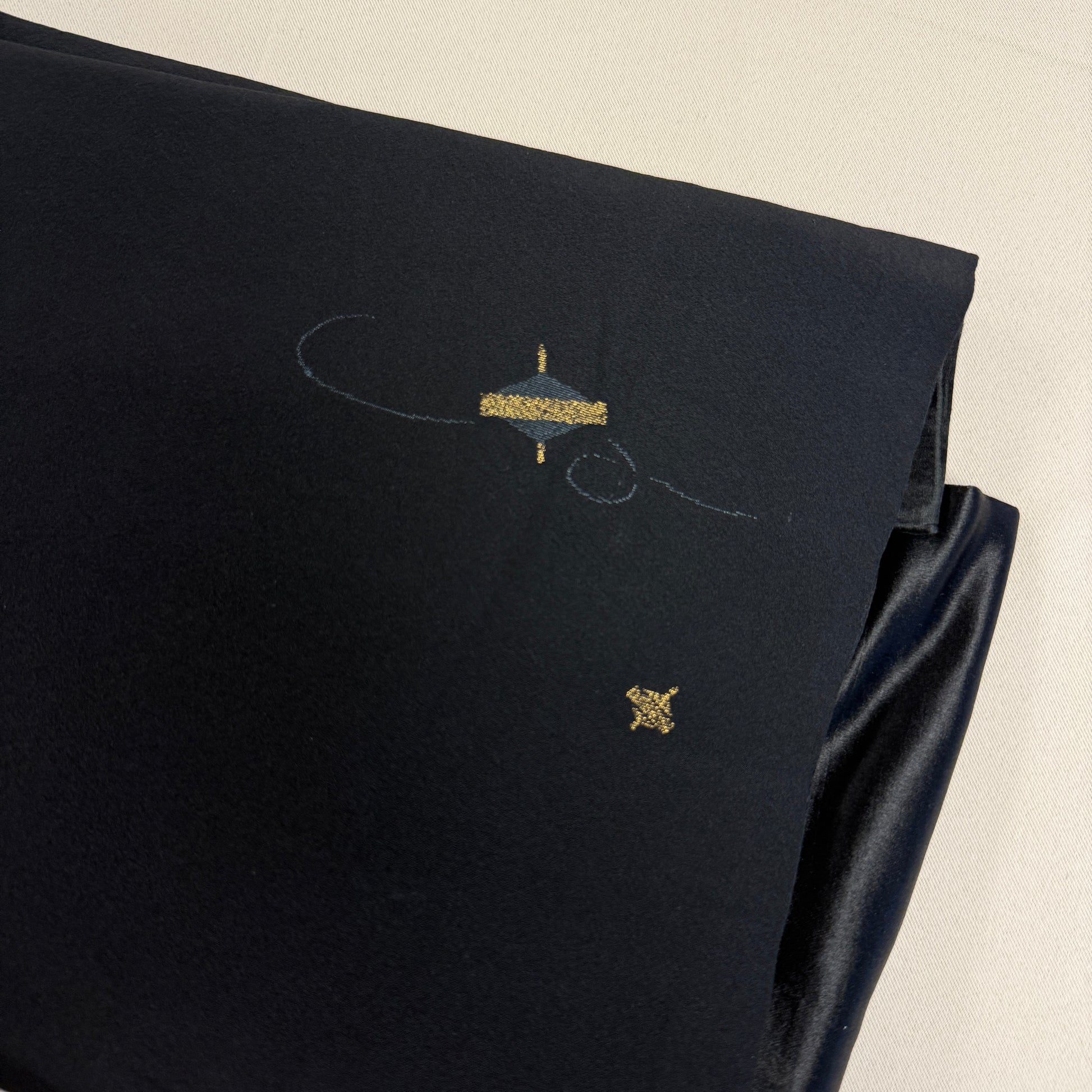 This refined nagoya obi embodies subtle elegance, with its deep black background accented by delicate motifs of spinning tops in shimmering gold. The playful yet restrained design creates a graceful sense of movement, recalling traditional childhood games while maintaining an air of sophistication. Its simplicity makes it versatile, perfect for pairing with patterned kimono to achieve a balanced ensemble. A lovely choice for those who appreciate refined minimalism with a touch of charm.