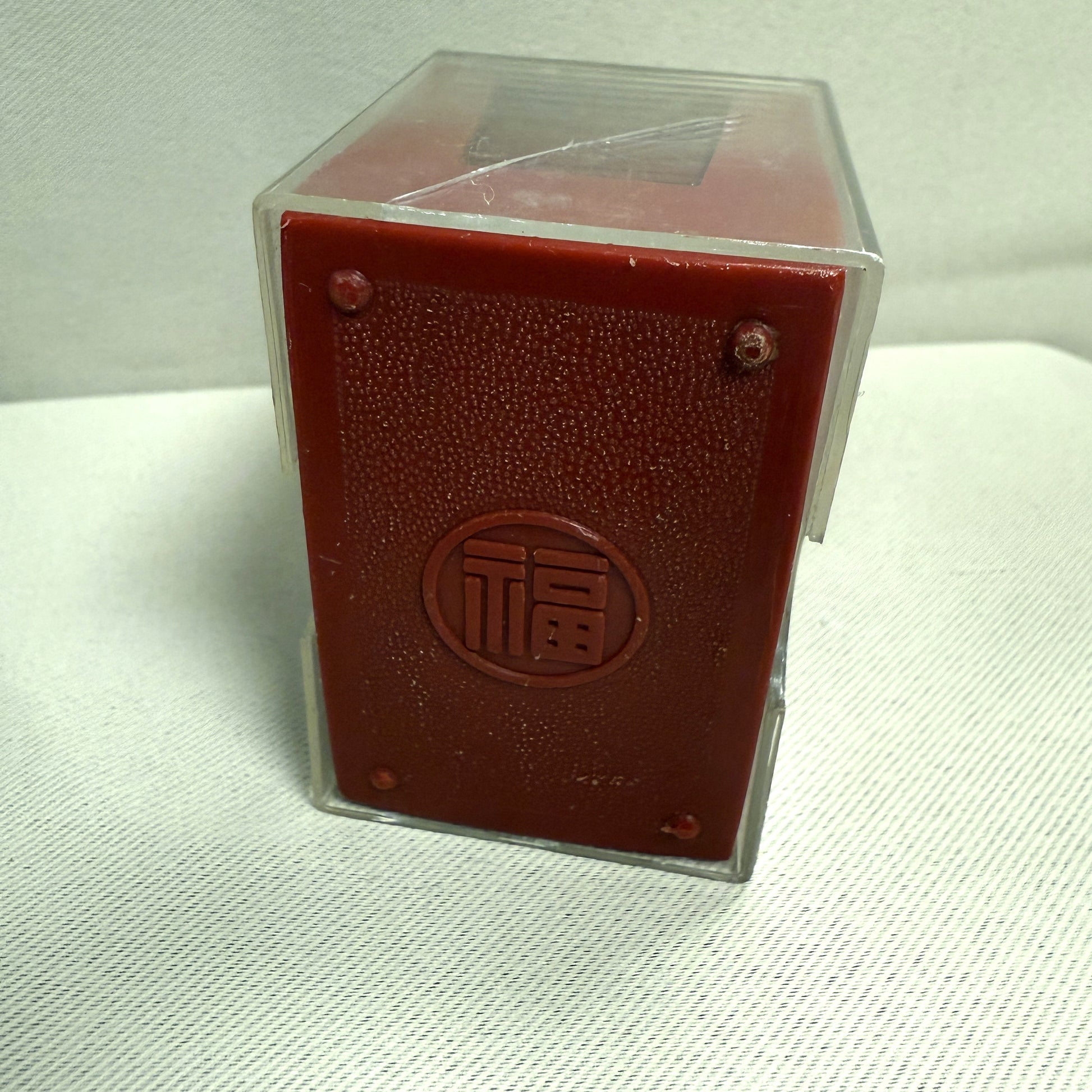 The set is housed in a clear plastic lift top case with a deep red base, a widely used style. The underside features the stamped characters meaning "good fortune", a traditional symbol often used on game sets for auspicious play. The case shows signs of age with a crack in the plastic and light scuffing, but still sturdy enough to hold the cards.