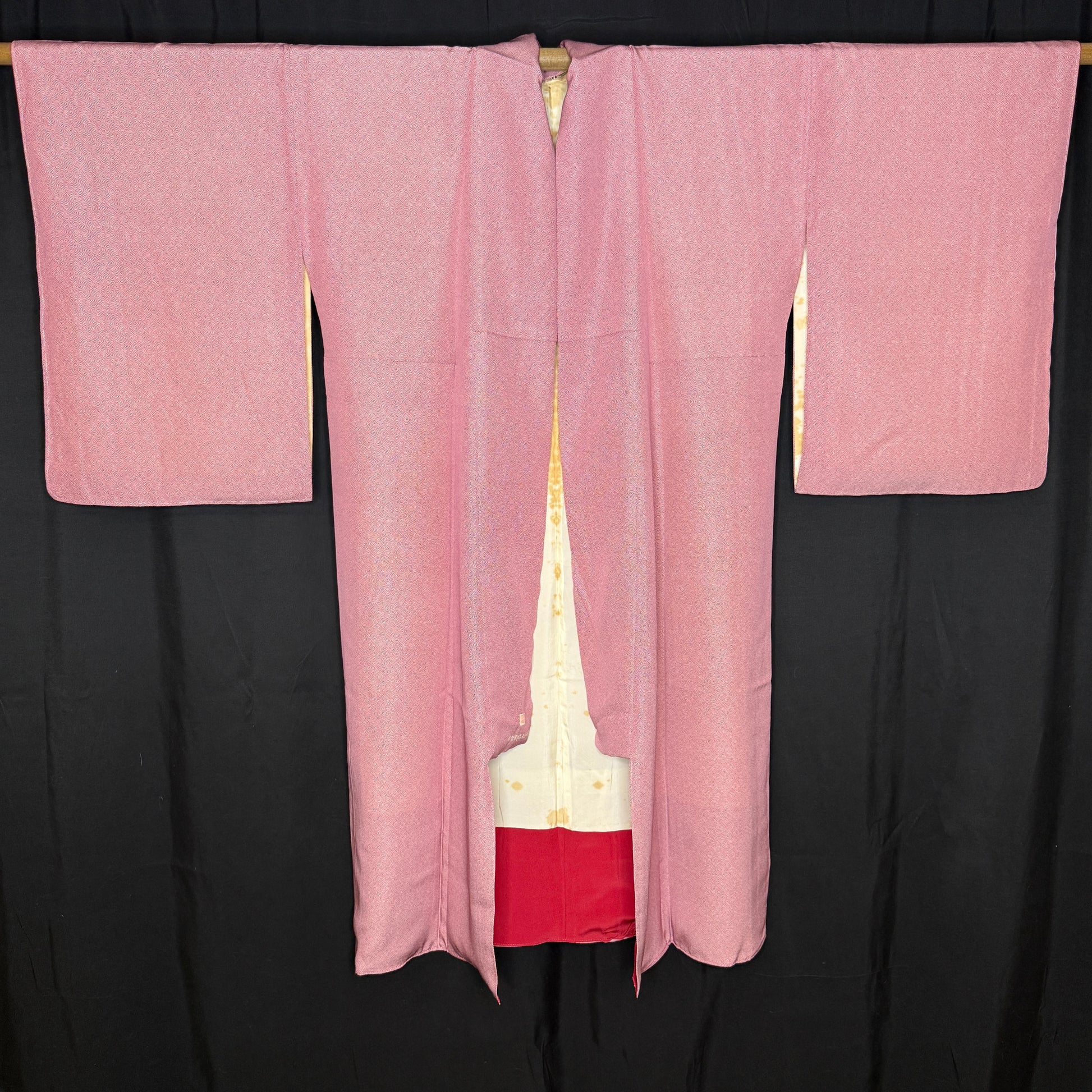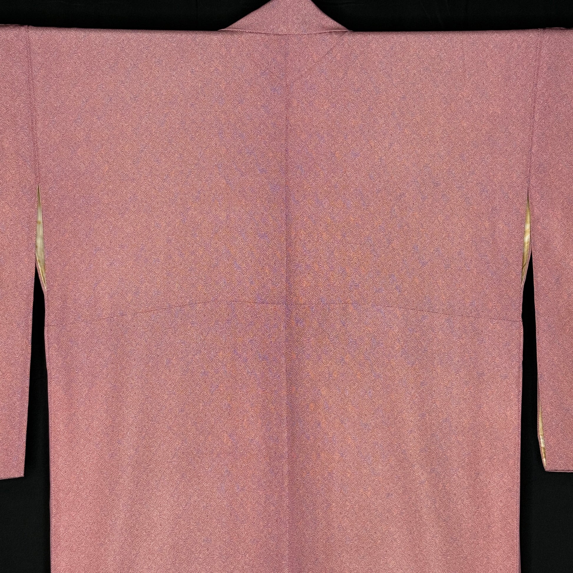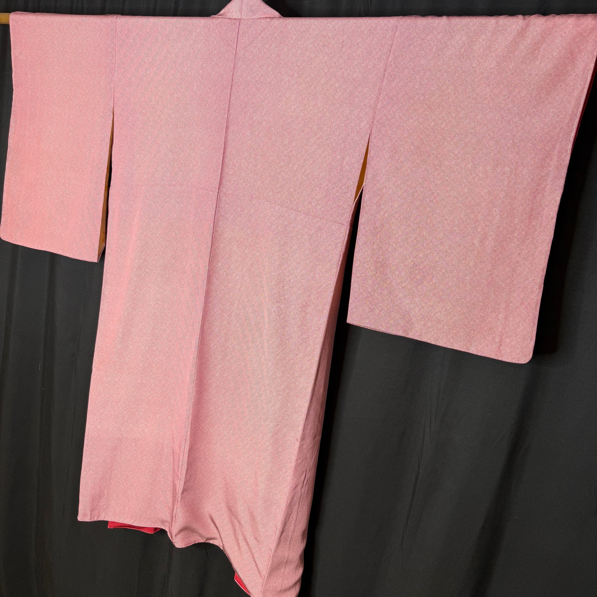 With a smooth texture, this beautifully understated vintage kimono robe features an allover fine komon (small repeat) pattern that creates gentle movement across a rosy, red background. Thousands of tiny dots form subtle waves that shift with the light, giving the silk depth while maintaining a calm, refined look.