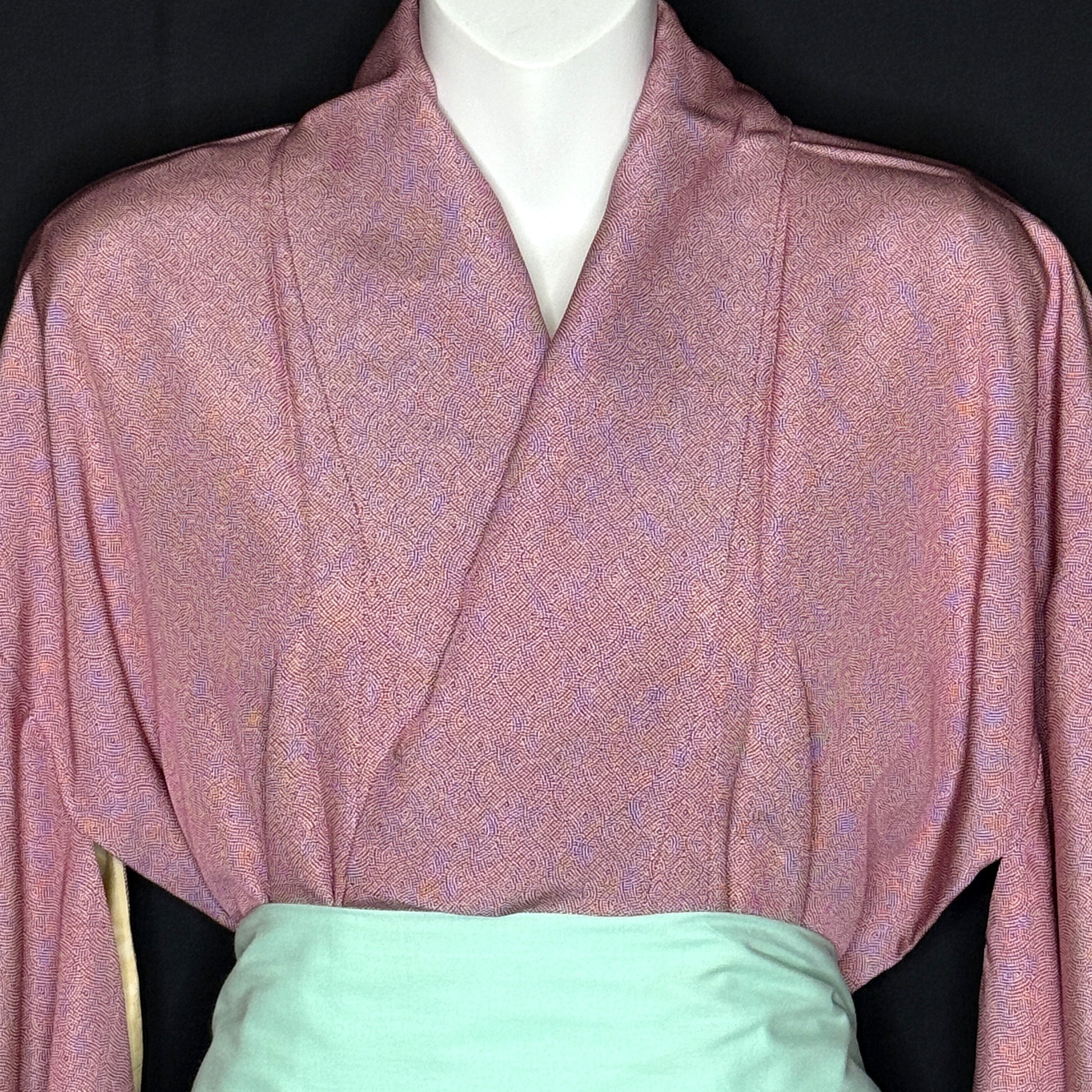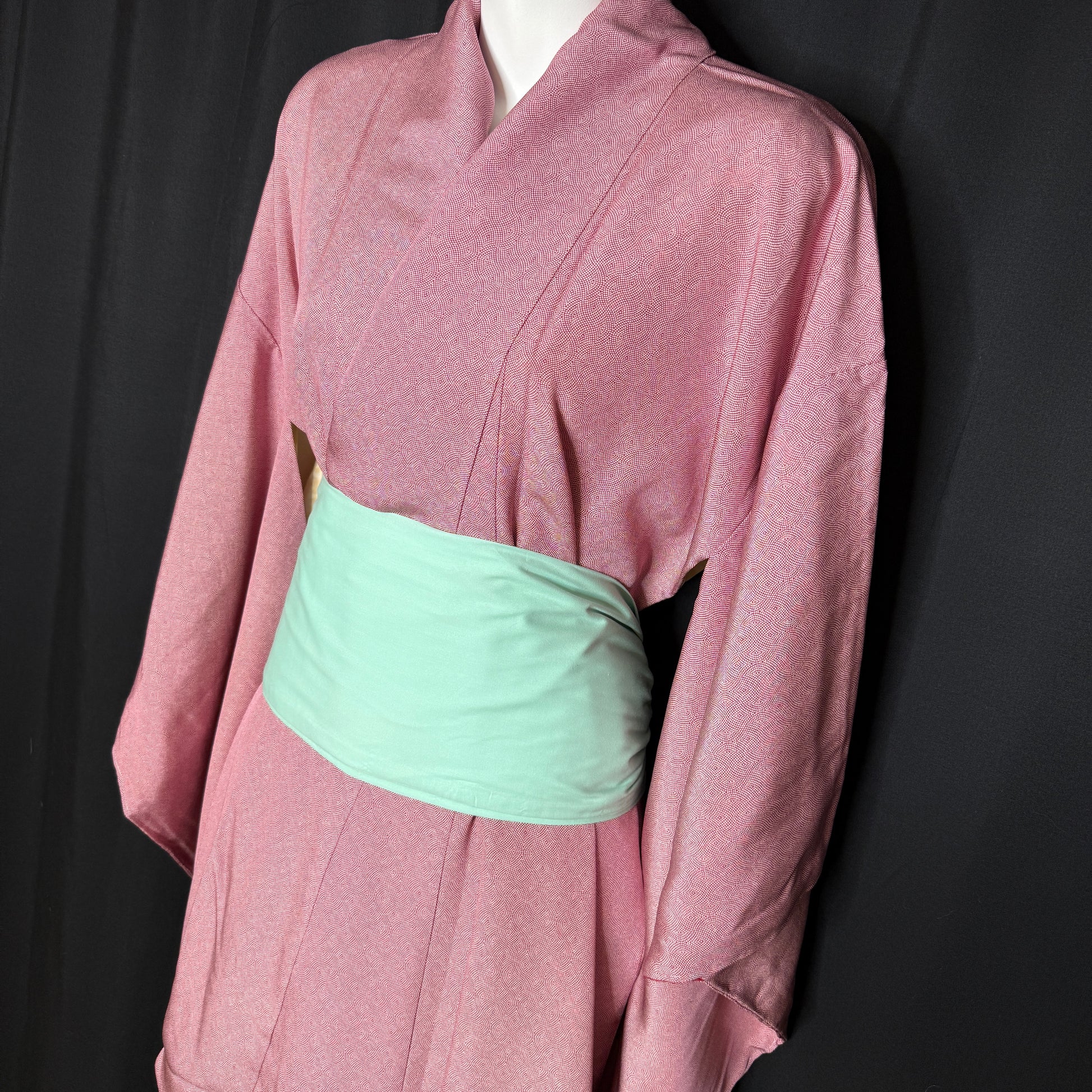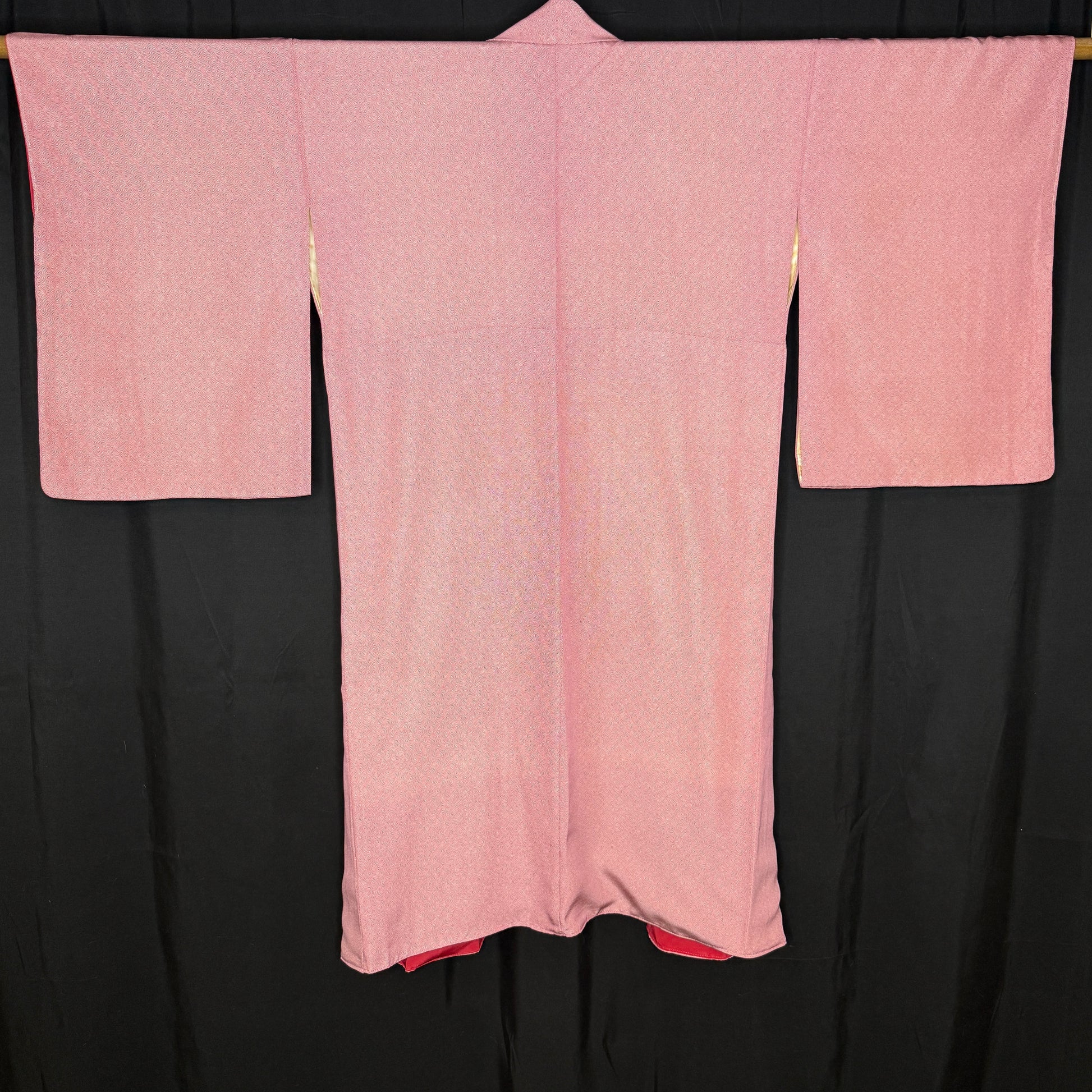 With a smooth texture, this beautifully understated vintage kimono robe features an allover fine komon (small repeat) pattern that creates gentle movement across a rosy, red background. Thousands of tiny dots form subtle waves that shift with the light, giving the silk depth while maintaining a calm, refined look.