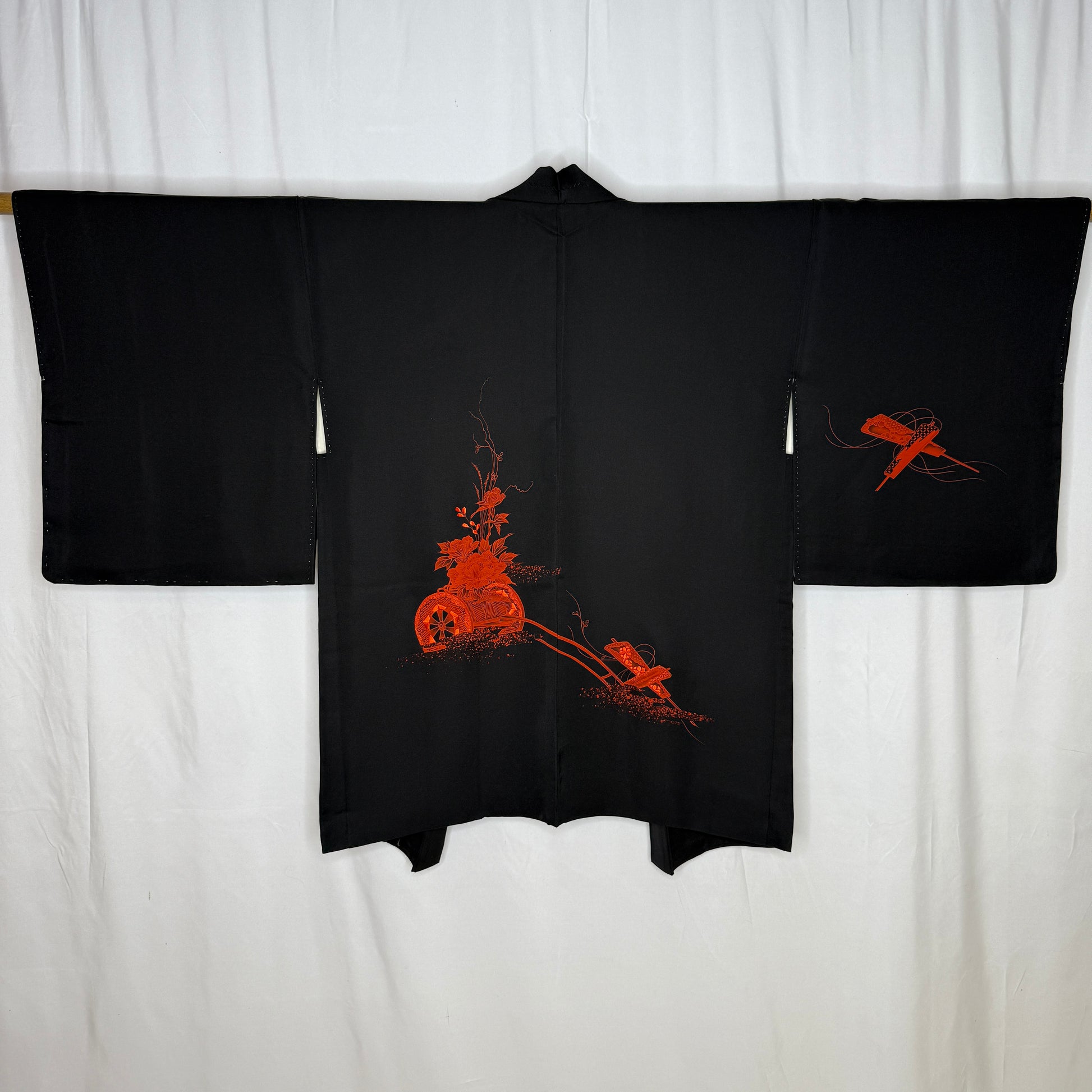 Make an unforgettable entrance with this striking haori jacket that glows with vivid embroidery accents and refined tradition. A bright vermilion hanaguruma floral cart anchors the design, with its blossoms and wheels rendered with rich stitched details. Closed folding fan pairs appear at the end of the cart, sleeves, and front panel, offering a symbol of celebration and elegance.