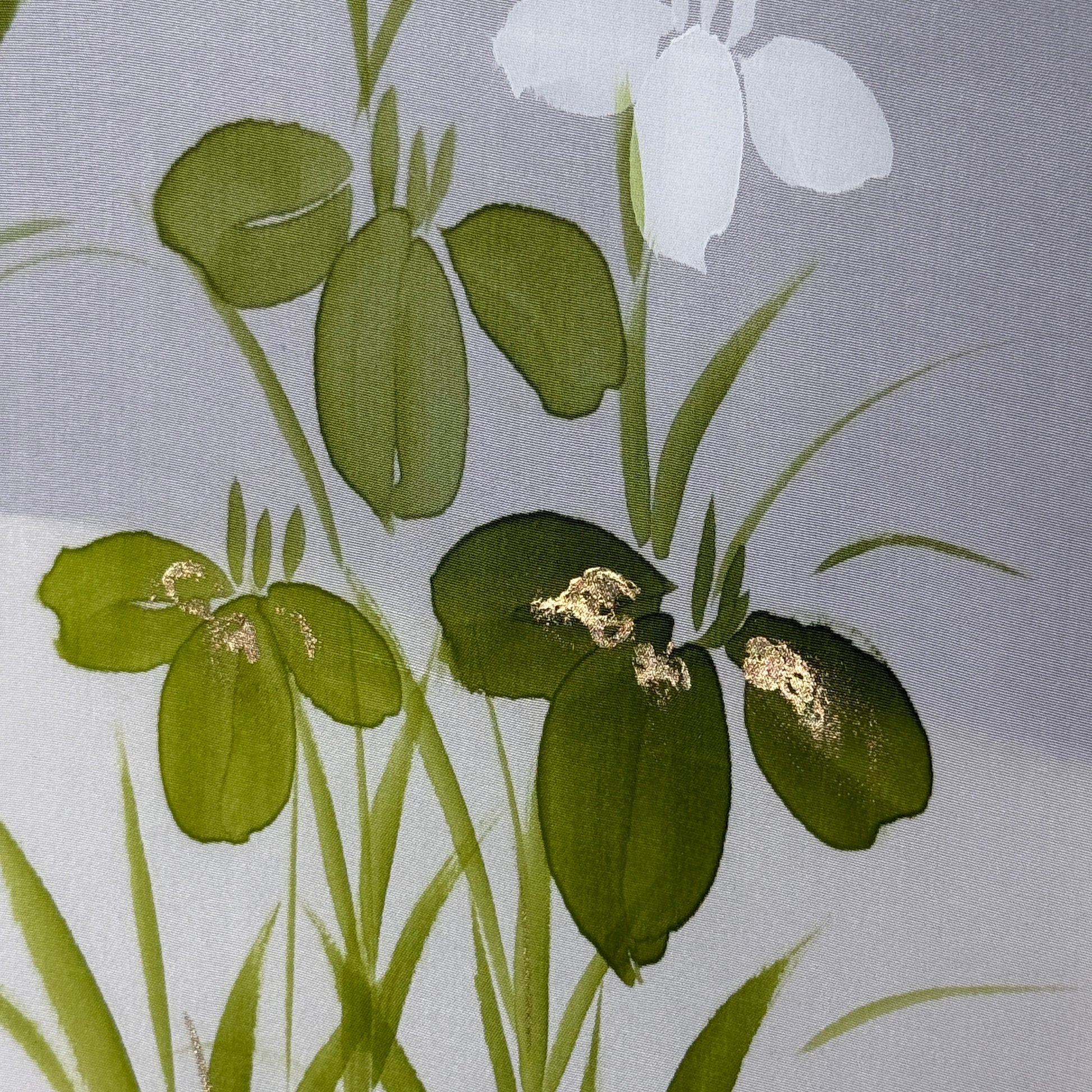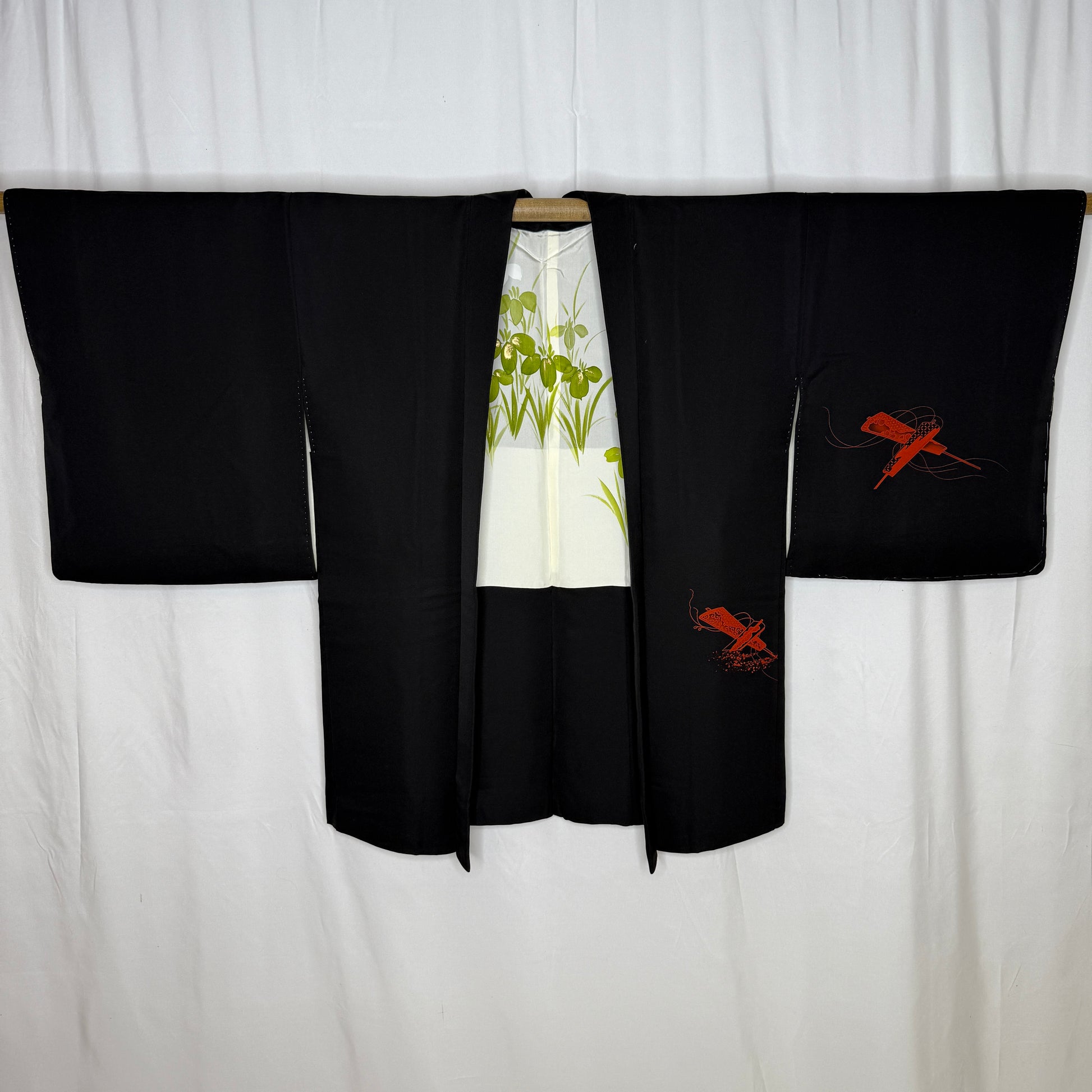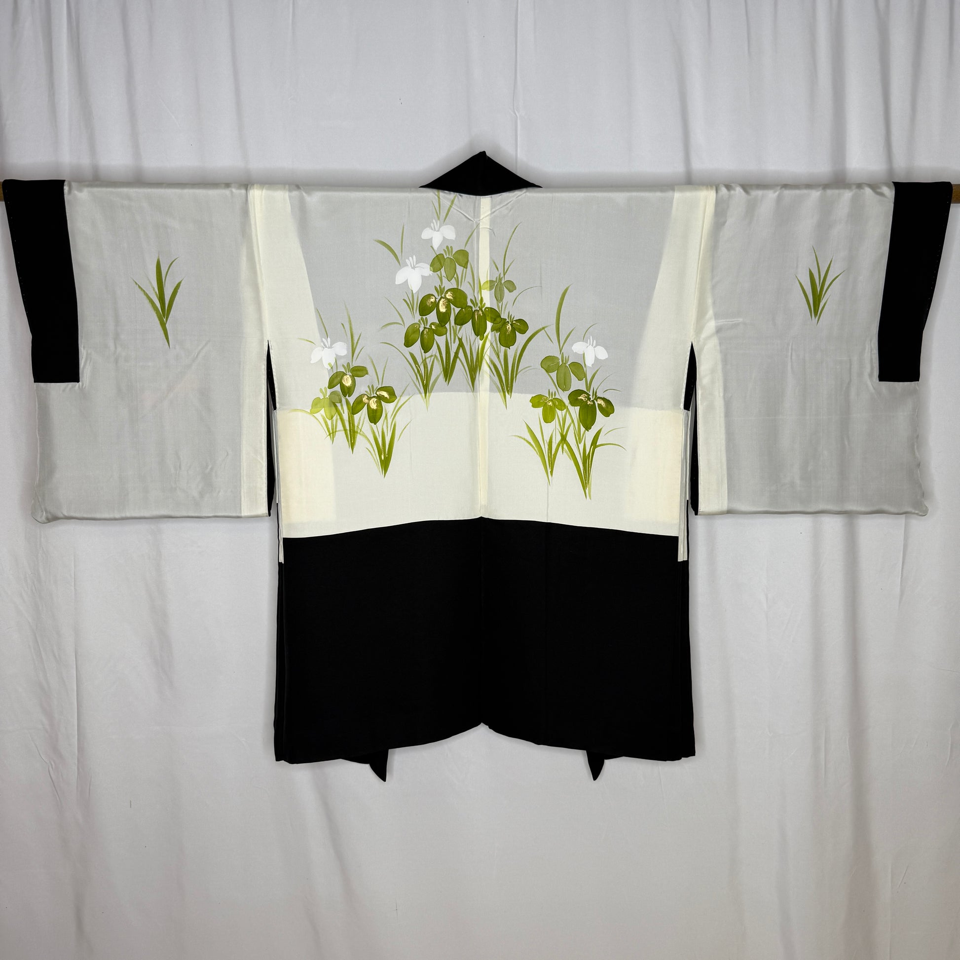 Inside, the lining bursts into a serene garden of green and white irises, creating a refreshing contrast. (This haori was hand-stitched with hidden seams, so it is reversible!)