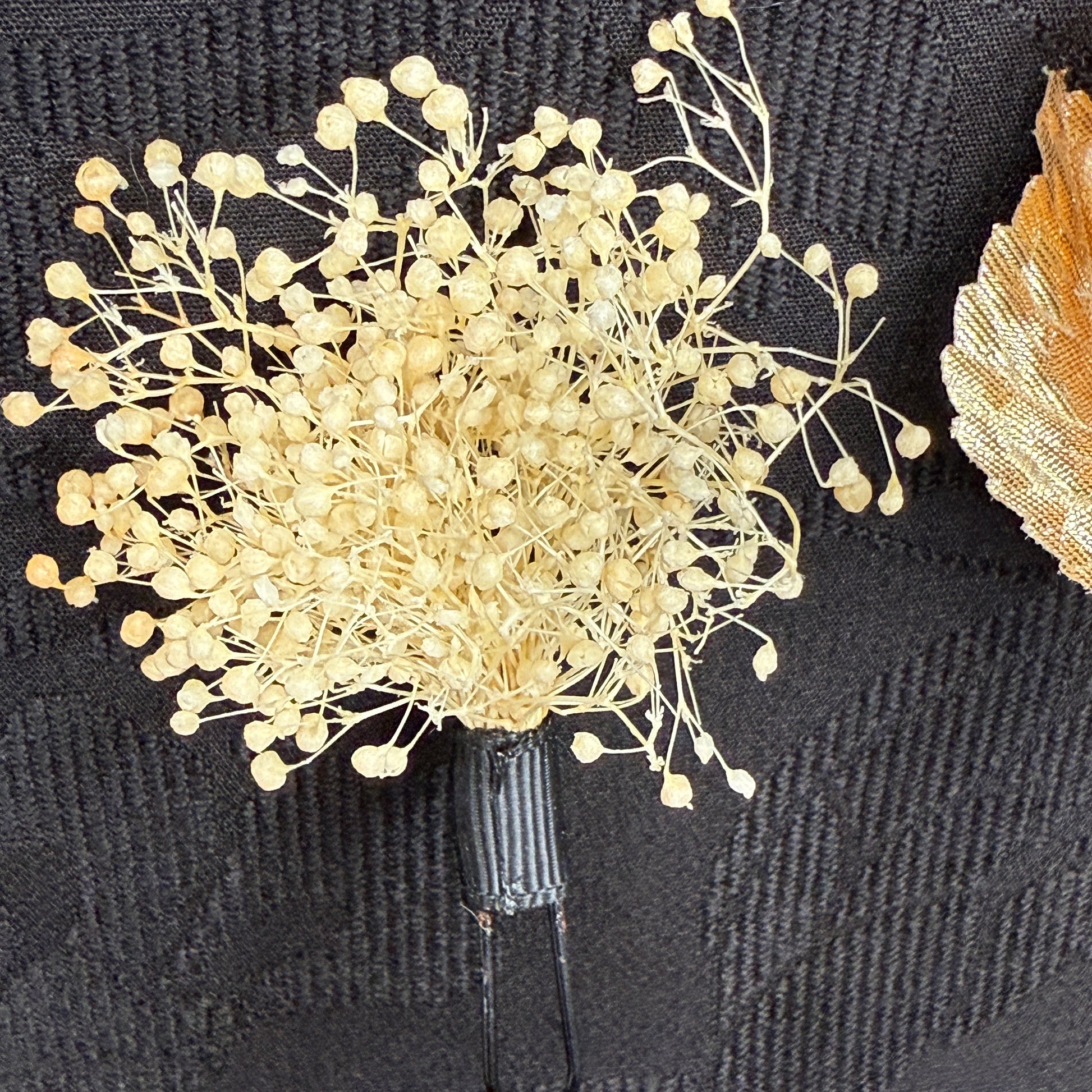 Elegant and organic, this trio of vintage Japanese kanzashi hair pins captures the mellow beauty of autumn. The central piece features satin buds in warm gold and persimmon orange, paired with a metallic leaf and delicate gold-colored beads. The two other pins are airy sprays of preserved flora creating a natural balance of texture and lightness, echoing the simplicity of ikebana (flower arranging) design. Fall themed styling that embodies the quiet elegance of a Japanese autumn.