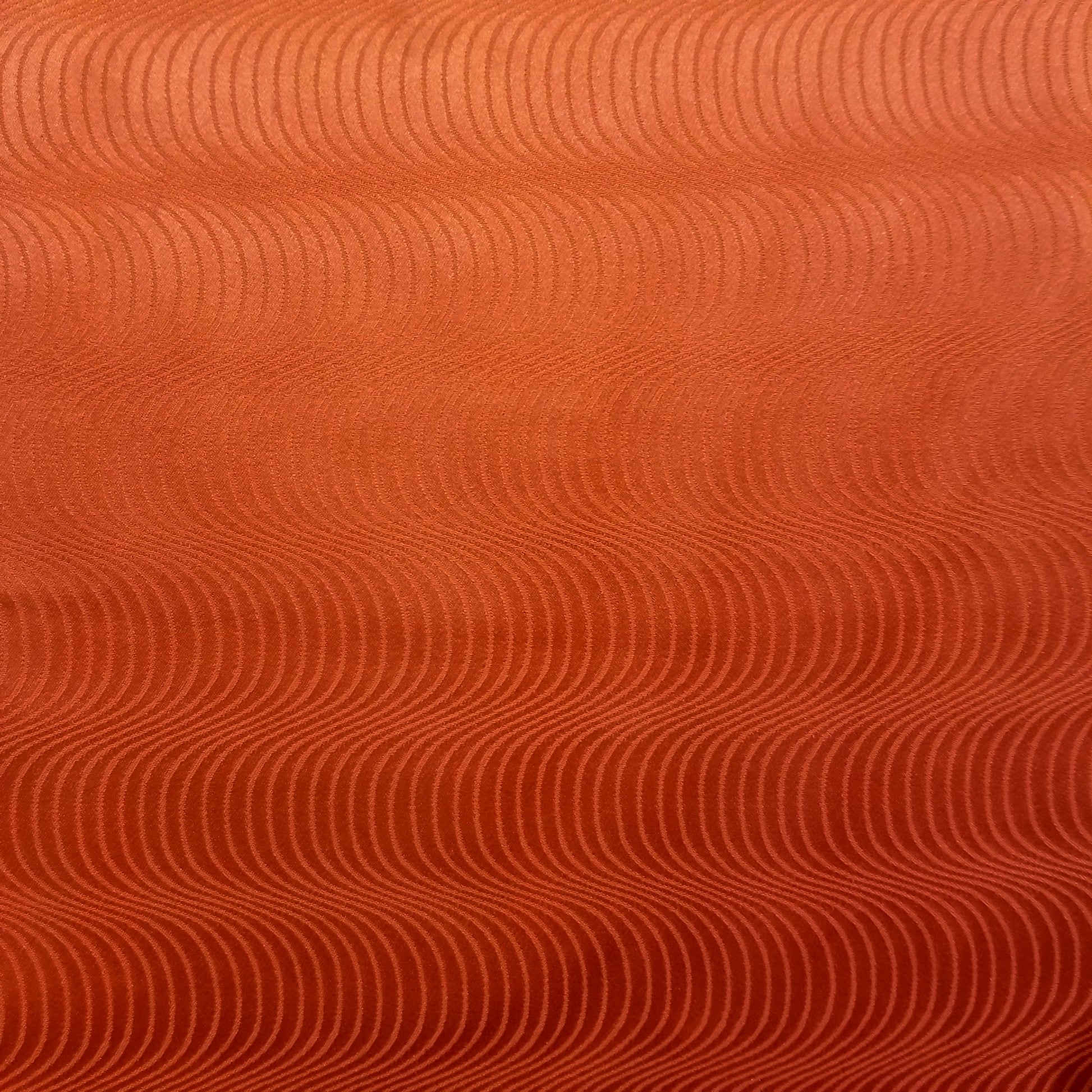 The background color is a rich tangerine, with a woven wavy band pattern.