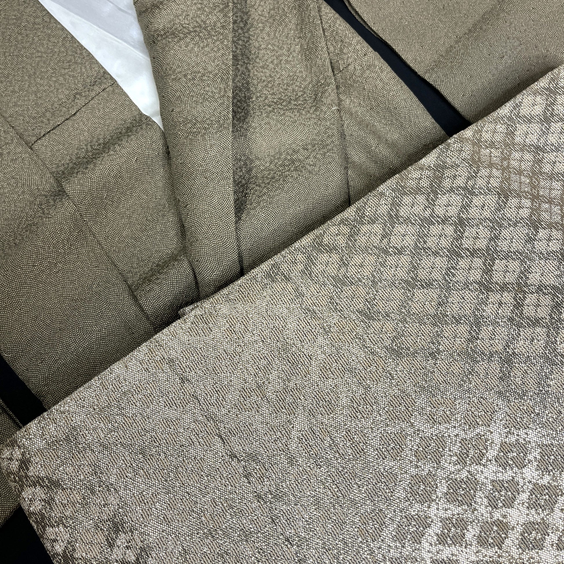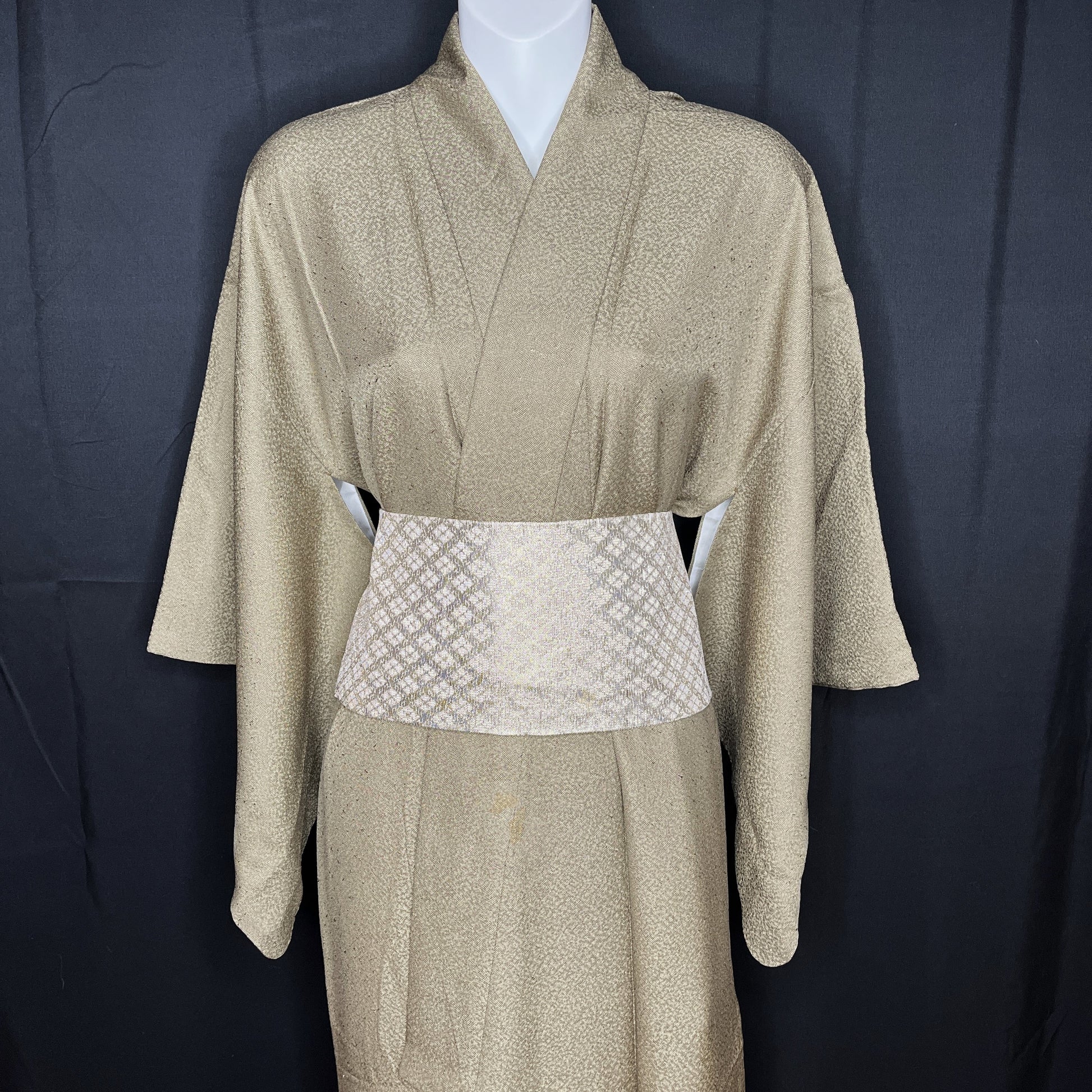The obi goes so well with the kimono - similar color in a slightly larger-scale motif and a bit of shine. It is a nagoya style obi with shimmering metallic gold in a woven diamond pattern. Nagoya obi have a specialized shape - folded and sewn to a 6-7" width for the portion that wraps around the waist but left wide (13-14") for about one yard at the end which would be tied into an elaborate bow. As is typical, the length that would be hidden beneath the obi's top layer is not patterned - in this case it is white, the same as the backside of the obi.