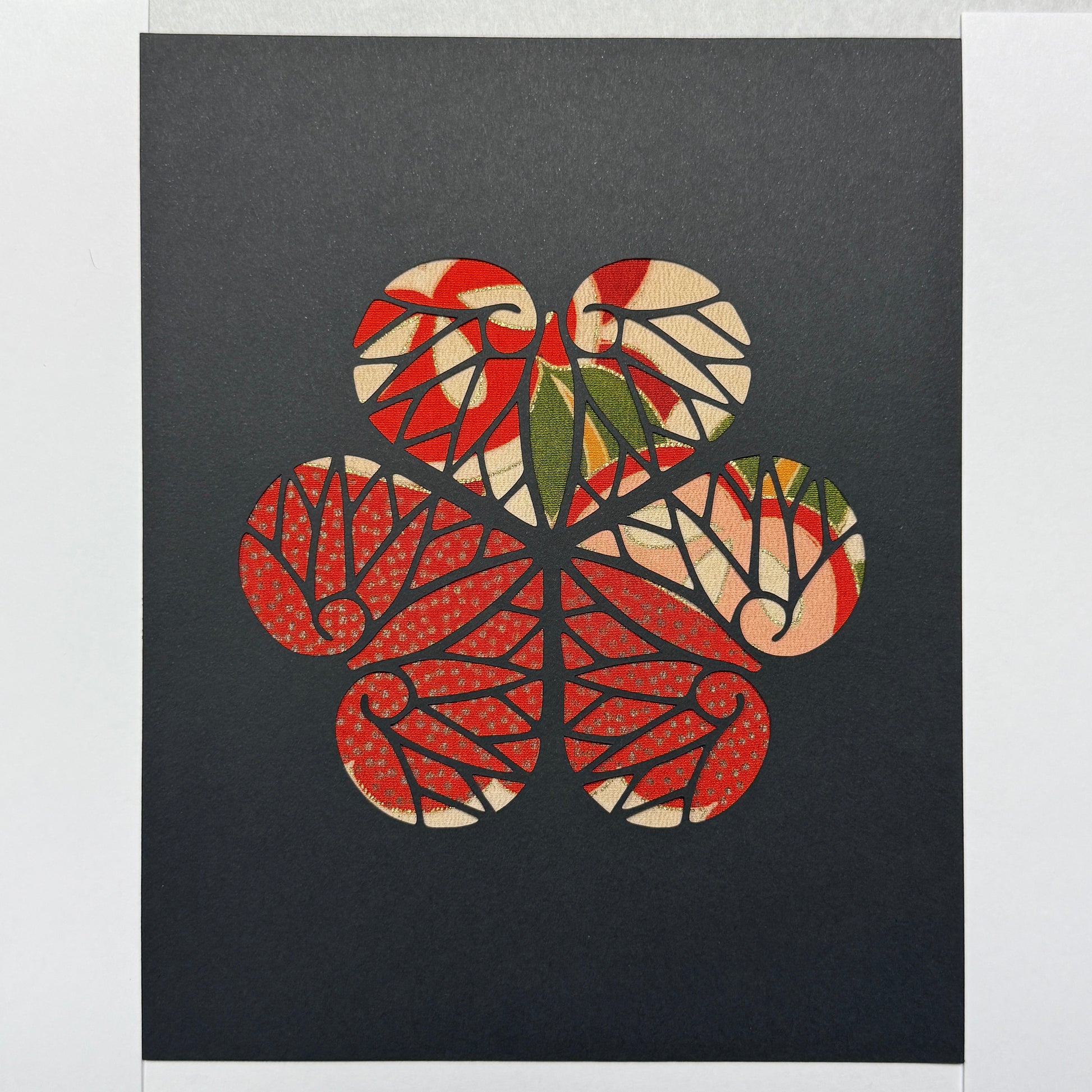 Photos show examples of how a carefully chosen piece of kimono fabric placed behind the crest adds depth, texture, and cultural resonance, allowing the colors and patterns of the textile to animate the design and transform into a layered work of art.