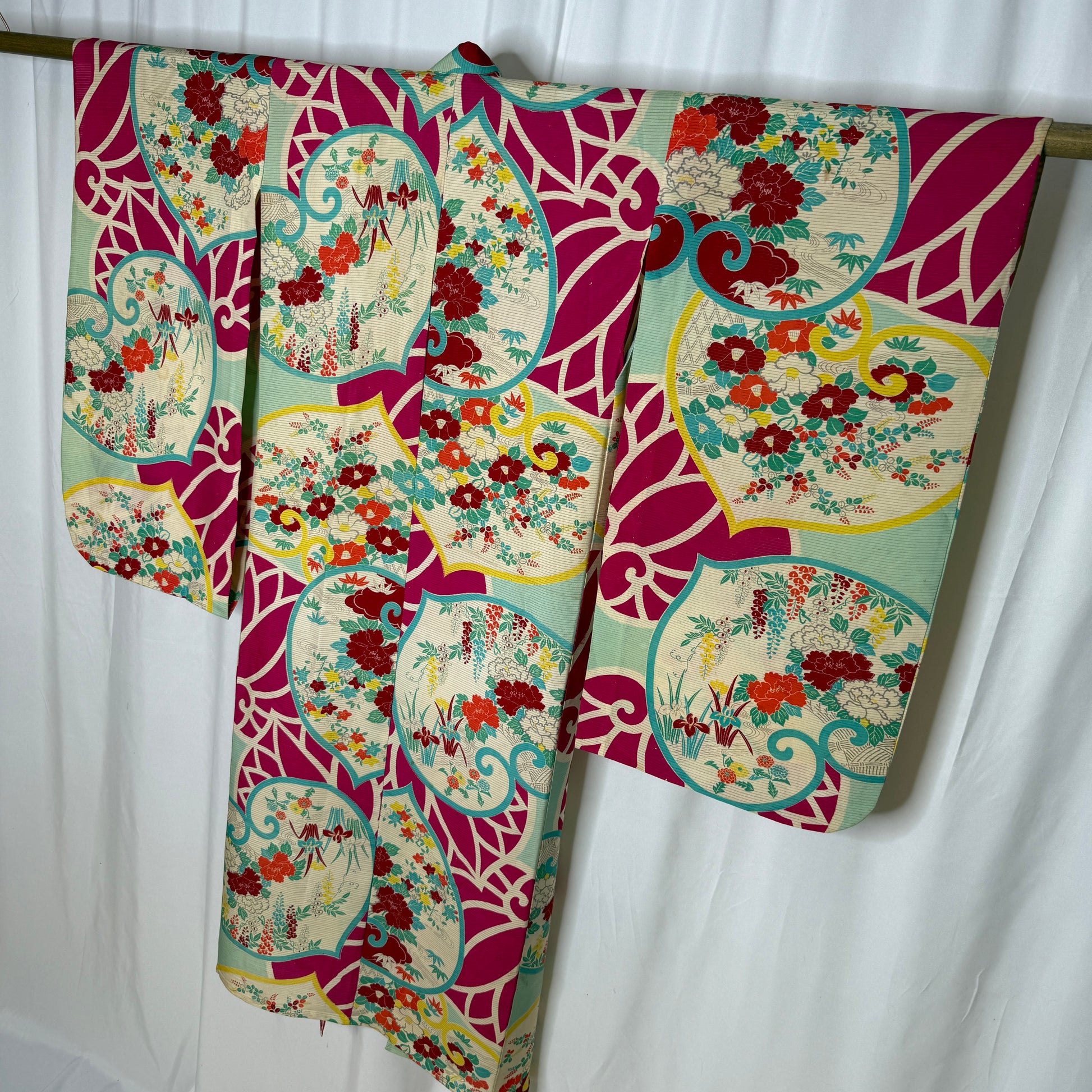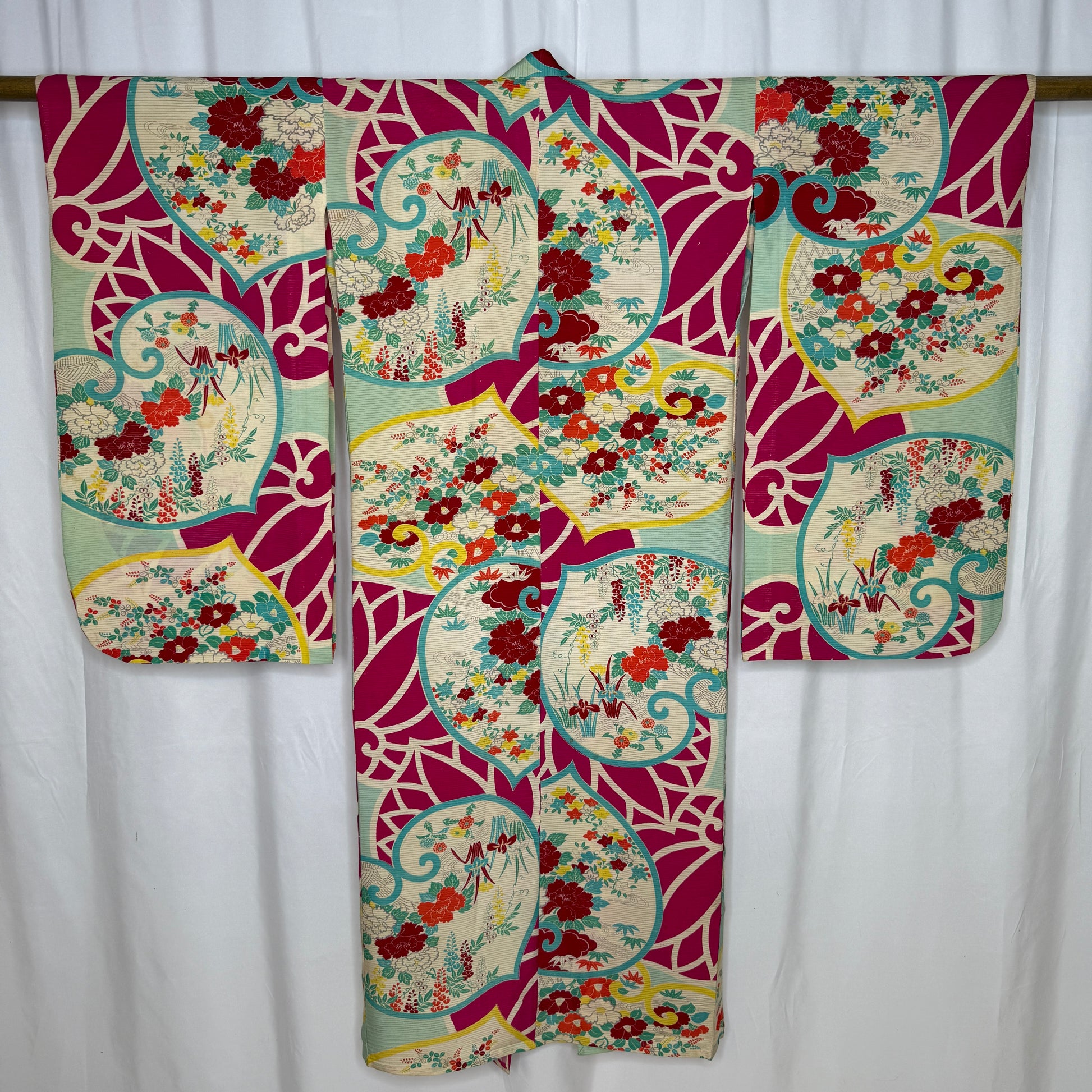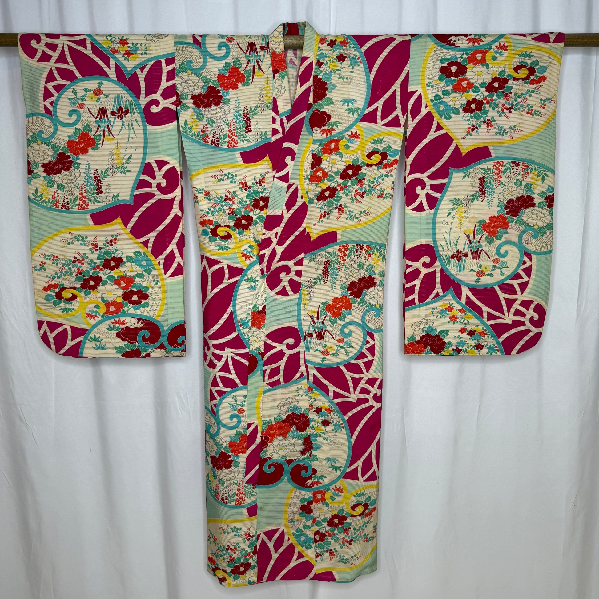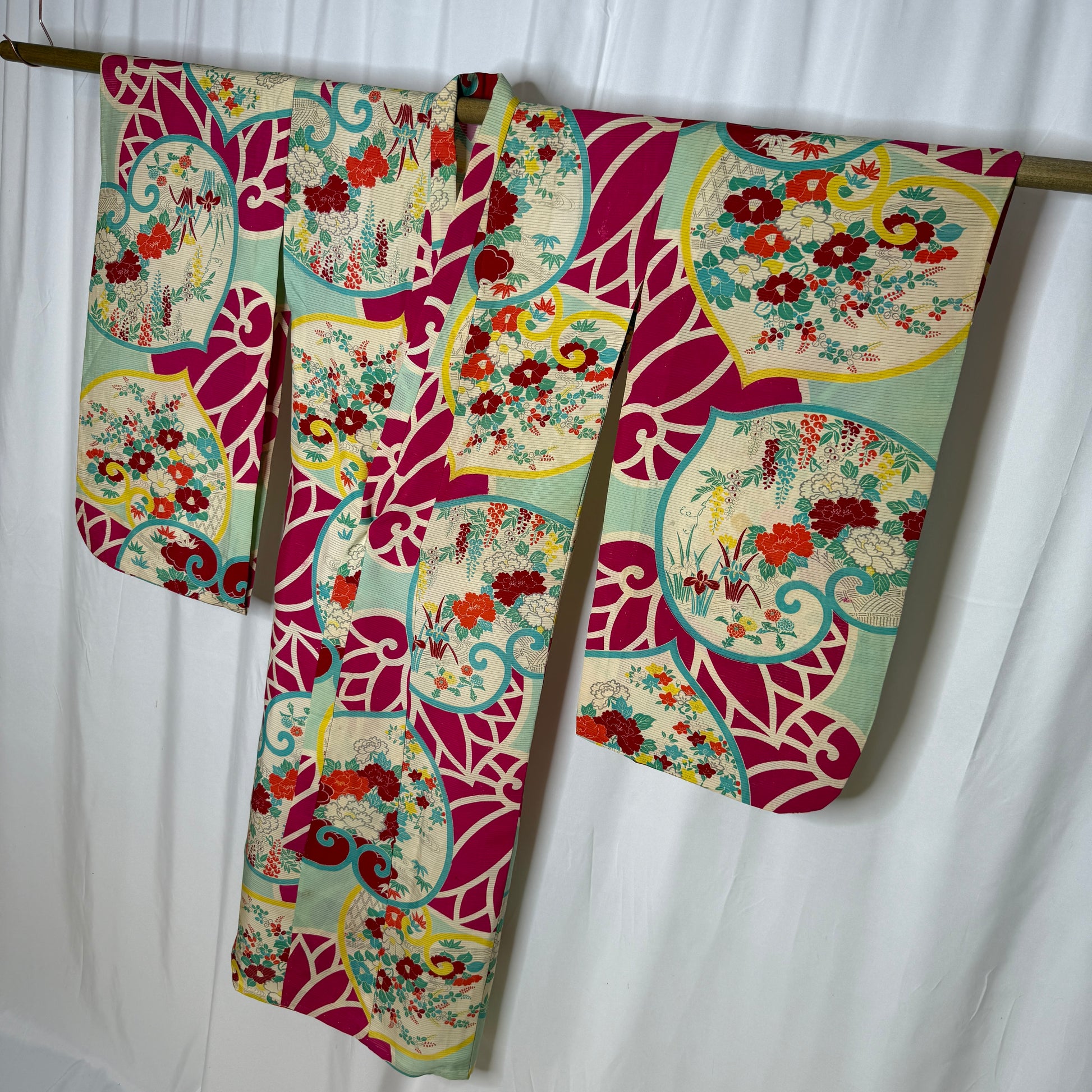 Vintage Japanese children's kimono make eye-catching displays in spaces too small to accommodate a full-sized kimono. We offer display rods (click the tab below) if you're going to display this kimono.