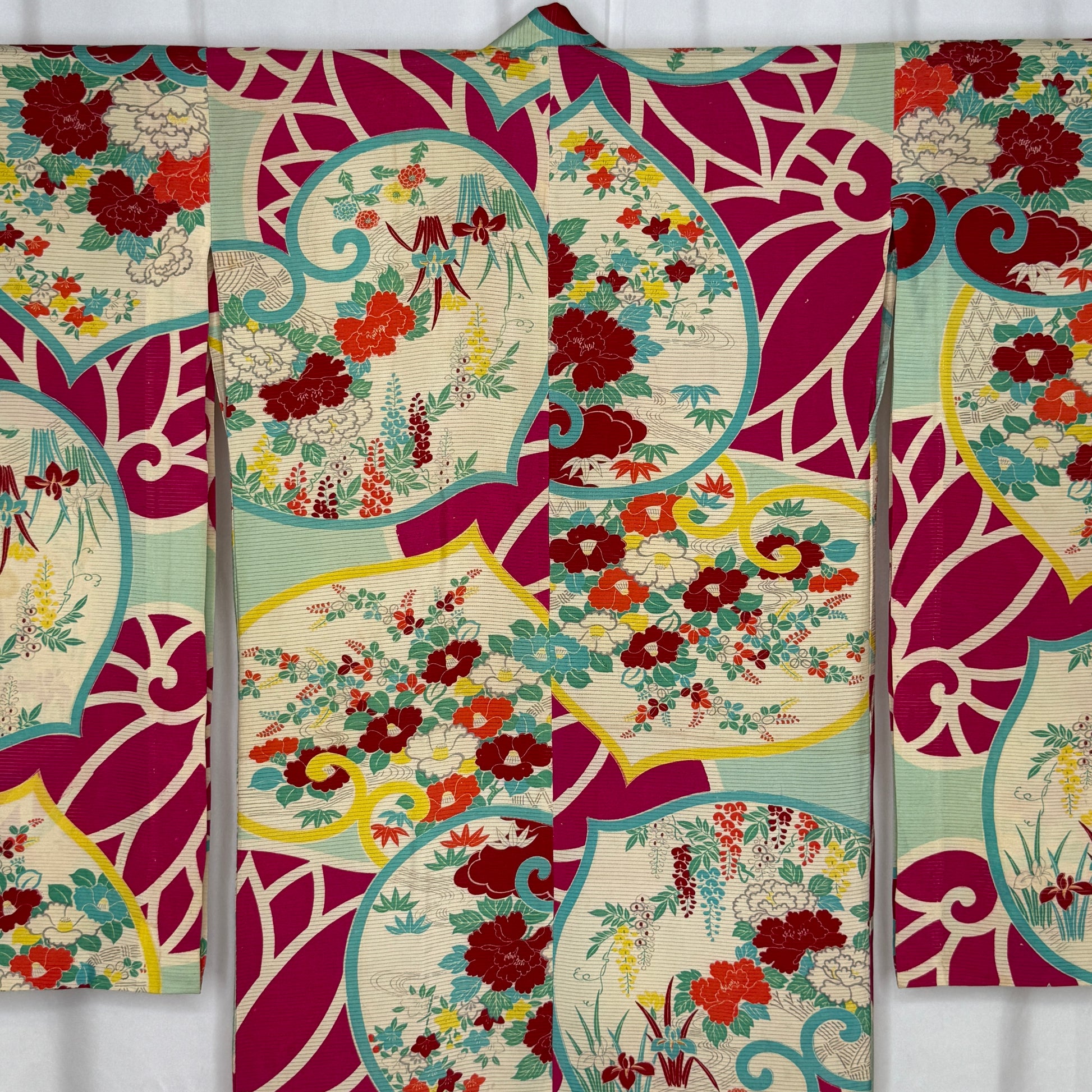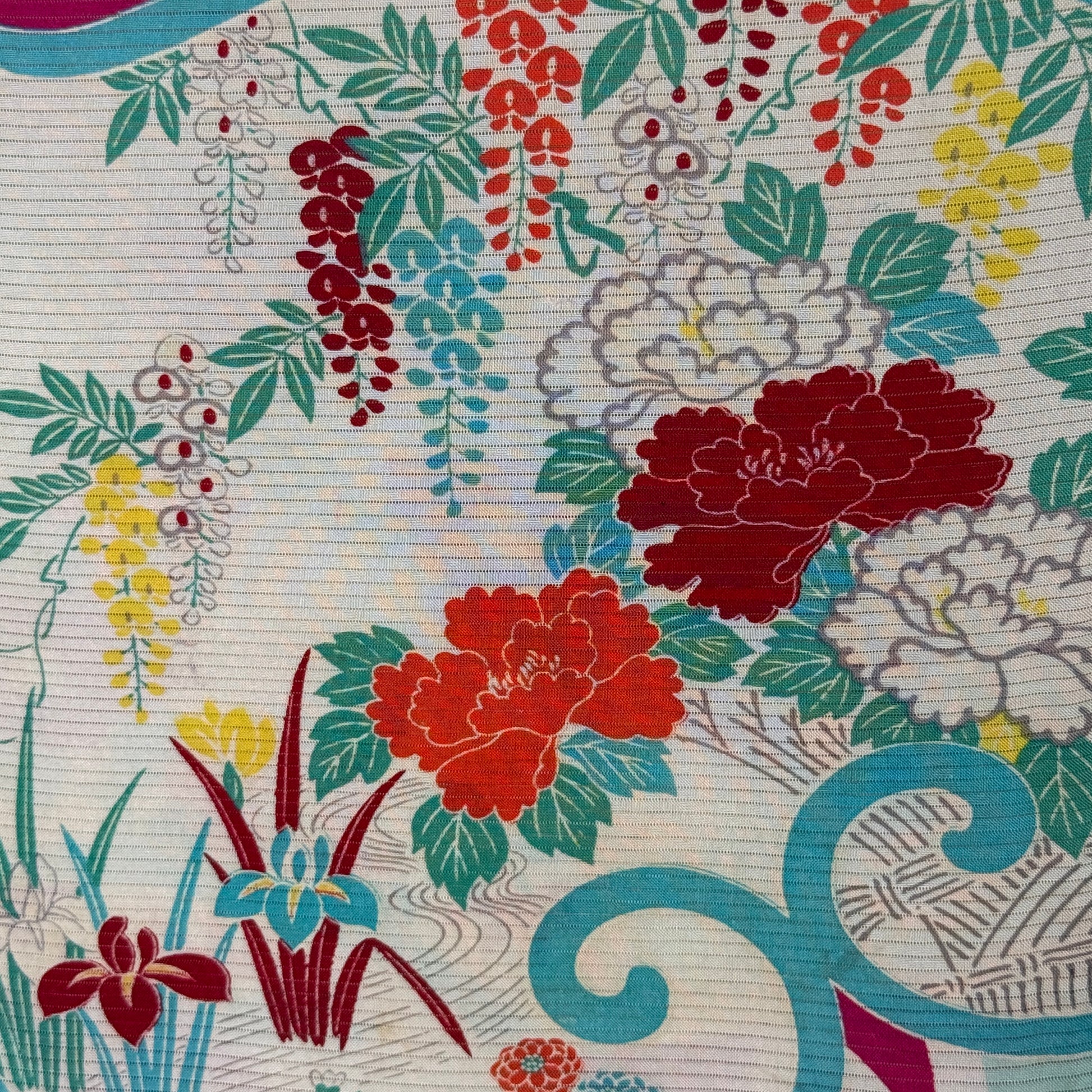 This lively silk kimono celebrates abundance with oversized hollyhock leaves that frame vibrant floral vignettes. Within each hollyhock, a garden bursts forth: flowing wisteria, grand peonies, bright irises, and more! The bold contrast of fuchsia and teal against the cream leaves creates a rhythm with a festive feel.