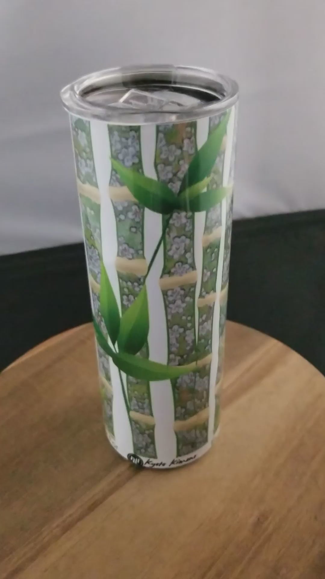 This Japanique Tumbler features a continuous pattern of bamboo stalks, each filled with a green and white Springtime floral pattern - an image taken from a casual vintage woman's kimono.