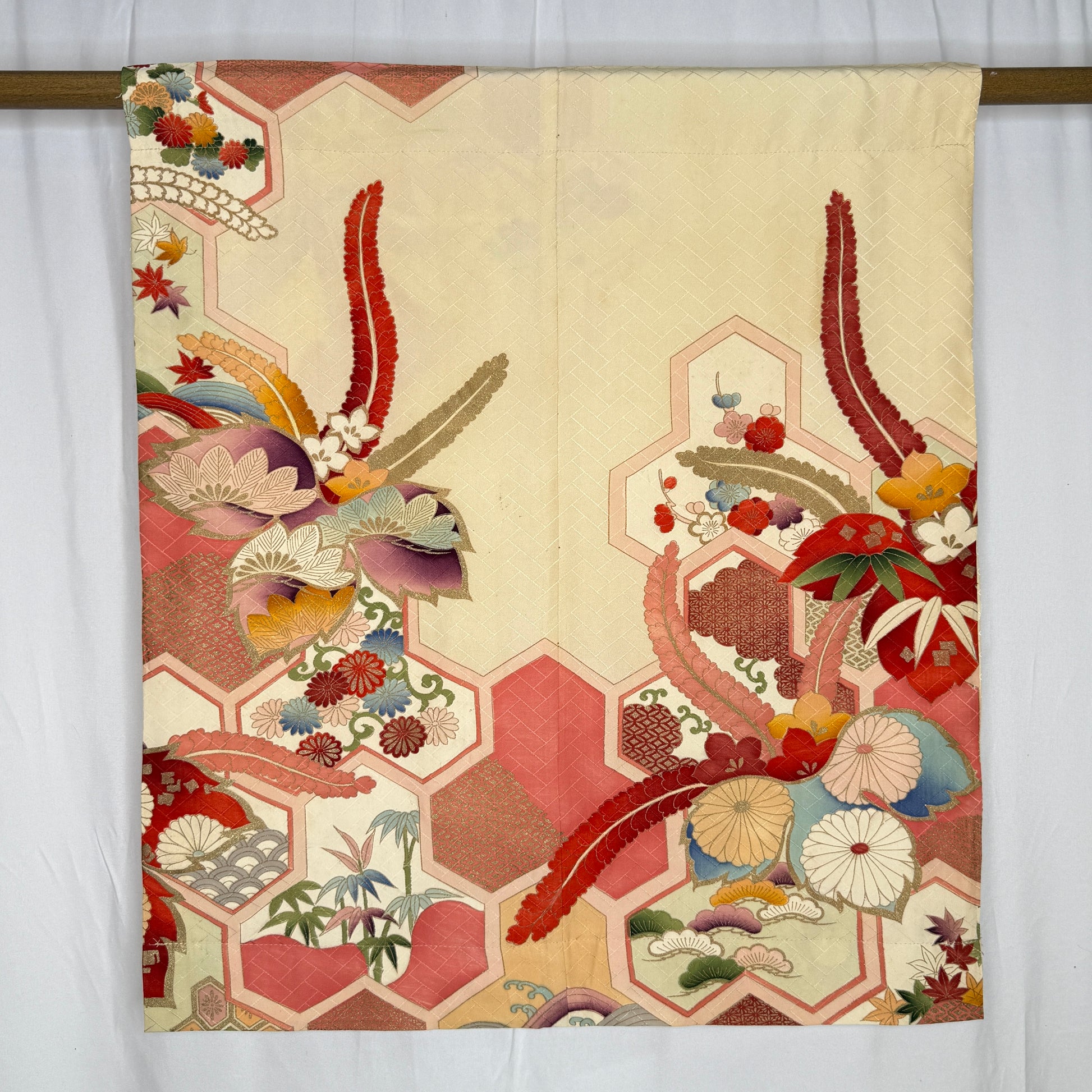 We create these tapestries by salvaging a portion of a kimono when other sections of the garment are beyond repair or rescue. This listing is for a wall hanging tapestry made from a woman's kimono.