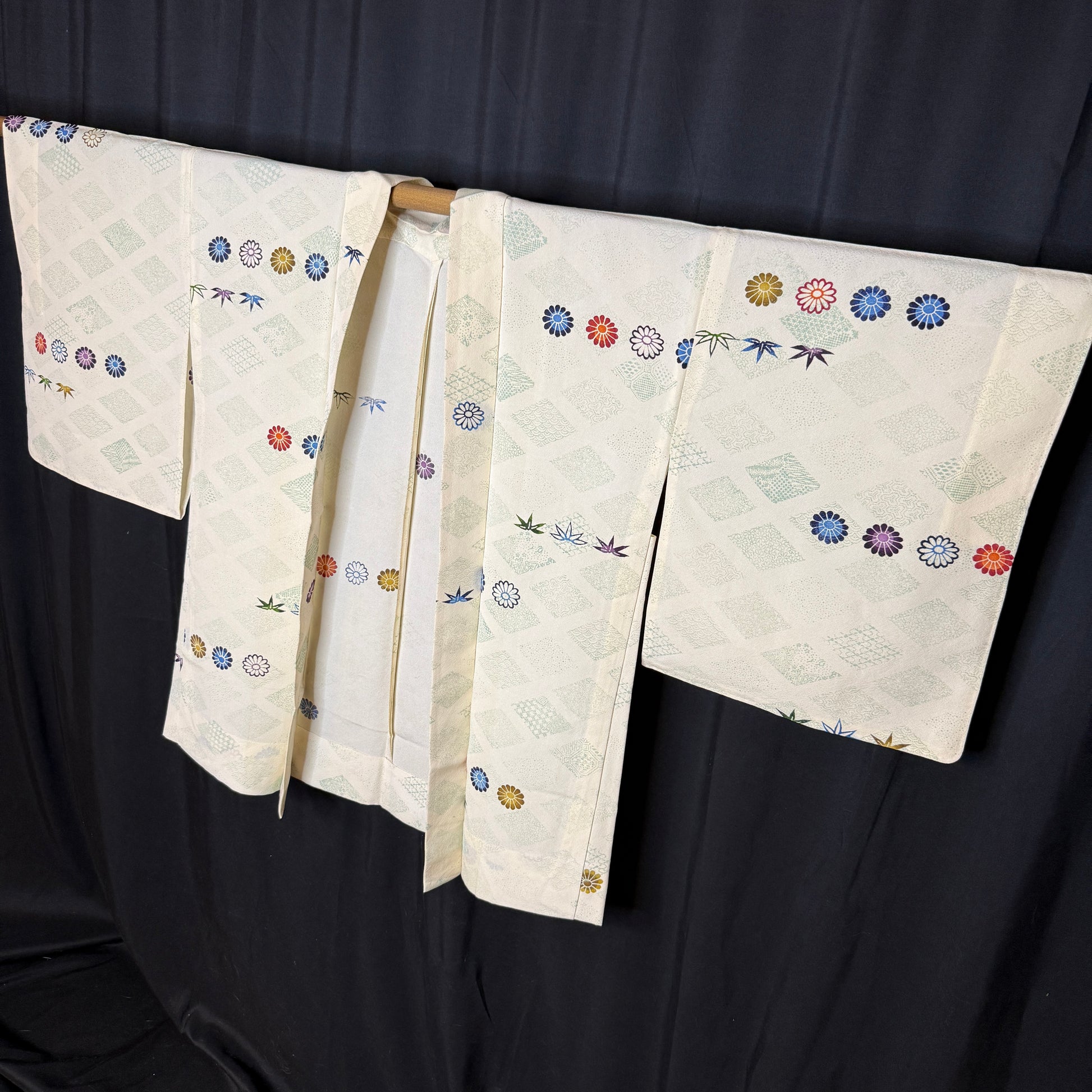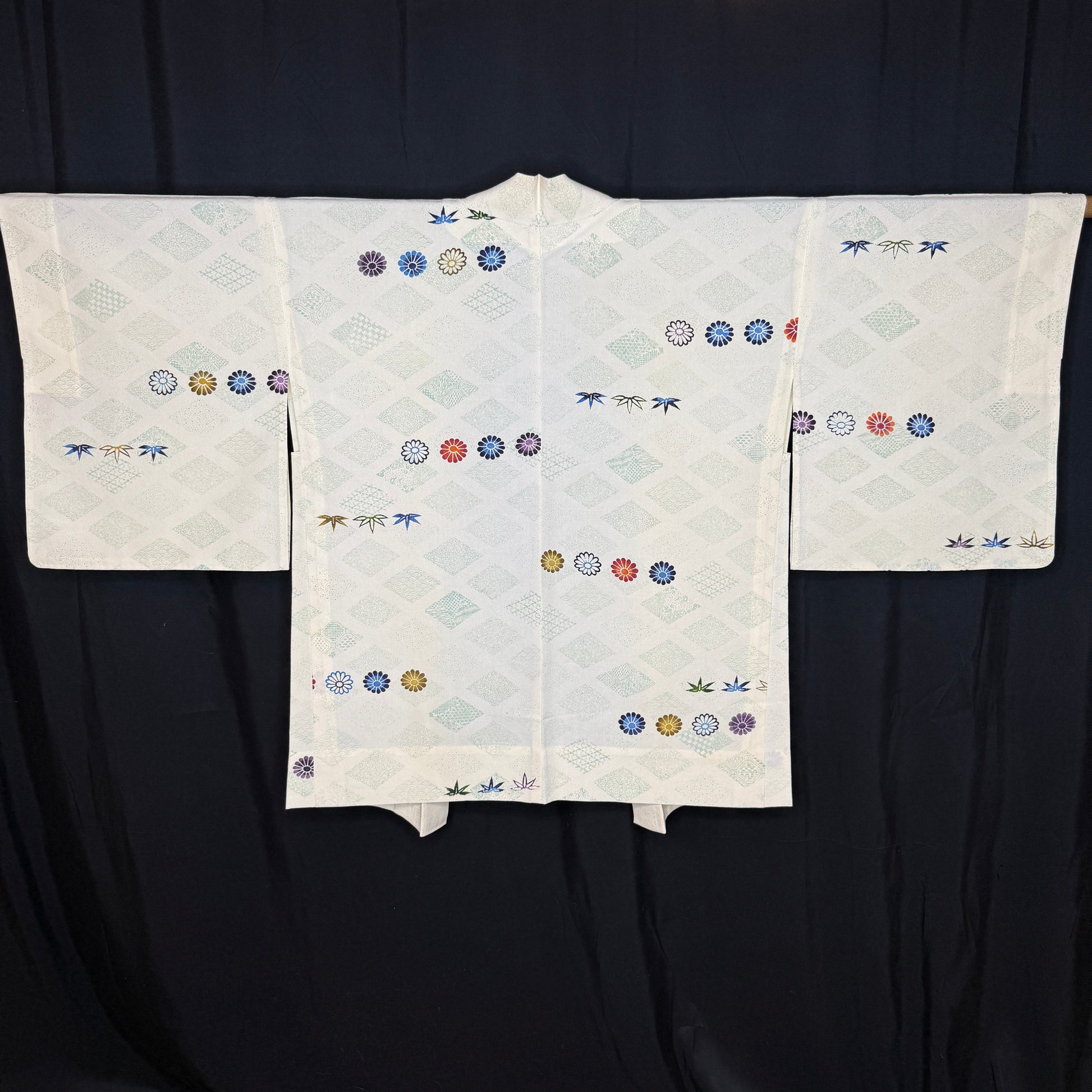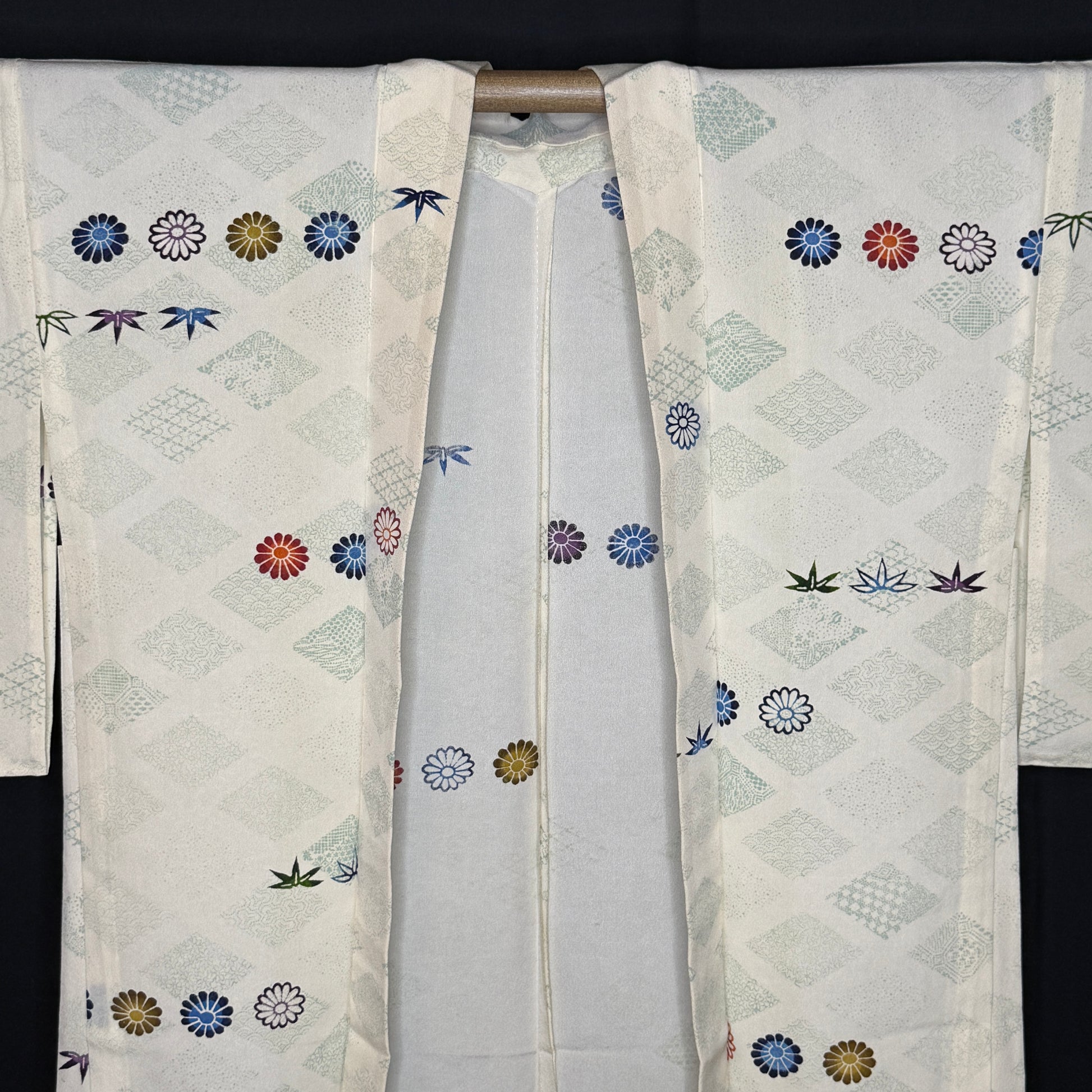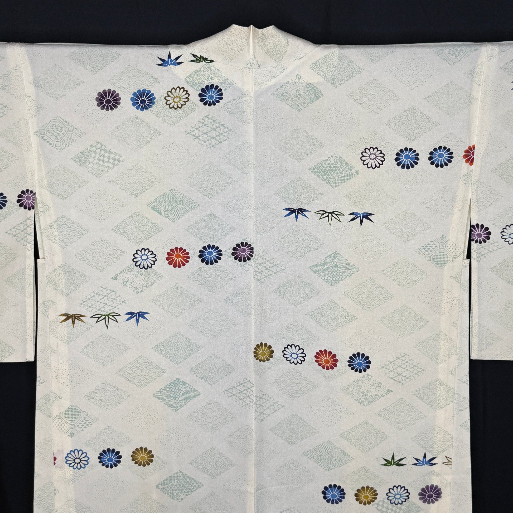 This beautiful woman's haori jacket is full of auspicious motifs. The background features small traditional patterns delicately stenciled in a light green on cream. In contrast, rows of chrysanthemums (kiku) and bamboo leaves (take) are stenciled in rich jewel tones to add a splash of color. Together these motifs symbolize strength, renewal, and enduring beauty.