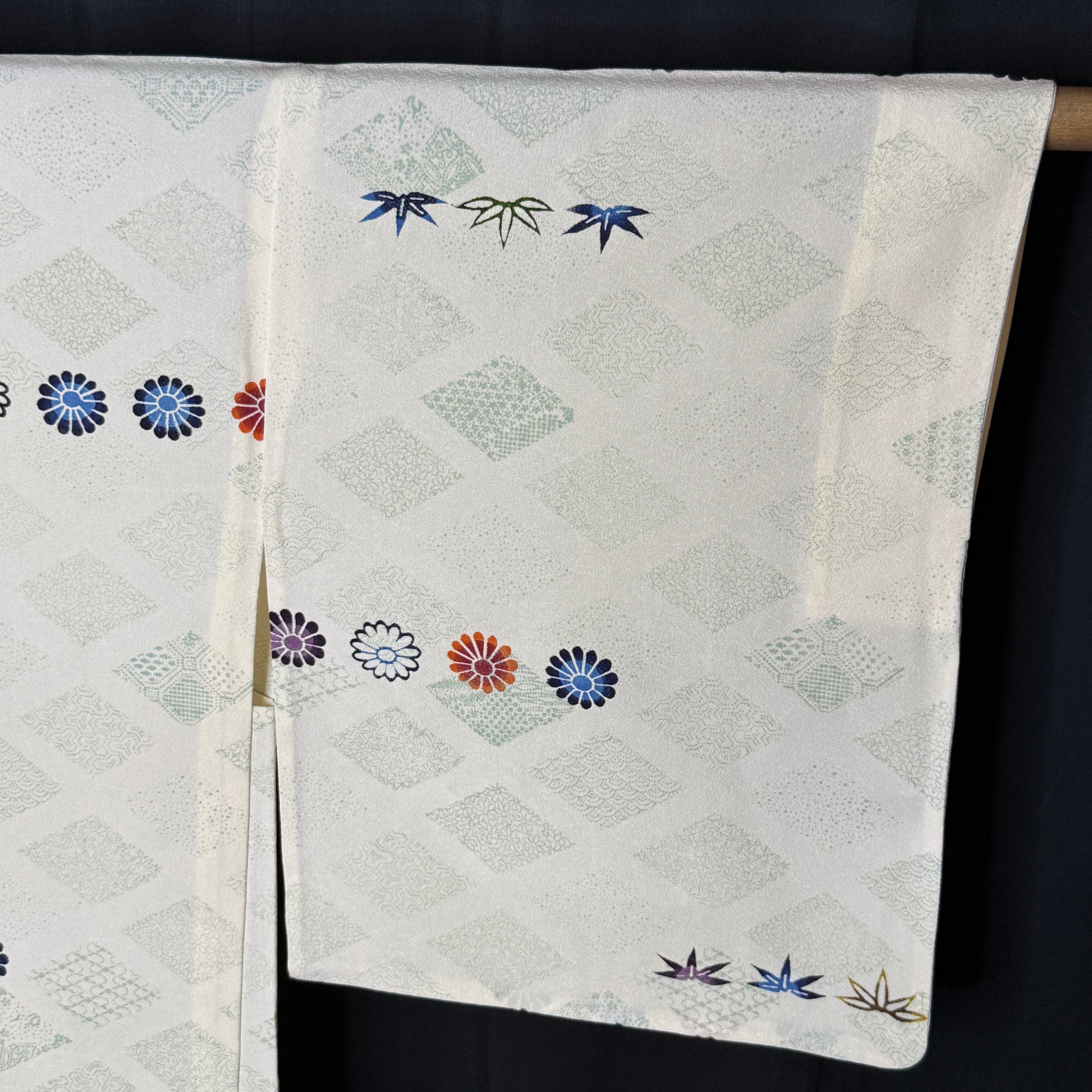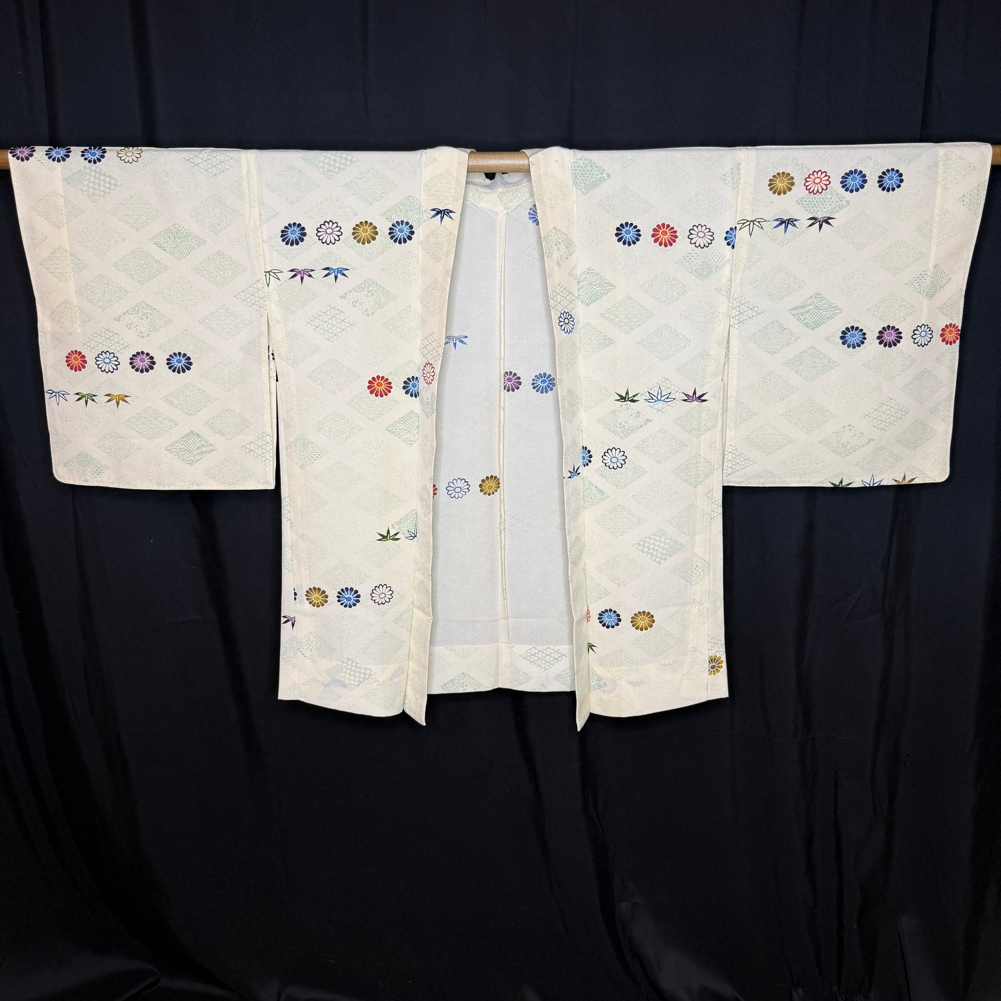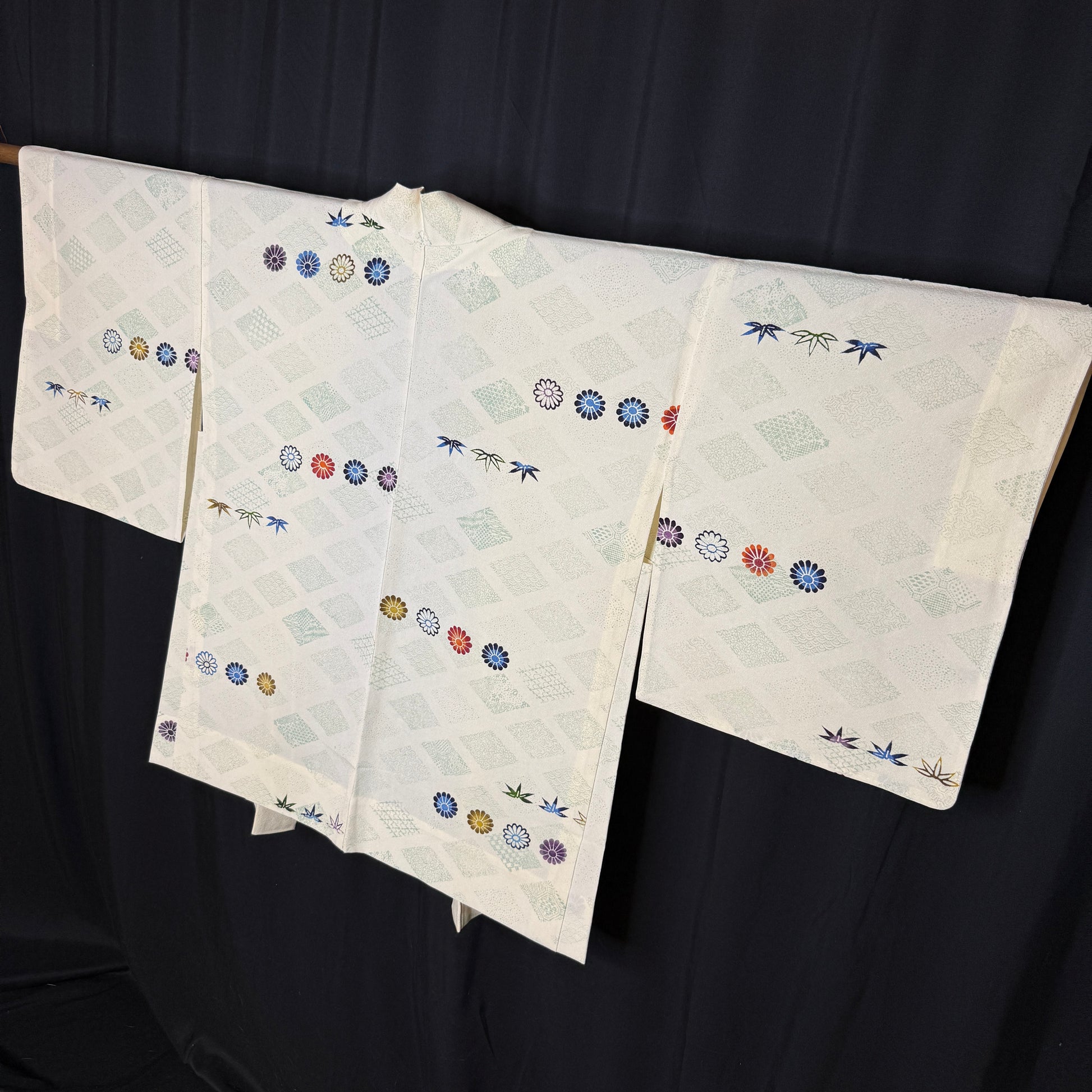 This beautiful woman's haori jacket is full of auspicious motifs. The background features small traditional patterns delicately stenciled in a light green on cream. In contrast, rows of chrysanthemums (kiku) and bamboo leaves (take) are stenciled in rich jewel tones to add a splash of color. Together these motifs symbolize strength, renewal, and enduring beauty.