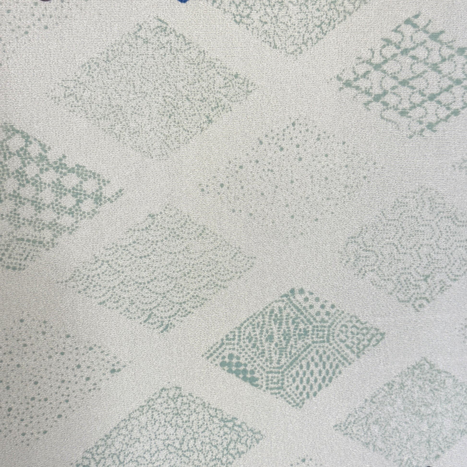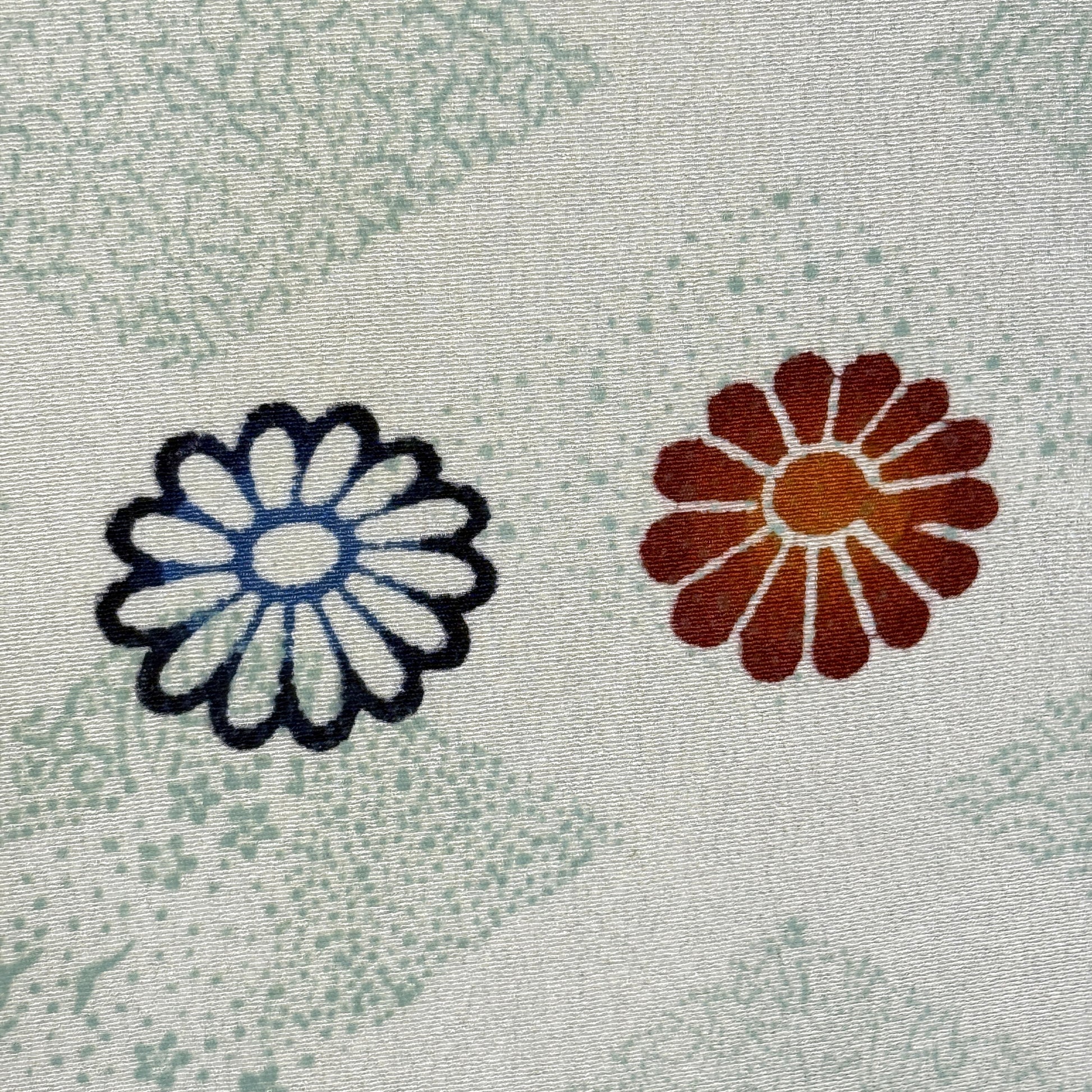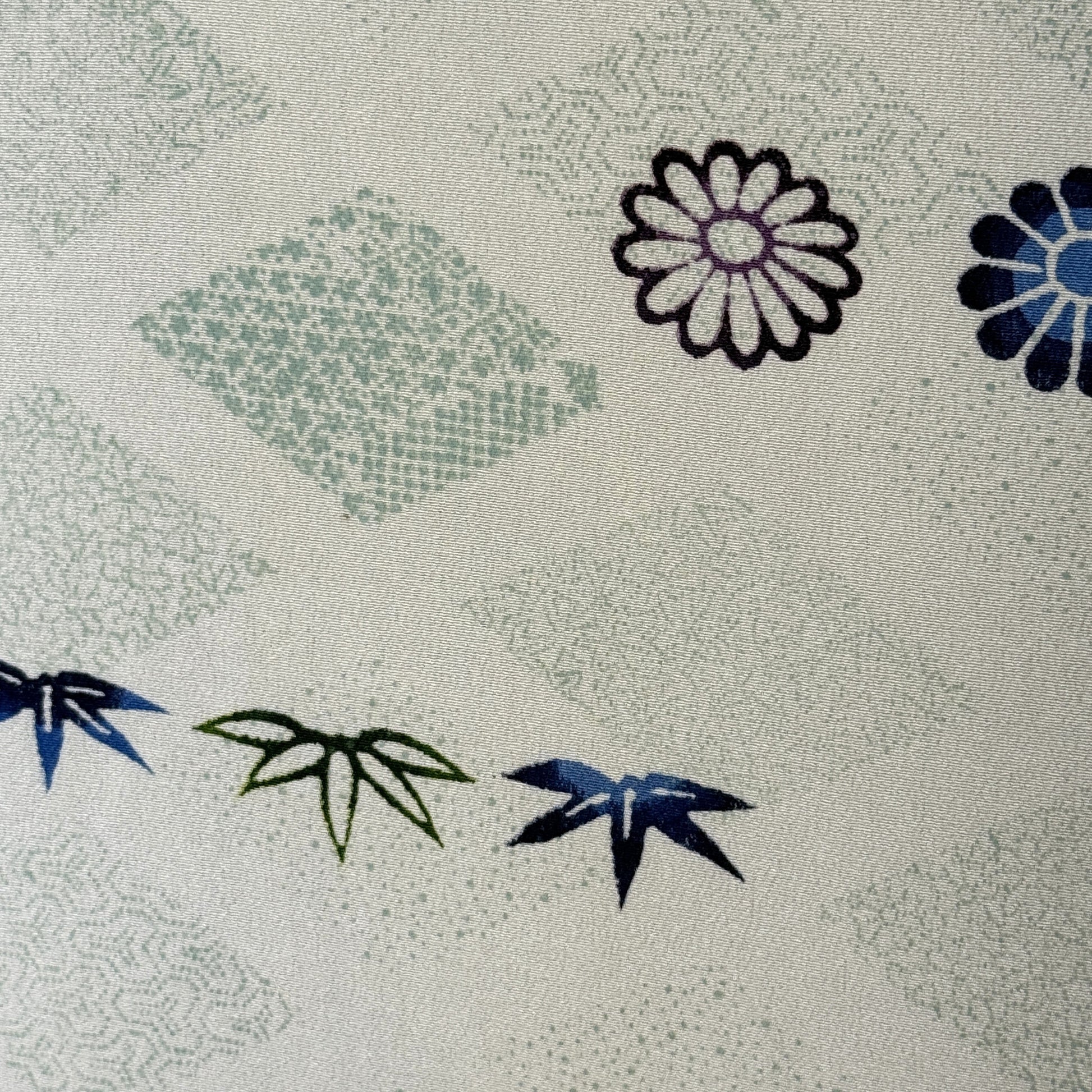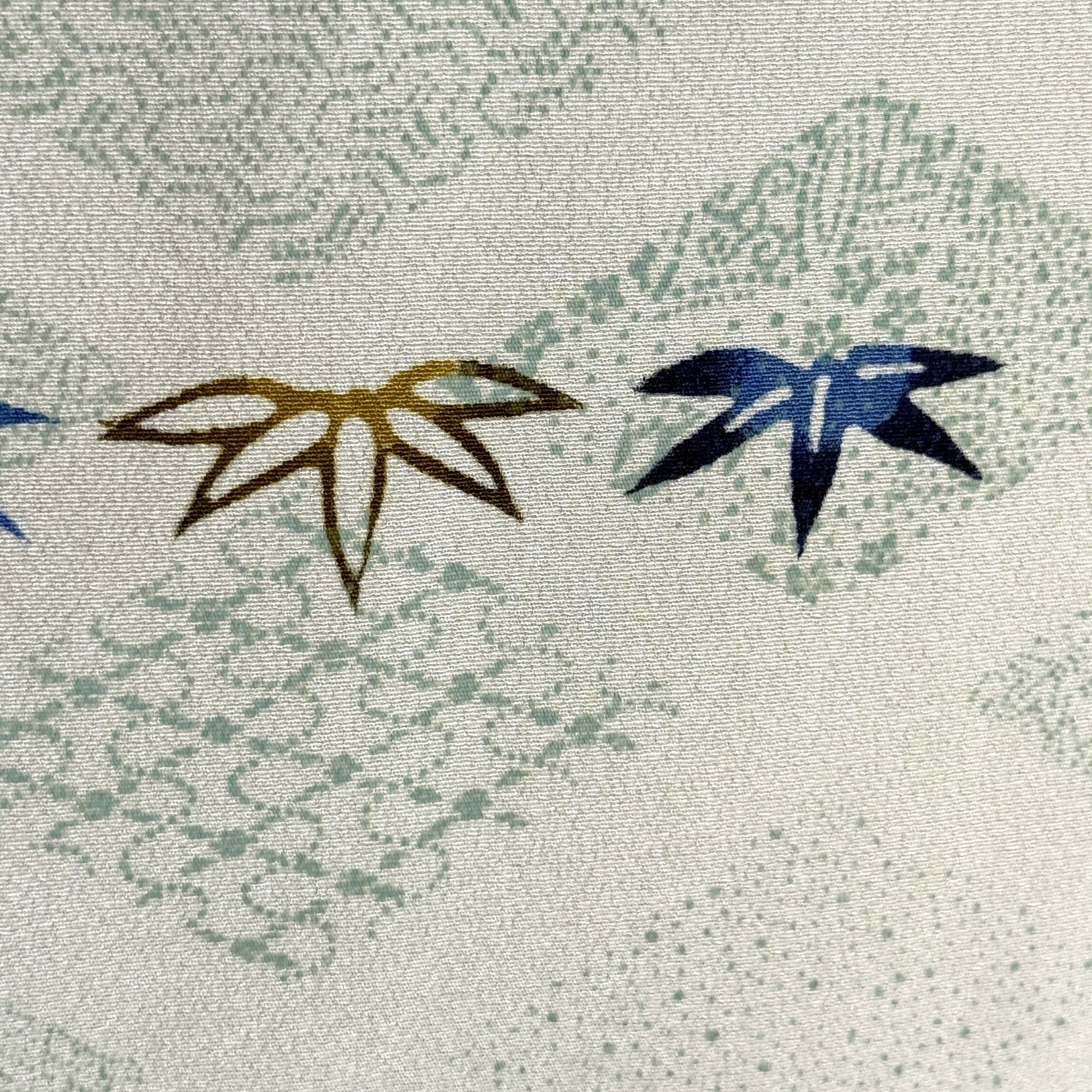 This beautiful woman's haori jacket is full of auspicious motifs. The background features small traditional patterns delicately stenciled in a light green on cream. In contrast, rows of chrysanthemums (kiku) and bamboo leaves (take) are stenciled in rich jewel tones to add a splash of color. Together these motifs symbolize strength, renewal, and enduring beauty.
