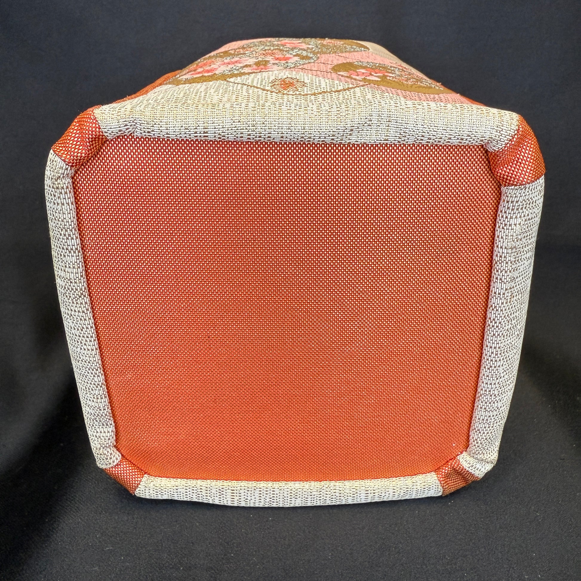The brocade fabric glows in soft coral, ivory, and gold, with each shell adorned in delicate blossoms representing joy and renewal. A vivid red drawstring cord adds a bright traditional accent, while the square bottom ensures the bag keeps its form.