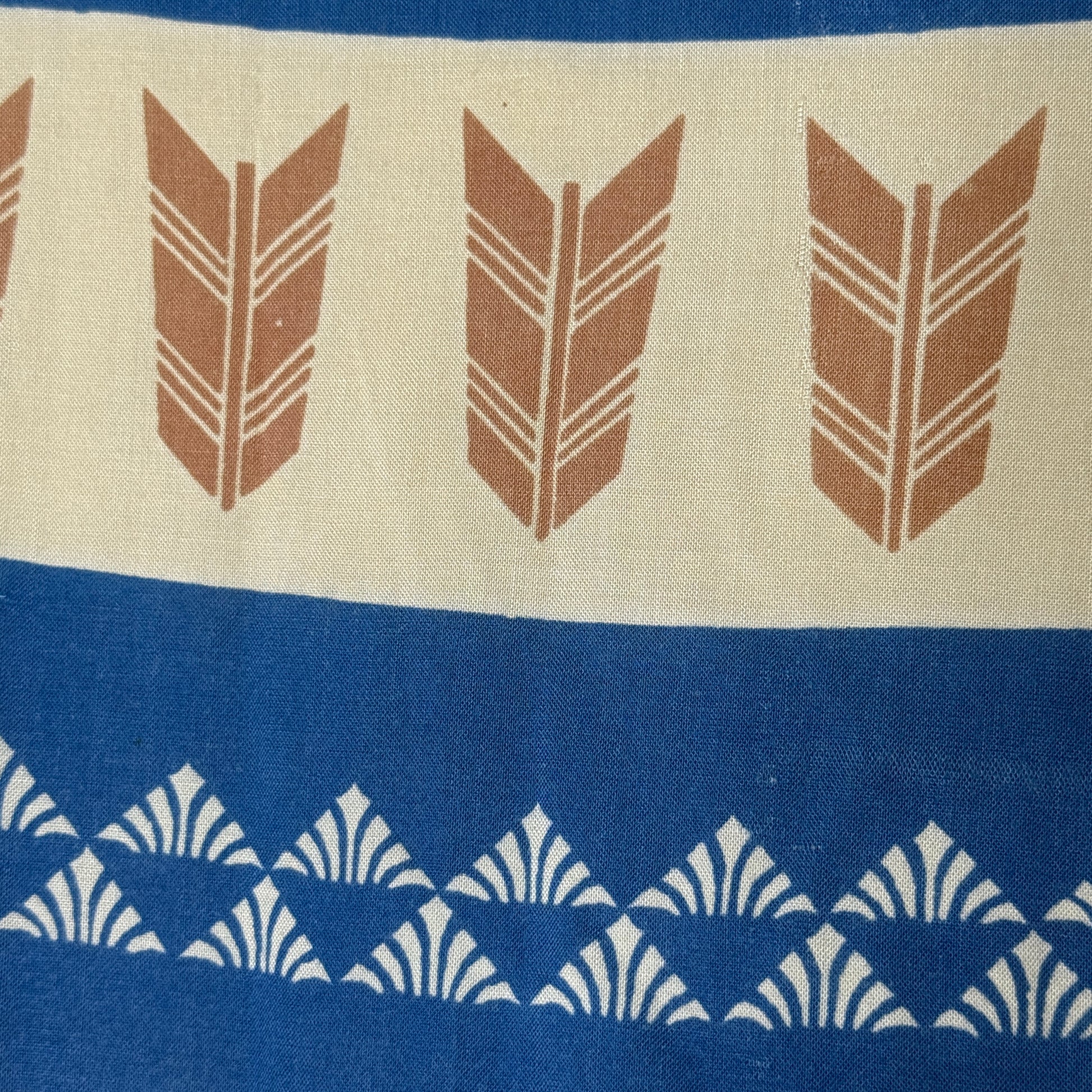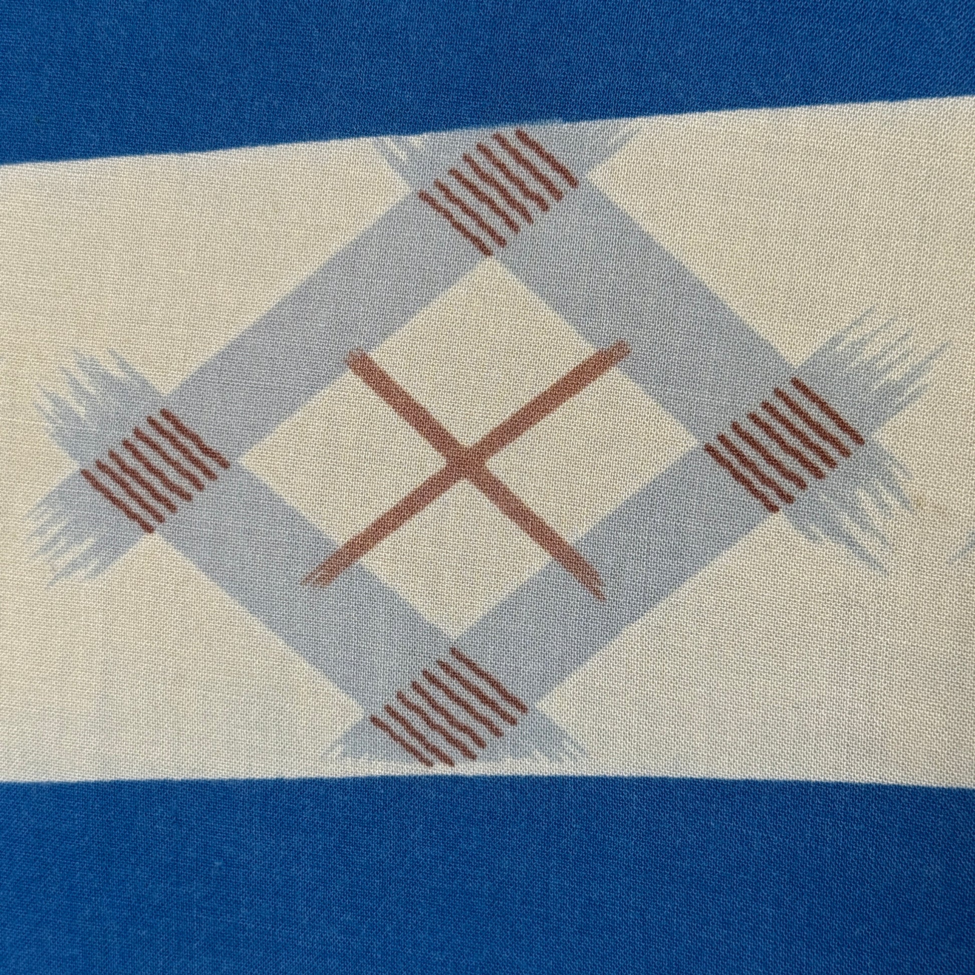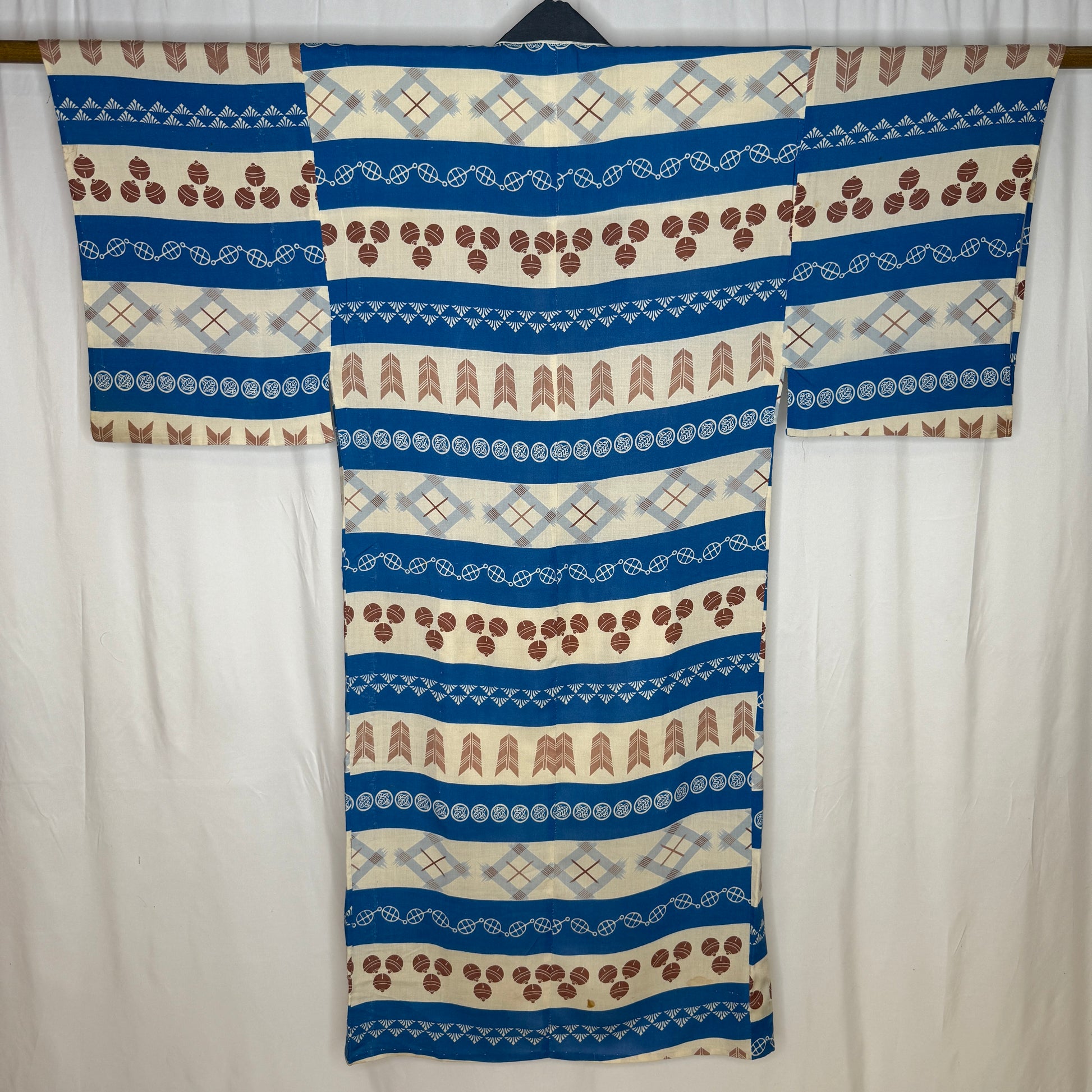 This vintage men's underkimono hums with rhythmic charm, featuring sky blue and cream stripes adorned with lucky bells and arrow feathers. The bells, symbols of good fortune and festivity, alternate with stylized ya-no-hane (arrow fletching) that represent courage and direction. The design captures the energy of motion and sound of festival music woven into cloth. Lightweight cotton with no lining.